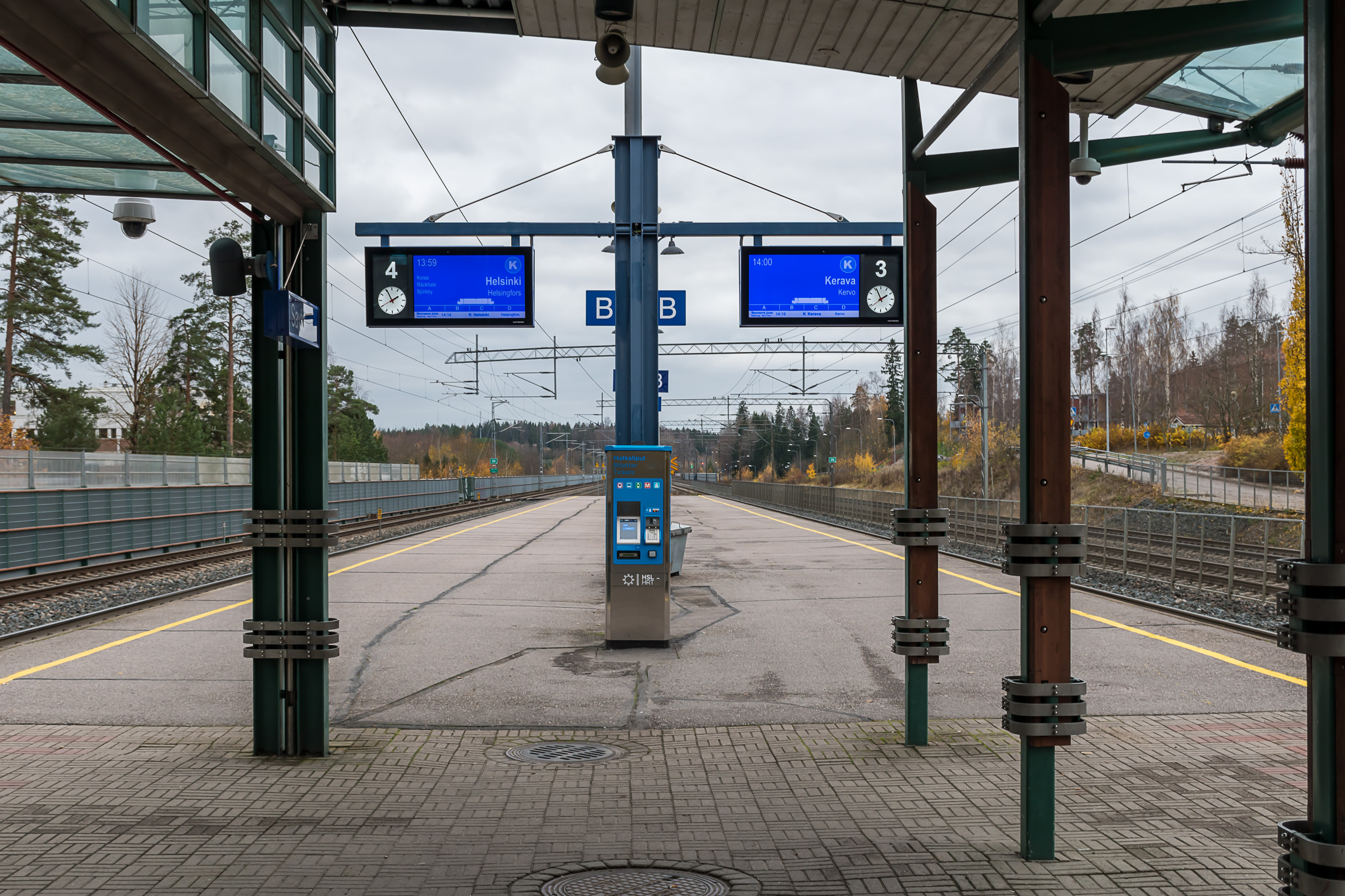 1. Электричка маршрута K (Хельсинки-Керава) довезла нас из центра Хельсинки в Кераву за 34 минуты — существенно дольше, чем было бы на электричках R или Z (21-22 мин). K-электрички — ближние, "городские", и останавливаются на всех станциях (коих между Хельсинки и Керавой 13), а R- и Z-электрички — дальние, "пригородные", и до Керавы останавливаются только в Пасиле и Тиккуриле. Правда, K-электрички ходят часто, в часы пик с интервалами всего 10 мин; у R-электричек интервал 30 мин, а у Z — 60 мин. Это возможно, потому что между Хельсинки и Керавой Главный ж/д ход имеет 4 пути, из которых два выделены для городских электричек (маршрутов K и I/P), а два других используются дальними электричками (маршруты R, T, D, Z) и поездами дальнего следования. 3-й и 4-й пути также известны как Керавская городская ж/д (Keravan kaupunkirata); строились они не сразу, а постепенно между 1972 и 2004 году.