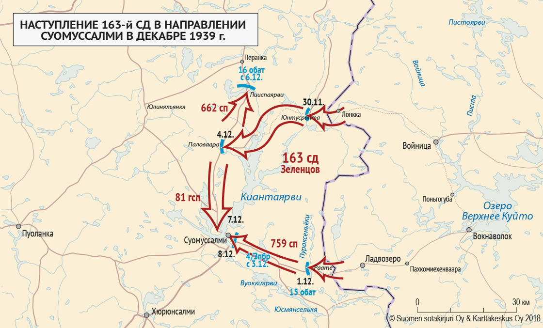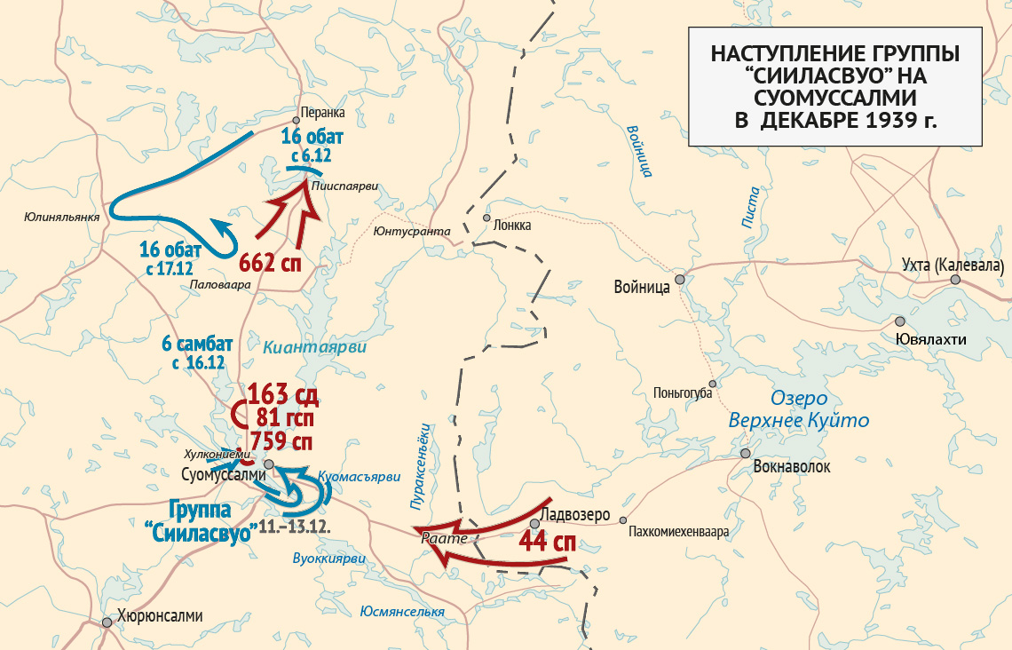 Следующие четыре карты этапов сражений под Суомуссалми взяты со страницы https://www.talvisota.fi/ru/военные-действия/pohjois-suomen-ryhma/suomussalmen-taistelut-1939/, изначально сделаны для издания Sotatoimet – Suomen sotien 1939−45 kulku kartoin (Ari Raunio, Karttakeskus, 2013) — атласа карт финских сражений в 1939-1945. Надеюсь, уважаемые авторы сайта на меня не в обиде. Я сам не великий иллюстратор, без карт было бы совсем непонятно, а мой труд некоммерческий.