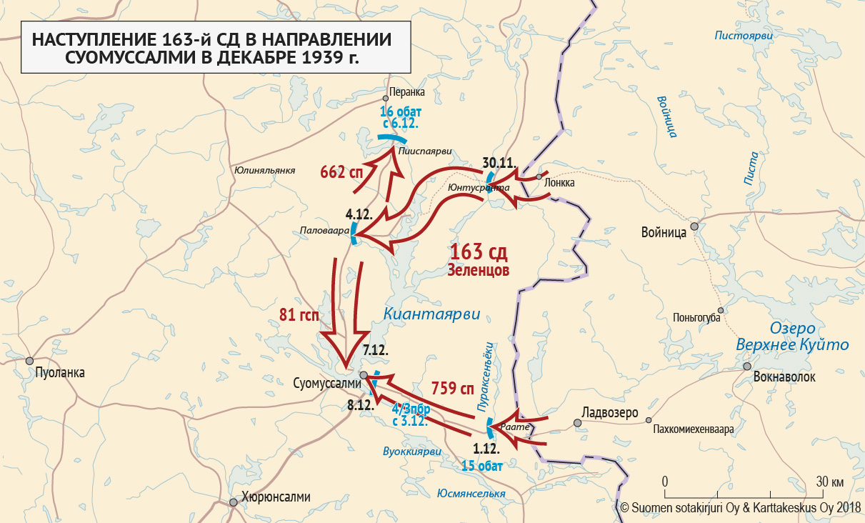 Для наступления на Суомуссалми была выдвинута 163-я стрелковая дивизия, с около 13 тыс. бойцов. Помимо пехоты, в ней были кое-какие танки и довольно много легкой артиллерии. Дивизия должна была одновременно наступать через Раате и Юнтусранту, взяв Суомуссалми таким образом в клещи. Наступление началось немедленно с началом войны 30.11; пограничники заставы Карттимо услышали первые выстрелы буквально одновременно с объявлением по радио о разрыве дипломатических отношений с СССР. Это направление, через Лонкка — заставу Карттимо — Юнтусранту, было основным, и большая часть дивизии наступала именно здесь, с численным перевесом 100 к 1 над пограничниками. Конечно, пограничники немедленно отступили. За несколько часов войска дошли до Юнтусранты и взяли ее. Дальше от Юнтусранты дороги в нужную сторону не было, но за несколько дней советские войска сумели обойти озеро Киантаярви лесом и выйти на дорогу Суомуссалми-Куусамо, подавив яростное, но незначительное финское сопротивление. Там они повернули на юг, и так же довольно легко к 8.12 достигли села Суомуссалми, но обнаружили, что оно сожжено и брошено финнами. На южном направлении, через Раате, финны сумали задержать советские силы на несколько дней на линии Пурасйоки, но отступили и оттуда, и южная группа должна до Суомуссалми почти одновременно с северной.
