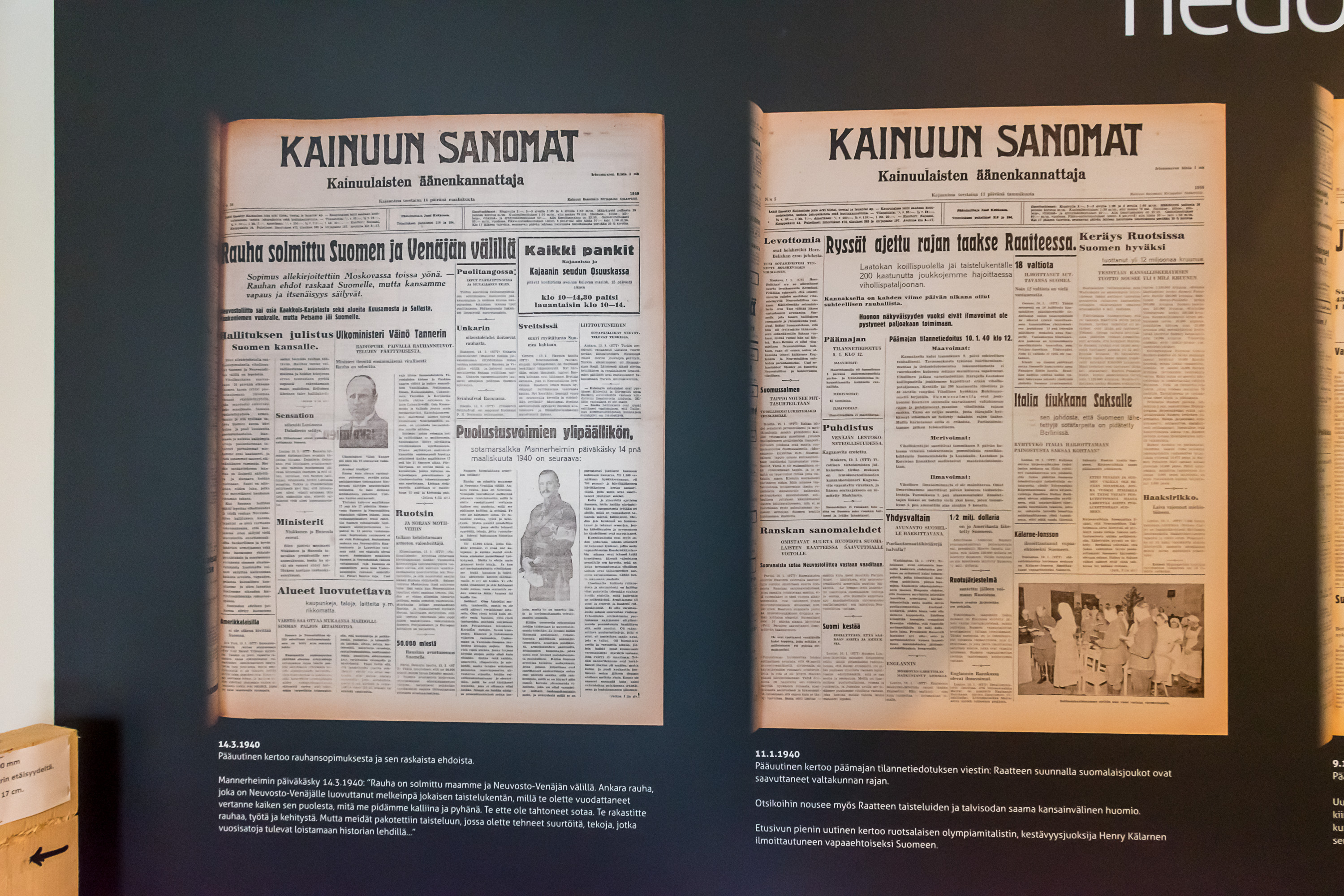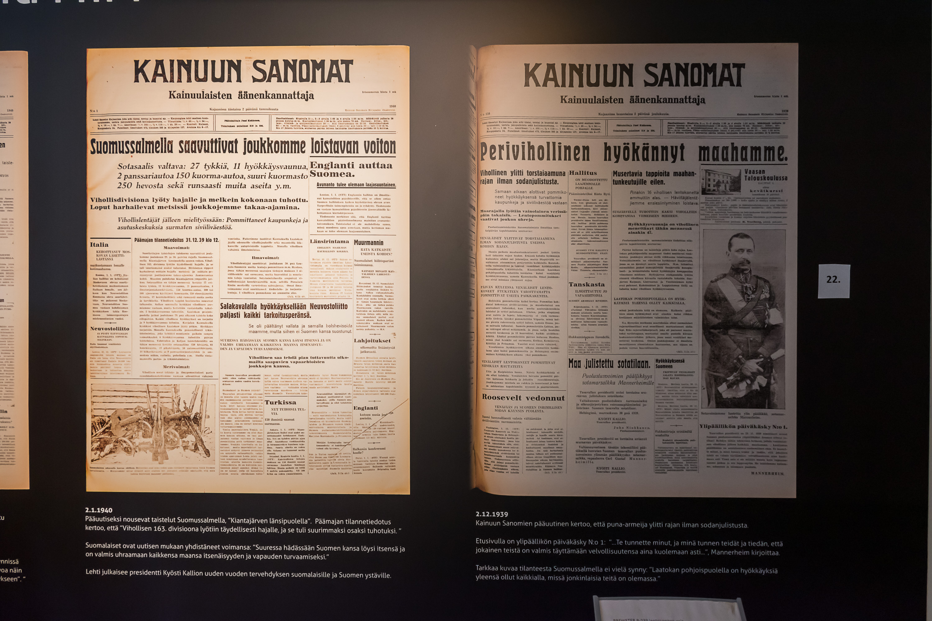 24. Региональная газета, "Кайнуун-Саномат" (Kainuun Sanomat, фин. Известия Кайнуу). Справа, 2.12.1939: "Заклятый враг напал на нашу страну"; также ежедневный приказ № 1, о назначении маршала Маннергейма главнокомандующим. Слева, 2.1.1940: "Под Суомуссалми наши войска одержали блестящую победу" — это о советской 163-й дивизии, изгнанной наконец-то из сожженного Суомуссалми.