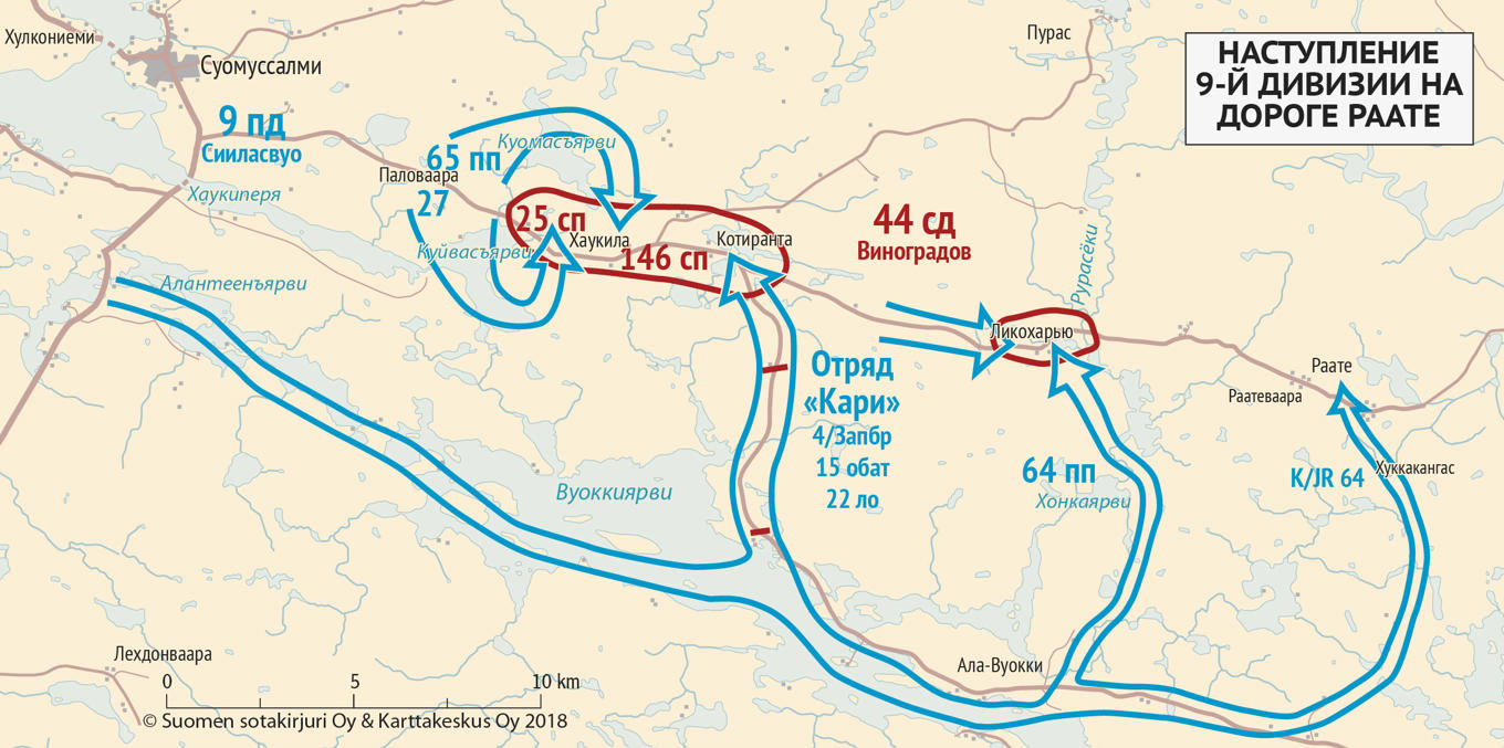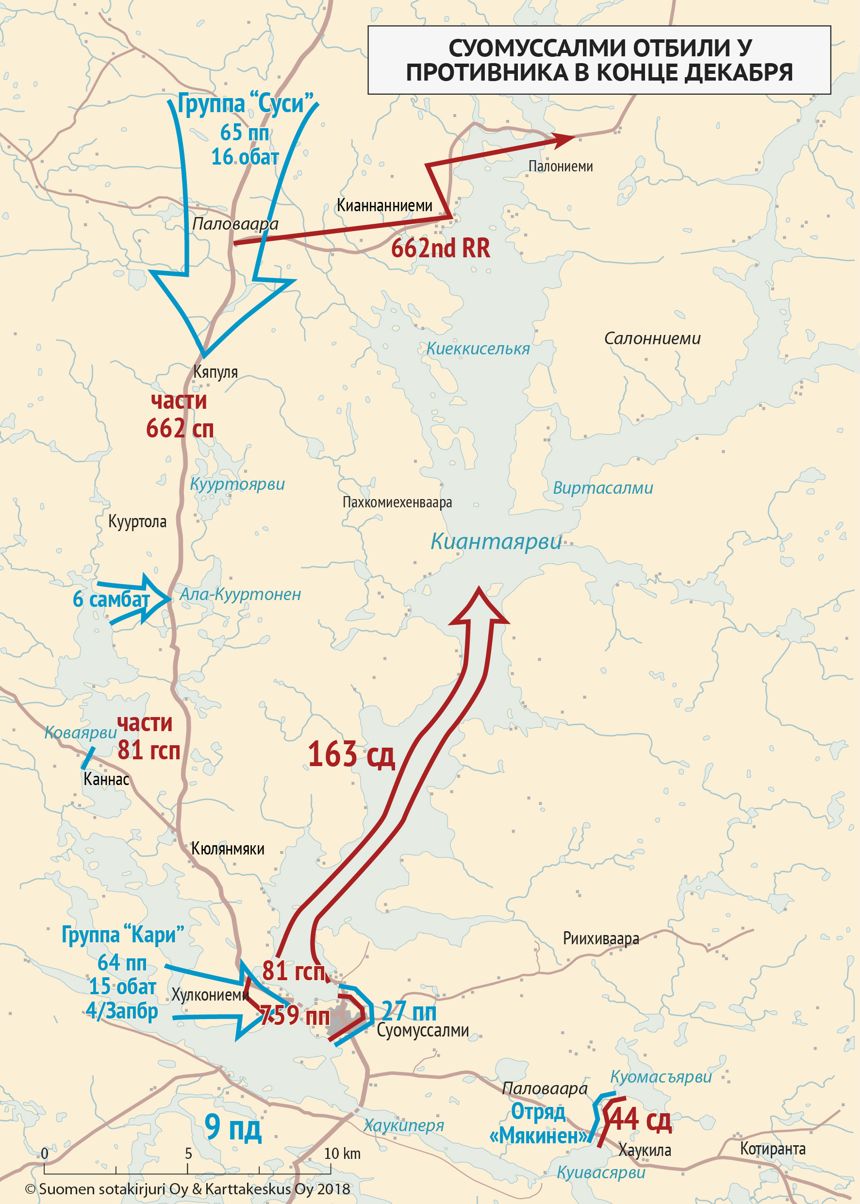 Фннны контратаковали, и хотя, несмотря на ожесточенные бои, захватить Суомуссалми обратно они не могли несколько недель, зато у них получилось отрезать дорогу на Раате; дорогу Суомуссалми-Куусамо финны тоже контролировали, и маршрут снабжения через Юнтусранту тоже был в основном утрачен. Таким образом, большая часть 163-й дивизии оказалась окружена в Суомуссалми к 15.12, хотя некоторые силы все еще оставались у Пийспаярви. У советского командования запросили помощи, и помощь была им предоставлена: 44-я стрелковая дивизия, составленная в основном из украинцев, была перемещена в Кемь и оттуда выдвинулась на Раате.