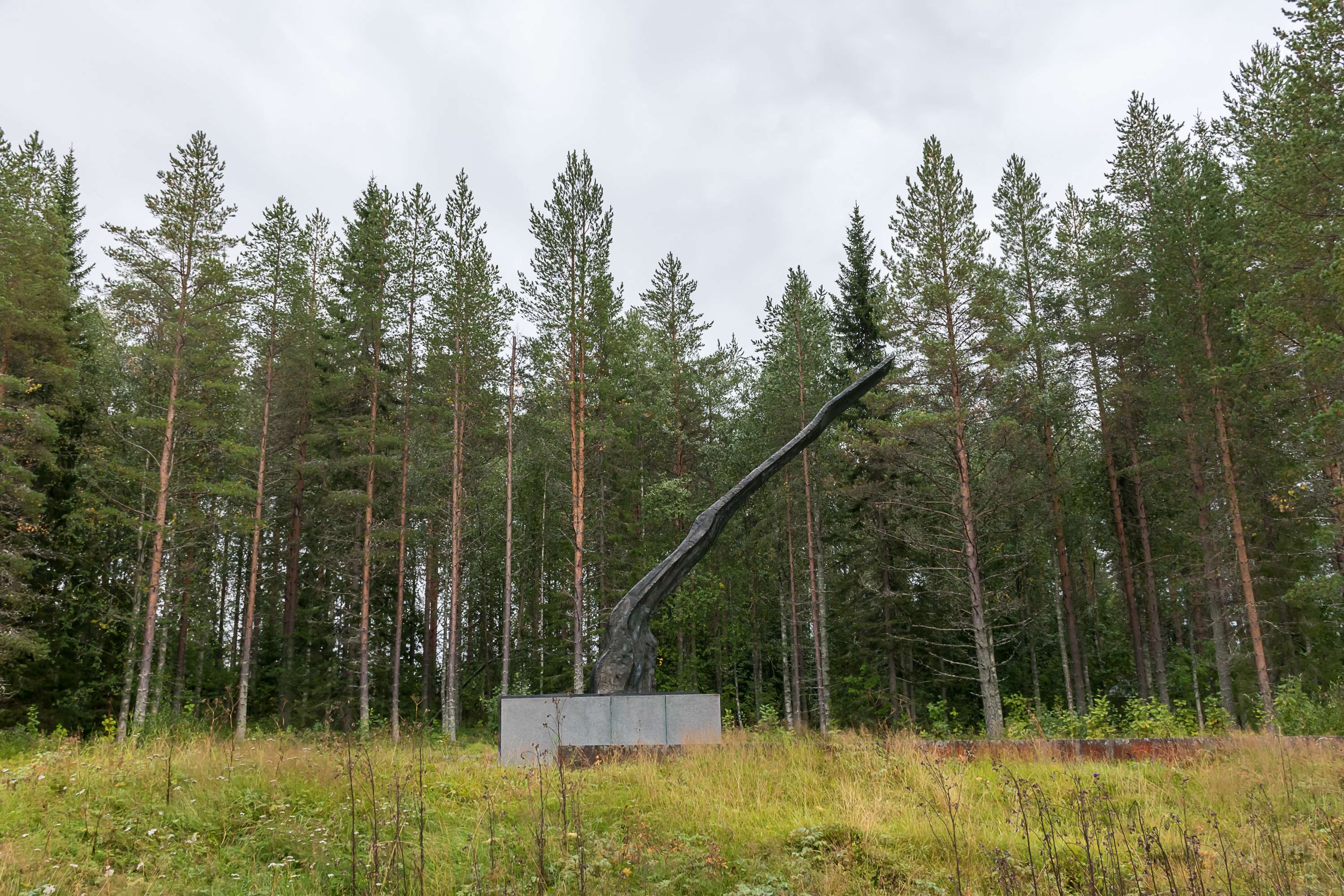 50. "Статуя пламени" (Liekkipatsas) на перекрестке современных дорог на Кухмо и Юнтусранту недалеко от Суомуссалми — главный памятник сражению под Суомуссалми. Автор этого памятника — не кто иной, как сам великий Алвар Аалто (Alvar Aalto, 1898-1976), один из самых знаменитых финских архитекторов. Он построен в 1959 году. Я, честно говоря, так и не понял, что означает его форма. Но памятник большой, 9 м в высоту.