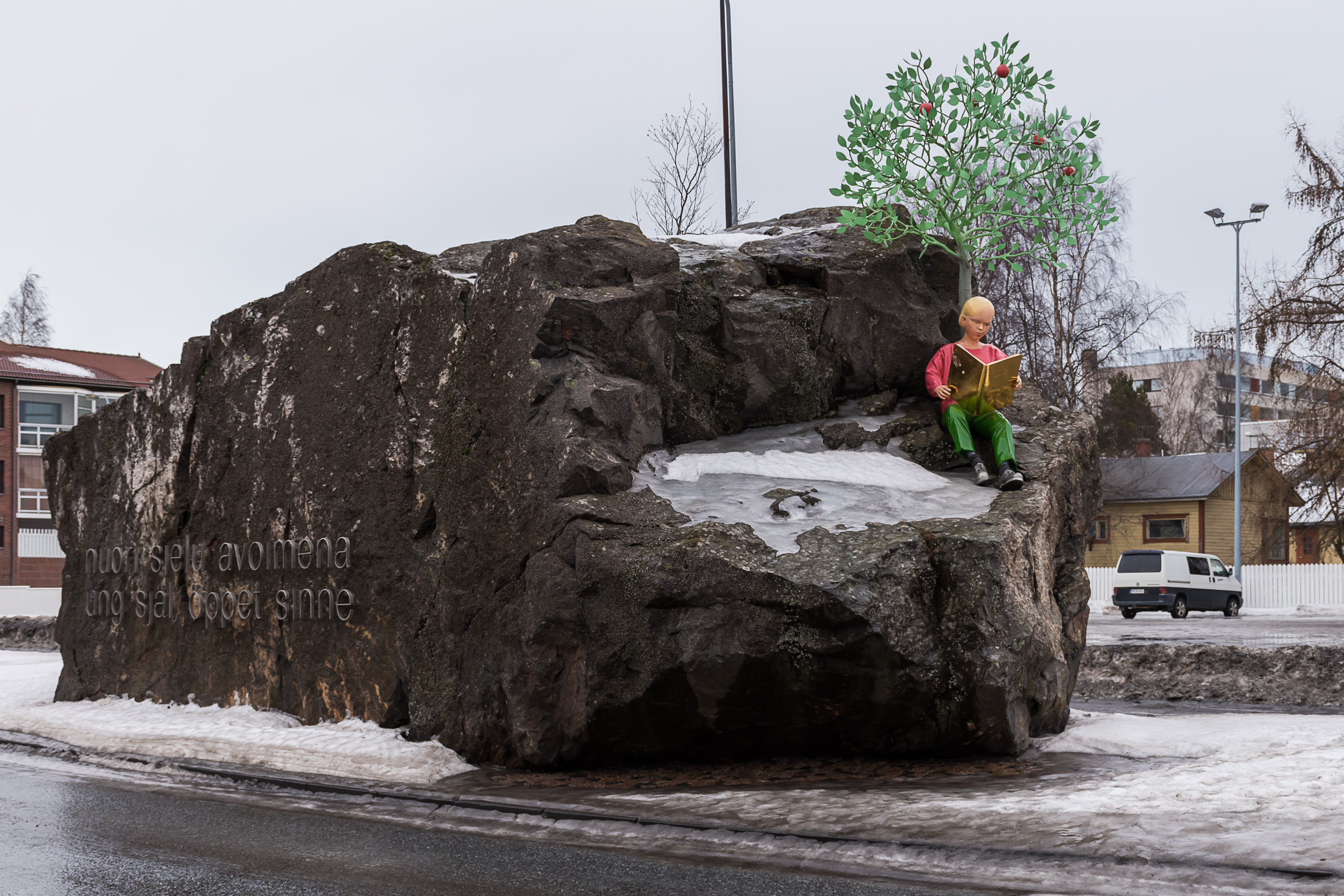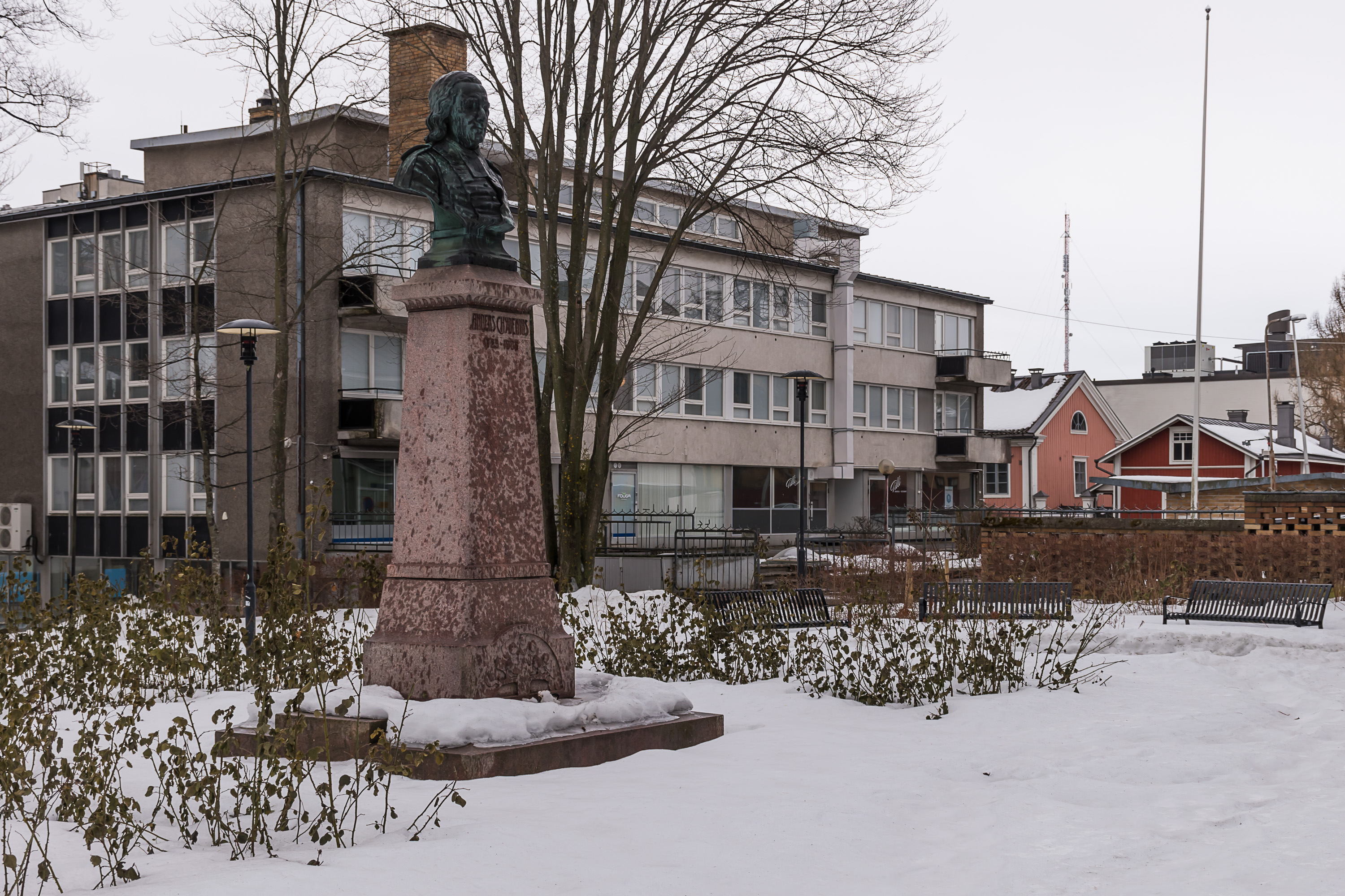 24. Памятник Ю. В. Снелльману. Юхан Вильгельм Снелльман (Johan Vilhelm Snellman, 1806-1881) был выдающимся финским государственным деятелем и одним из отцов идеологии "фенноманства" — фактически финского национального пробуждения. Снелльман на самом деле родился в Стокгольме, но большую часть детства провел тут в Кокколе, где, якобы, любил в детстве вот так вот с книжкой под деревцем сидеть. На установленном в 2006 году памятнике авторства Пекки Юлхя, выдающегося современного скульптуре, написано по-фински и по-шведски: "Юная душа открыта".