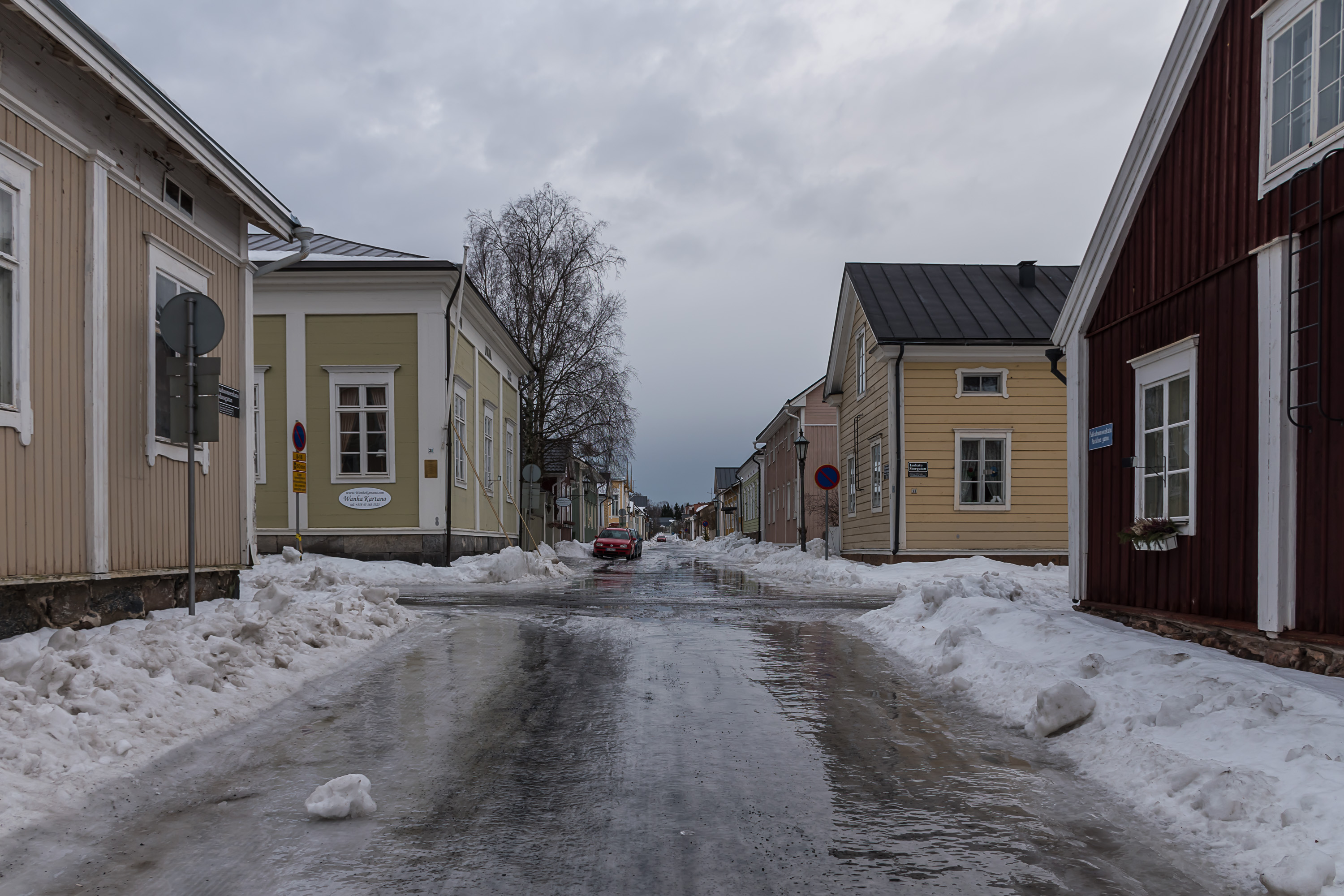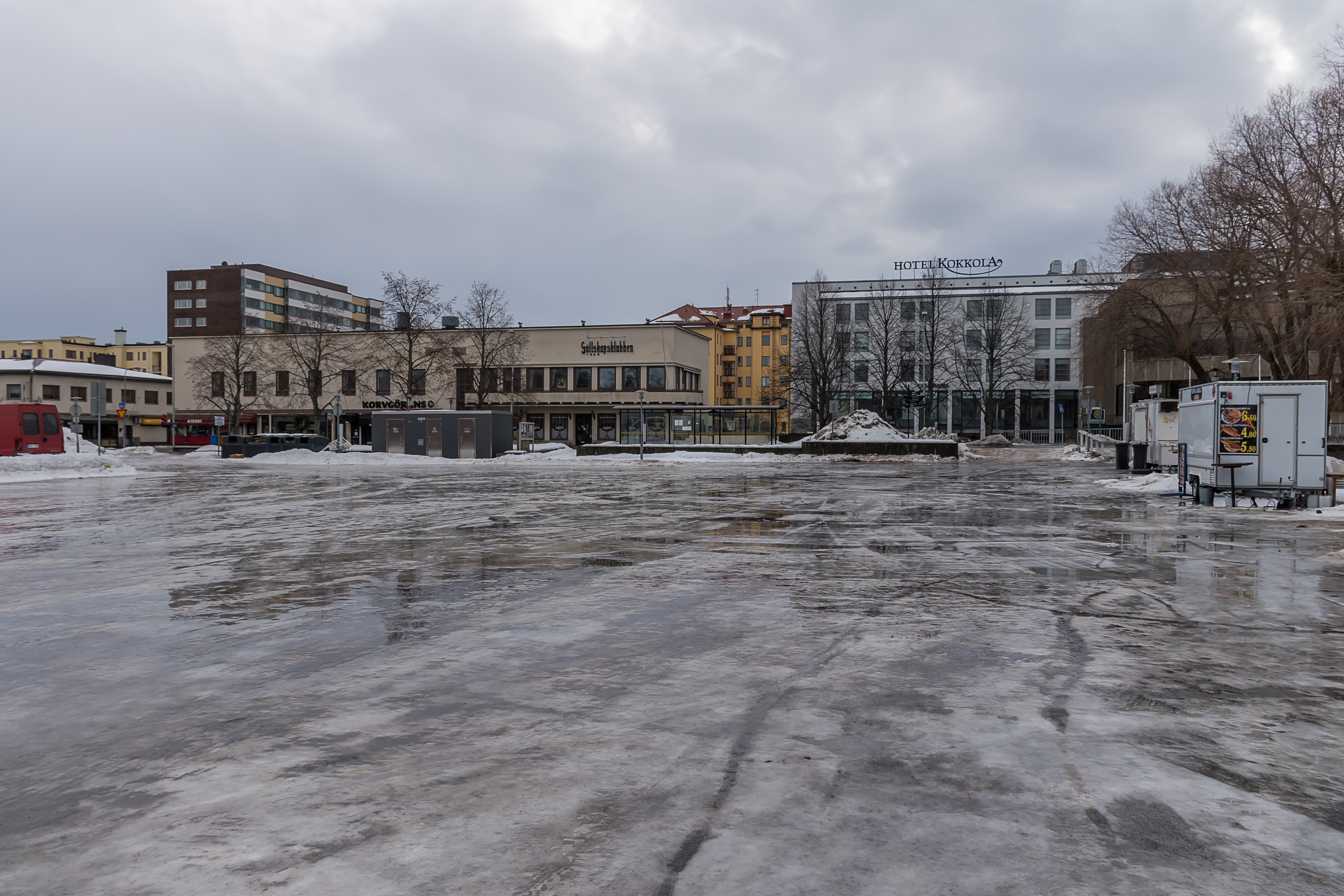4. Зато зимой время забав! Площадь превращается в каток! Наиболее полная прогулка по Кокколе у меня состоялась в феврале 2019, и погода тогда была паршивая; из-за оттепели многие тротуары и мелкие дороги подтаяли и превратились, натурально, в каток (и гранитная крошка не везде помогала, да и не везде она была — не рассыпешь же ее по всей это площади). Так что на многих фото Коккола выглядит намного депрессивней, чем она есть в действительности.
