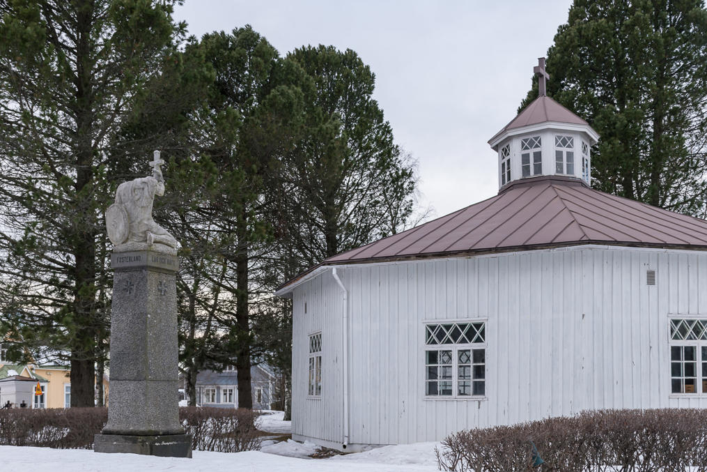 18. Рядом находится другая часть музея — Педагогия (Pedagogio). Это красное здание справа; как-то не сфотографировал его получше. Педагогия исключительно стара для деревянного здания: она построена в 1695-1696. Это второе самое старое сохранившееся здание Кокколы (после Каарлельской церкви, до которой мы еще дойдем) и самое старое светское деревянное здание всей Финляндии (самое старое религиозное деревянное здание Финляндии — церковь в Вёро (Vörå) 1626 года). Педагогия — это школа; так в Швеции в 17-18 веках назывались начальные школы. Король Густав-Адольф II постановил в начале 17 века, что школы должны делиться на три стадии: педагогия, тривиальная школа и гимназия.