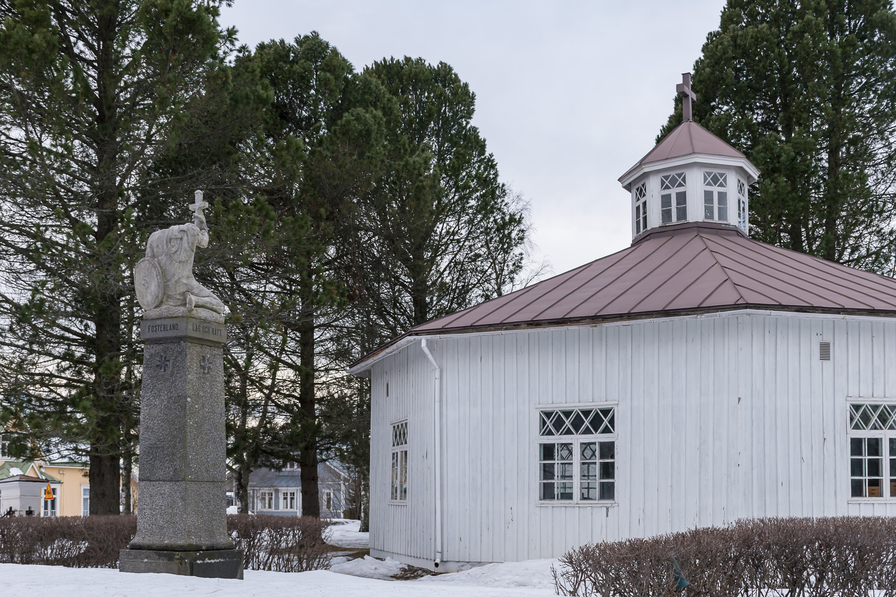 На пьедестале виден герб Центральной Остроботнии, с куницей. Исторически на гербах Остроботнии изображали и изображают горностаев, но на самых старых известных изображениях была все-таки куница, а не горностай. И когда в 1950 придумывали герб для Центральной Остроботнии, куницу как раз и решили вернуть в строй.