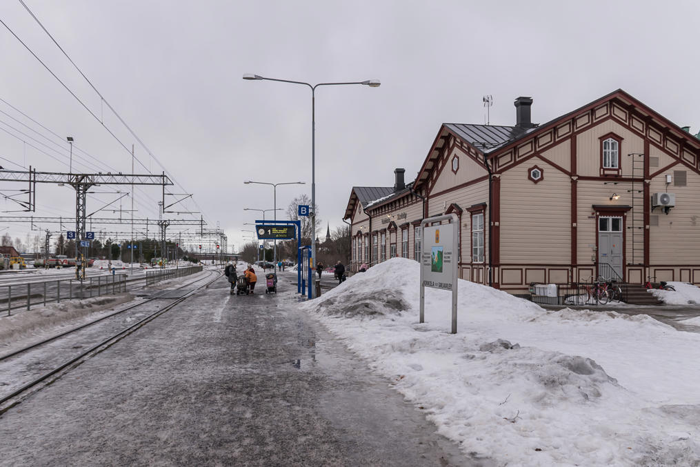 30. Ну а это — вокзал, вид с улицы. Старое здание Кнута Нюландера (Knut Nylander, 1839-1886), главного архитектора железных дорог в те годы, до сих пор используется; оно выглядит похоже на большинство других вокзалов на Остроботнийской ж/д.