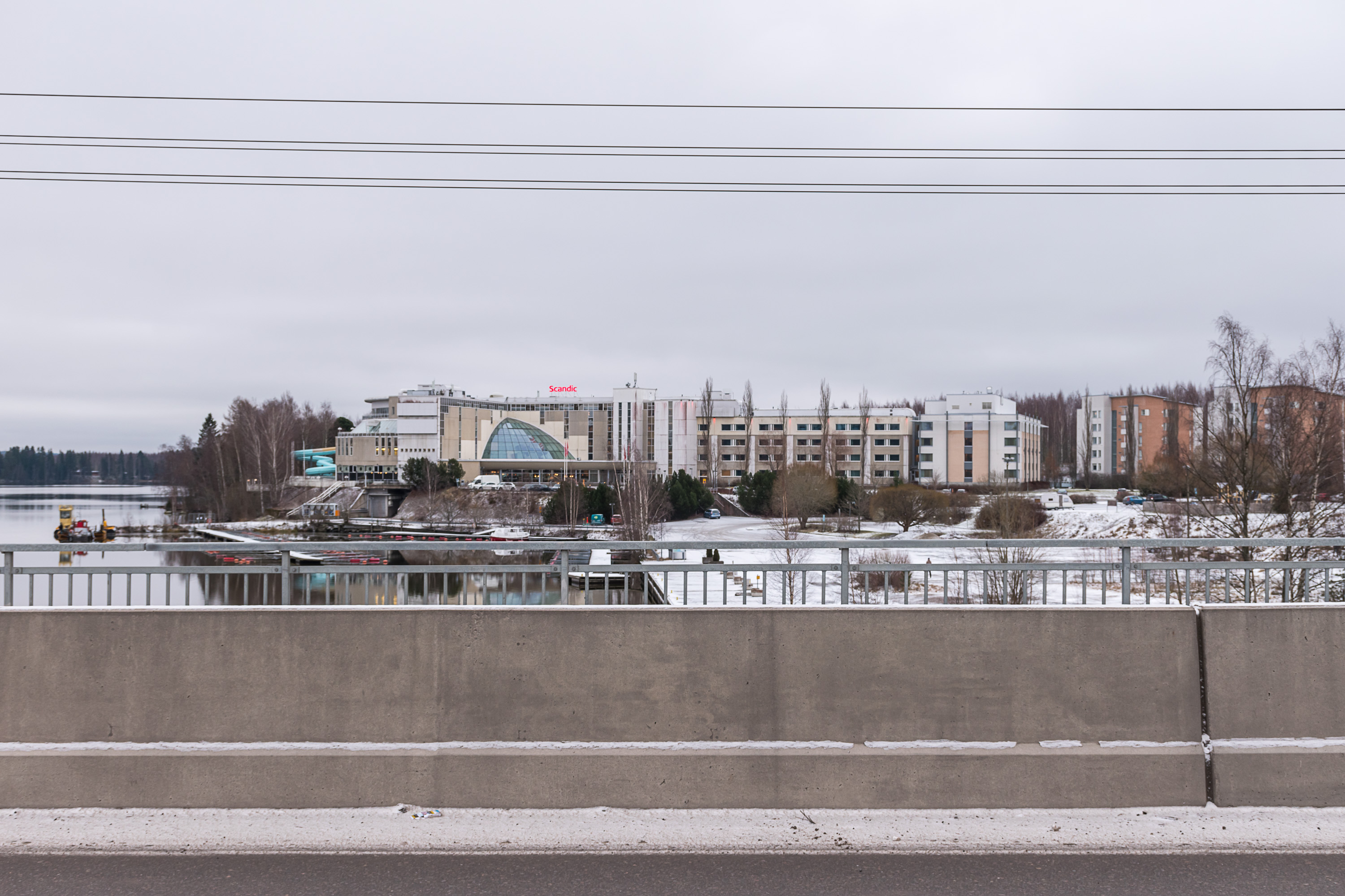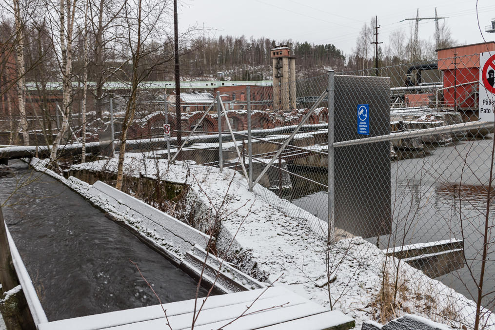10. Промышленные здания и строения на южном берегу выглядят заброшенными, хотя территория все еще огорожена, и кое-где горит свет и видны камеры. Особенно грустно выглядит идущий, по-видимому, от озёрной гавани конвейер для щепы, который теперь весь в дырах. В Финляндии не слишком часто можно встретить такую прямо явную разруху в значительных масштабах — хотя все равно изредка да и бывает — ничего особо волшебного в Финляндии все-таки нет. Заброшенные здания использовались для производства древесной массы и целлюлозы; теперь комбинат работает на вторсырье и на привозной древесной массе с других предприятий.
