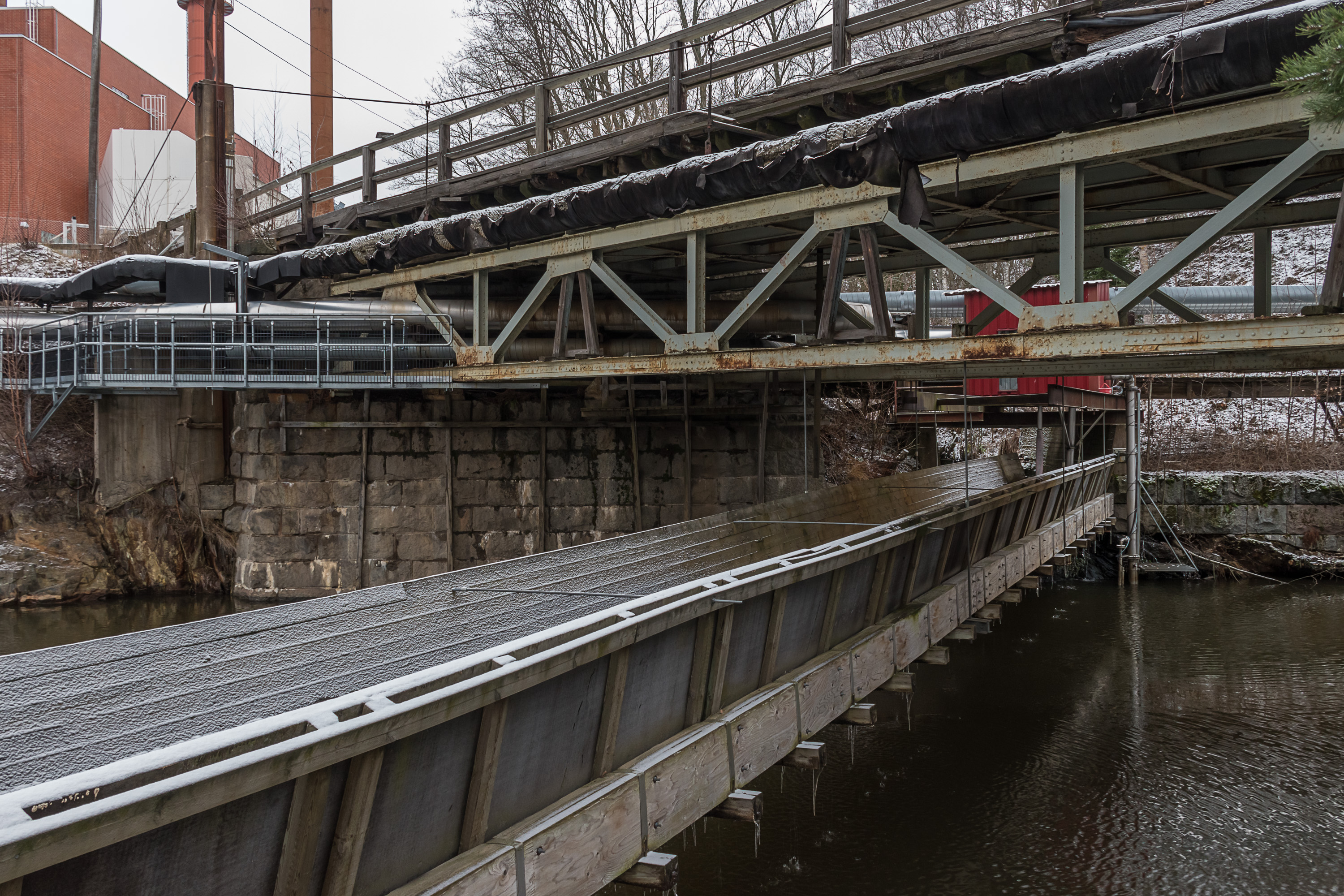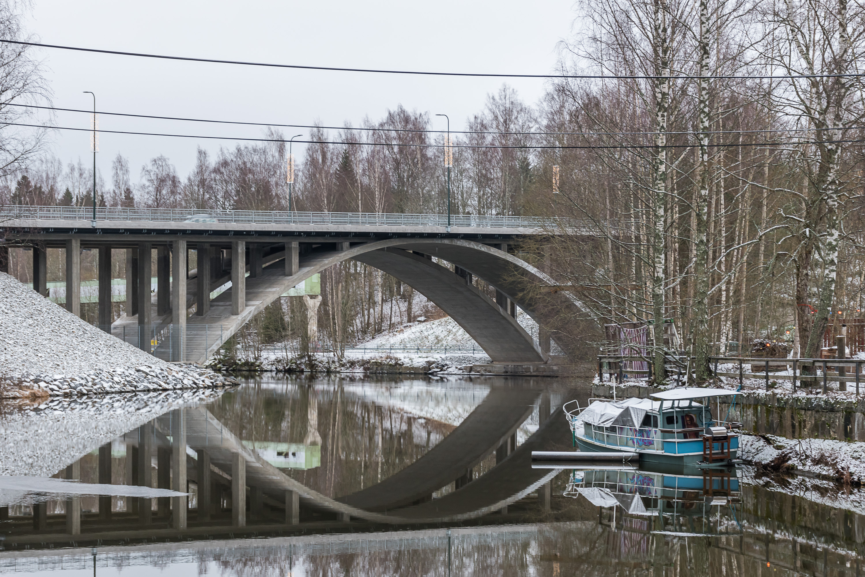 2. Всего два моста через реку открыты для общего пользования; следующий после них уже в 20 км ниже по течению, за устьем Нокианвирты и озером Куловеси, через проливы между Куловеси и Раутавеси. Этот мост в центре Нокиа выглядит немолодым, но на самом деле старый мост 1957 года снесли из-за ветхости и перестроили заново в 2018-2020 годах, полностью сохранив его облик, только сделав чуть пошире.