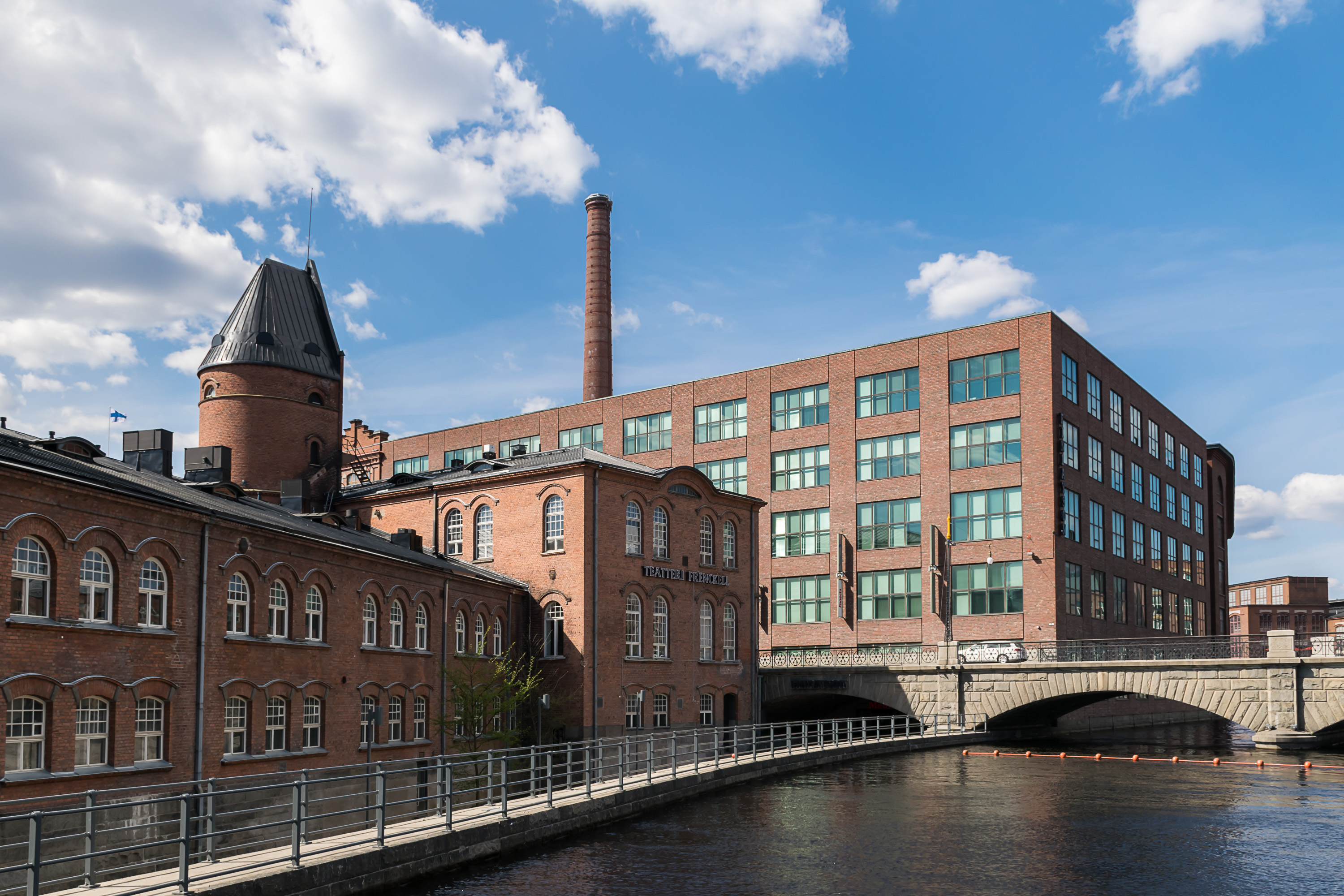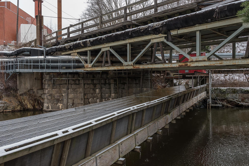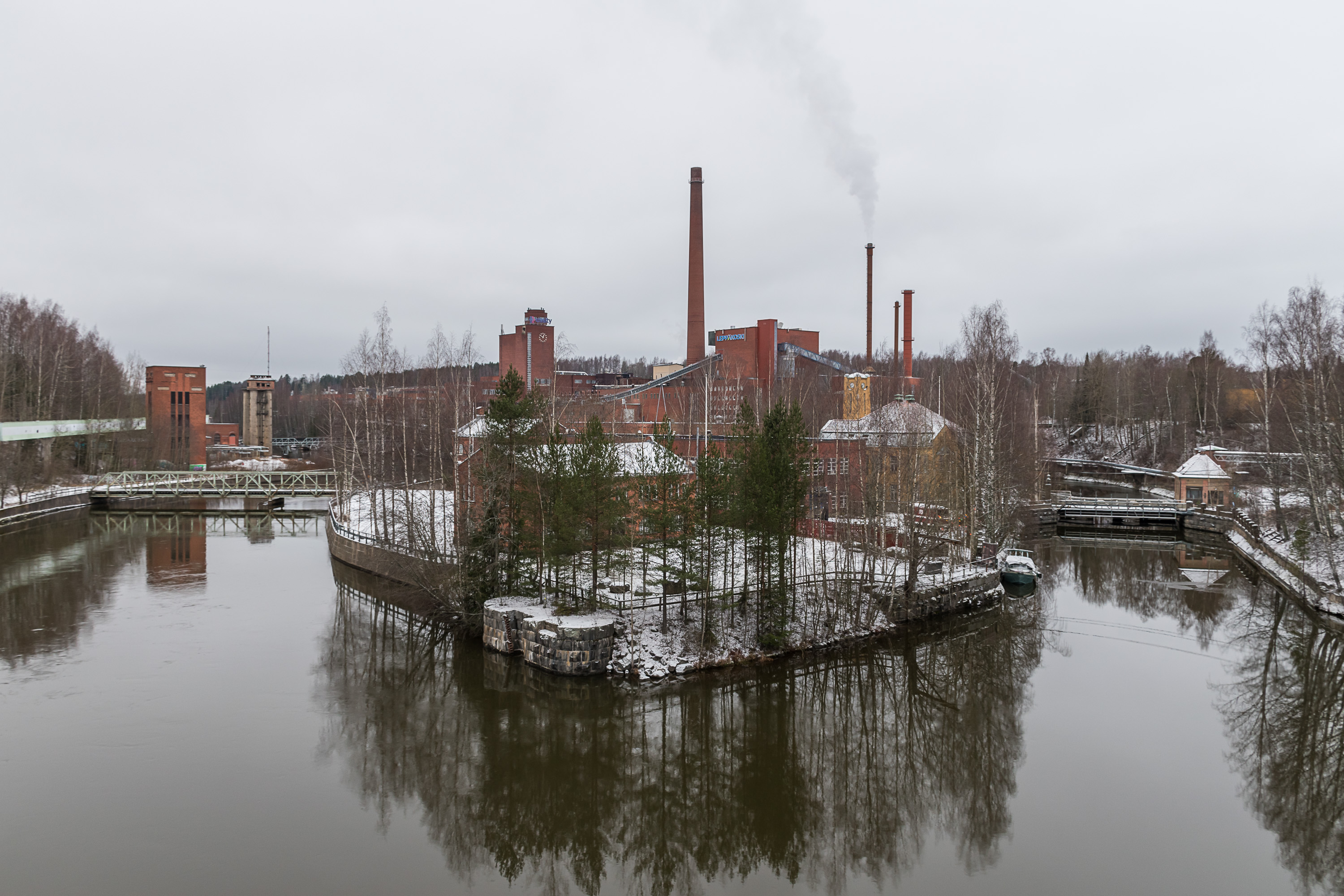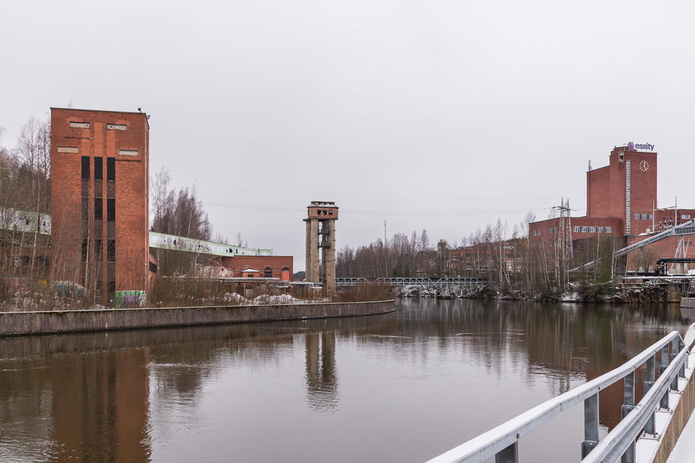 Башня чуть дальше слева с часами и логотипом Essity относится, собственно, к бумажному комбинату Essity. Постройки на левом берегу относились также к бумажному комбинату, но сейчас практически заброшены.