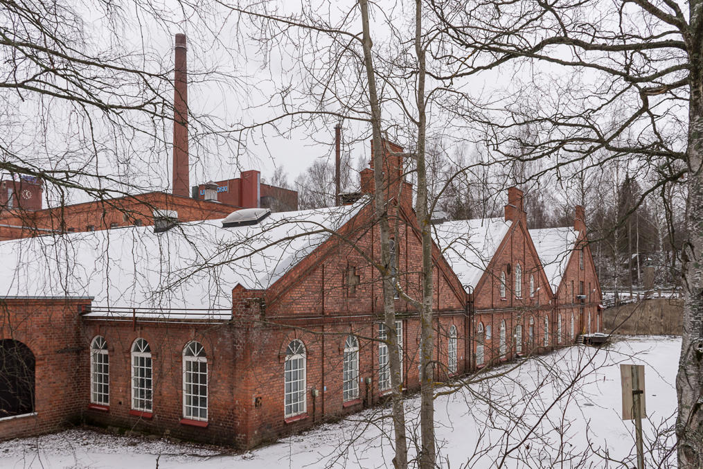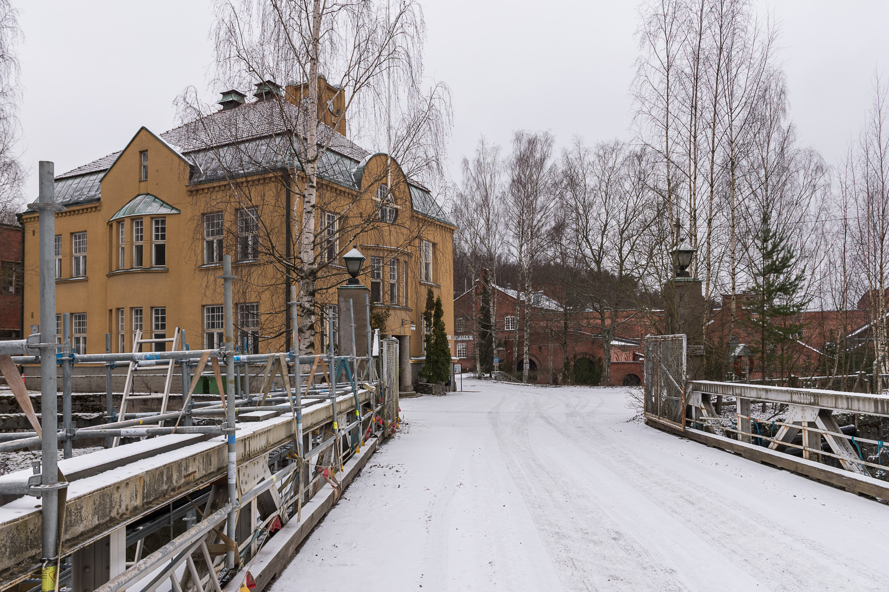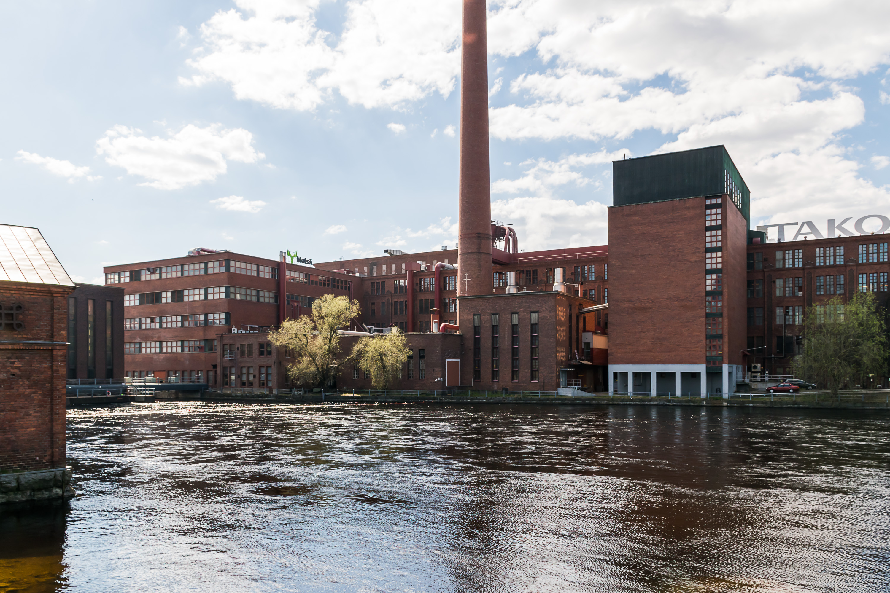 1. Техдассаари, вид с моста через Нокианвирту. Остров с самыми старыми зданиями промзоны — искусственный; справа (с северной стороны) от материка его отделяет перекрытый плотиной искусственный канал.