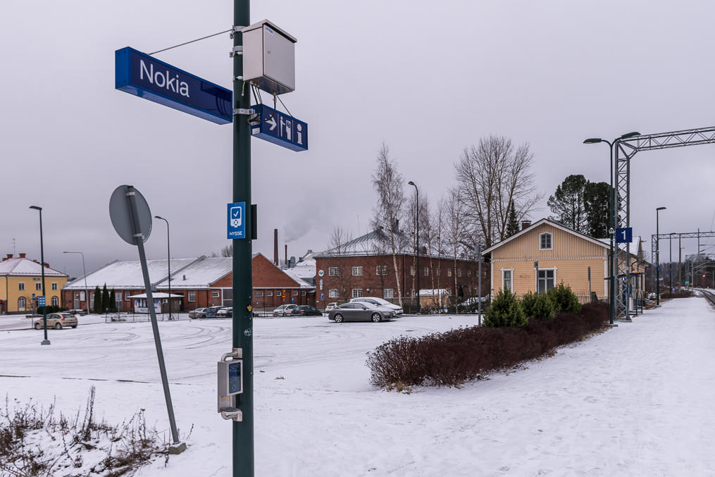 24. Валидатор транспортных карт на платформе напоминает нам, что останавливаются в Нокиа и электрички. С 1980-х годов в Финляндии вовсе не было пригородного ж/д движениями за пределами окрестностей Хельсинки. Сейчас ж/д транспорт снова в моде по экологическим причинам, и электрички снова актуальны из-за продолжающегося быстрого роста немногочисленных других крупных финских городов. В 2019 году электрички после долгого-долгого перерыва снова появились в окрестностях Тампере. Возможно, в чем-то это, конечно, громко сказано; появился лишь один новый маршрут, M-электрички, Нокиа-Тампере-Тойяла (часть рейсов только Нокиа-Тампере или Тампере-Тойяла). Также есть R-электрички от самого Хельсинки, часть которых была продлена от Рийхимяки до Тампере еще в 2017.