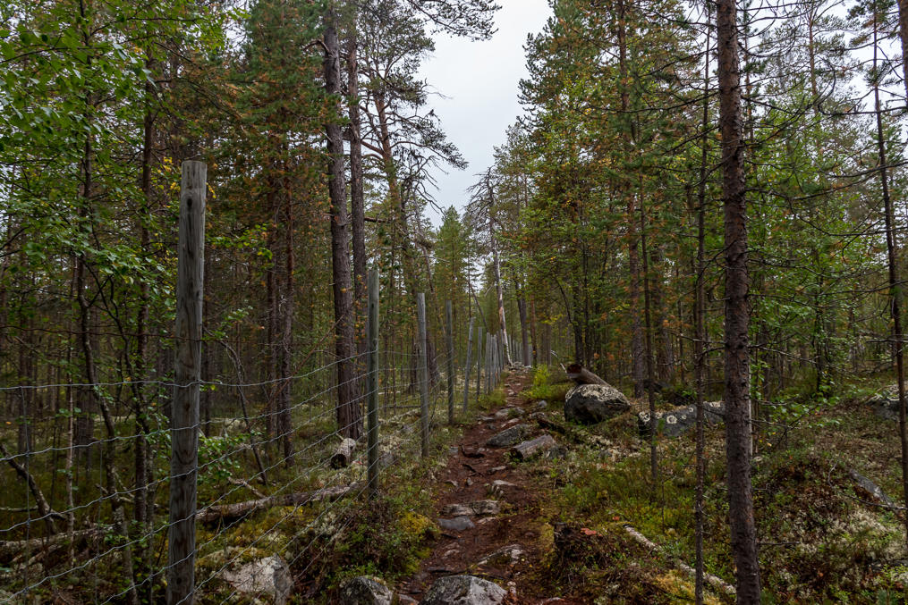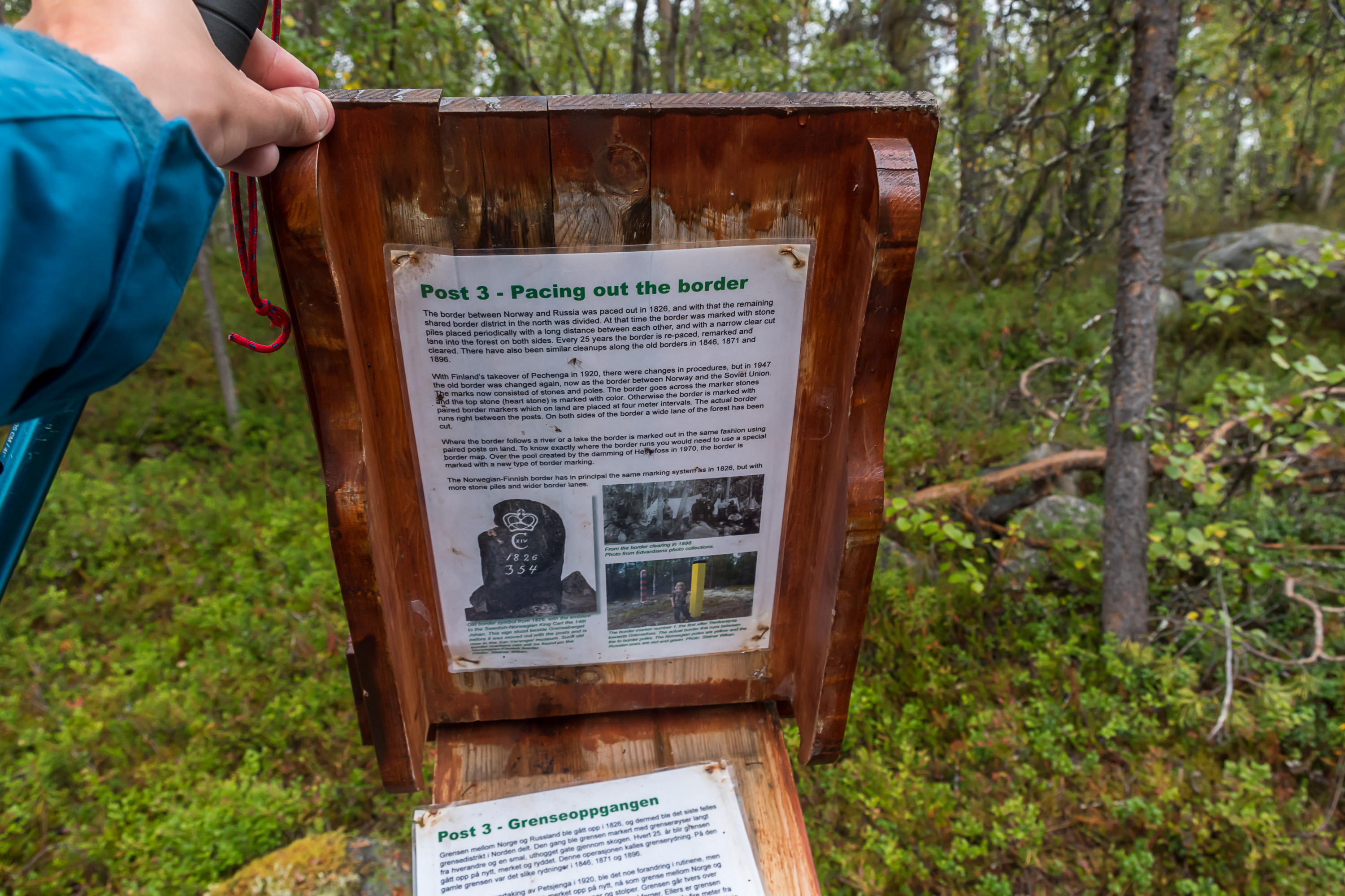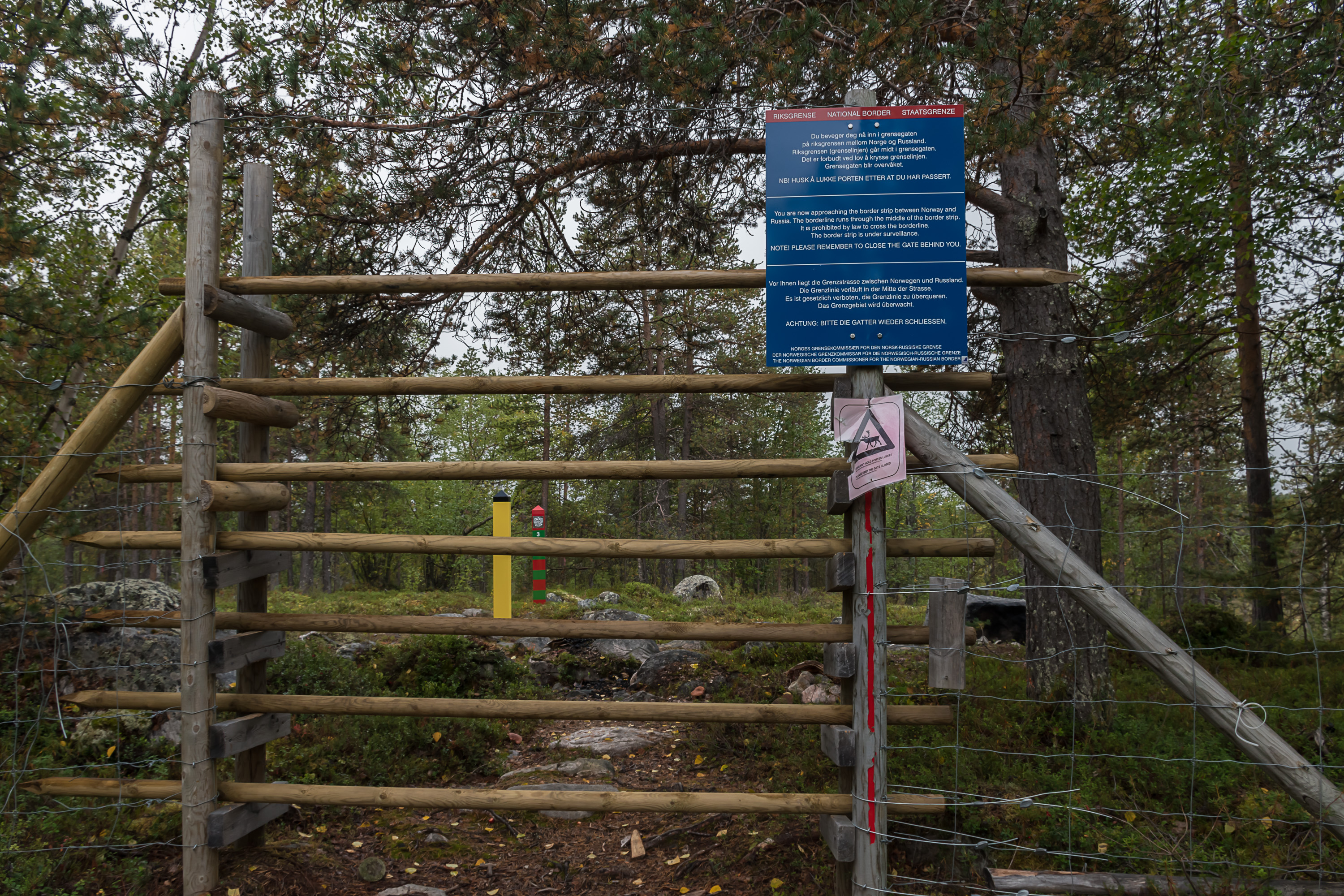 16. Маршрут идет вдоль норвежско-российской границы, и местами выходит совсем близко к ней. В отличие от Финляндии, в Норвегии вдоль российской границы (которая в Норвегии, конечно, не особо длинна, да и то большая часть проходит по рекам) вовсе нет никакой погранзоны. Странное, конечно, ощущение. Ведь это граница не только Шенгенской зоны, но и страны НАТО (Норвегия входит в НАТО, хотя Финляндия — нет). Забор от оленей вдоль границы есть, но за него можно заходить, и даже потрогать желтый норвежский пограничный столбик. Линия границы проходит посередине между норвежским и российскими столбиками (расстояниее между которыми — 2 м). Заходить на российскую сторону, или даже просовывать руку или бросать туда что-либо, конечно, строго запрещено. За границей постоянно наблюдают с помощью камер, и, вероятно, других устройств и датчиков.