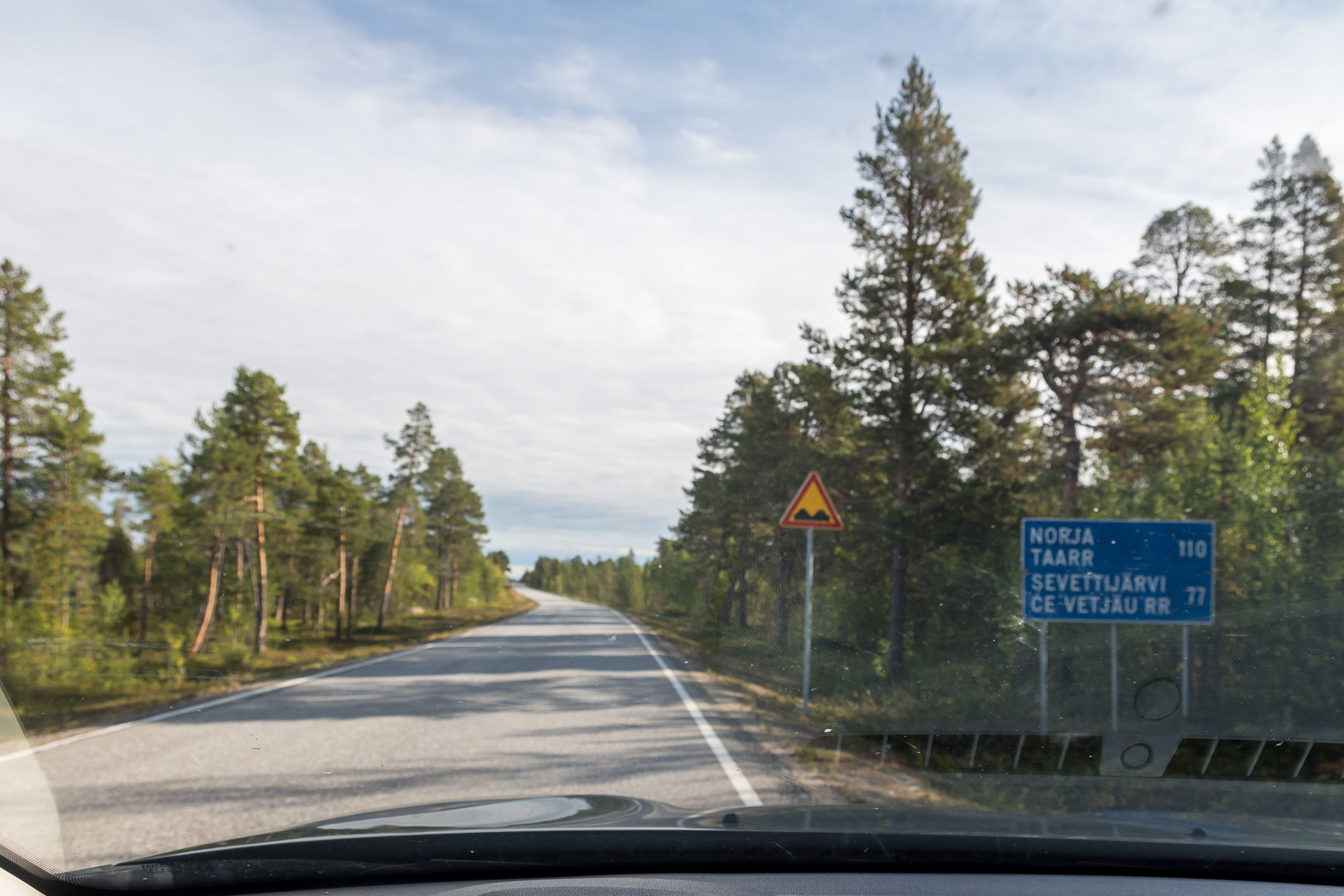 1. Наш путь начинается из Финляндии, от села Инари. Спустя 25 км на север трассой 4 поворачиваем на северо-восток — на трассу 92. Эта дорога идет северным берегом Инариярви, через деревни Севеттиярви и Няятямё, в Норвегию в сторону Киркенеса. Статус главной дороги (kantatie) с двузначным номером ей решили дать недавно; до 2016 года это была региональная дорога номер 971. Языки на знаке — финский и скольтско-саамский.