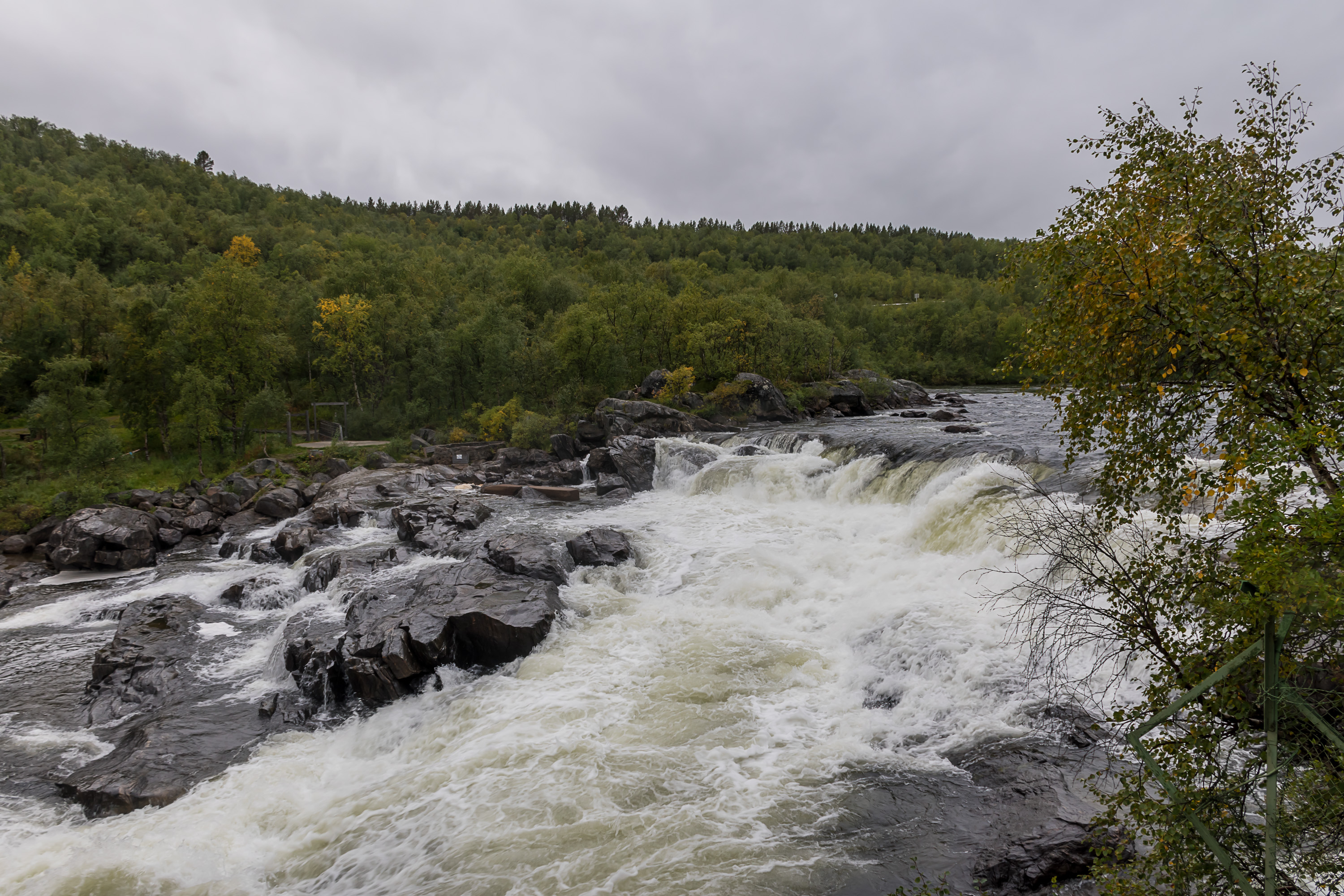 6. Водопад Скольтефоссен (Skoltefossen) у перекрестка дорог. Проехав по трассе 92 около 130 км, включая пересечение границы, поворачиваем на трассу E6 — дорогу-хребет всей Норвегии — в сторону города Киркенес. Дальше 37 км едем по E6, местами у самого фьорда, но чуть не доезжая до самого Киркенеса, поворачиваем на юг. И дальше — еще 100 км едем вверх по долине реки Паз — Пасвикдален (Pasvikdalen).