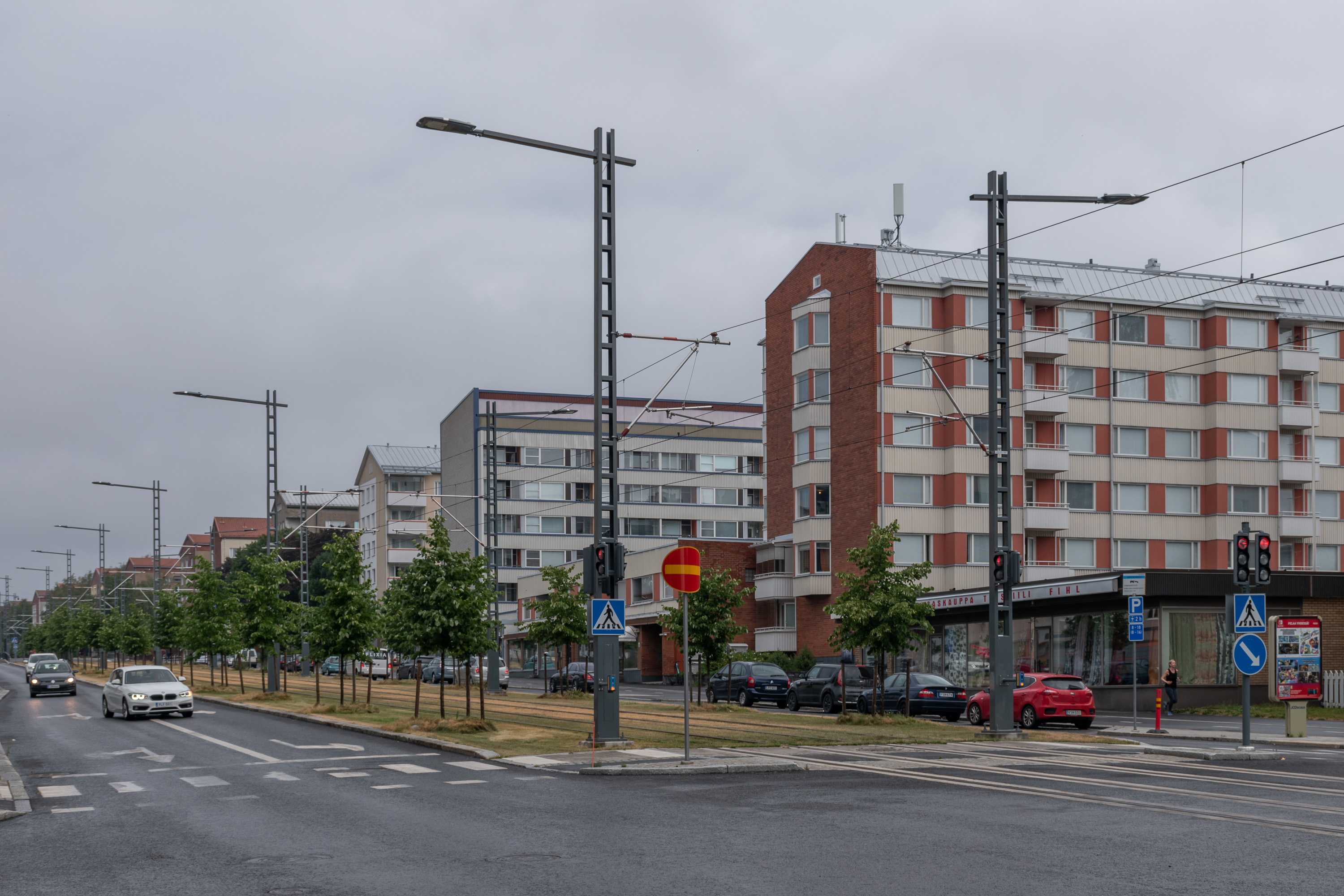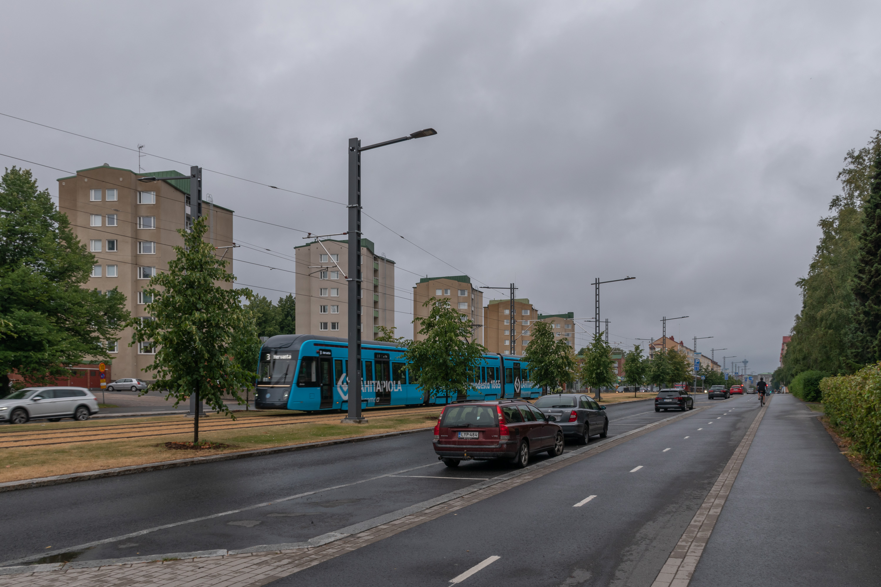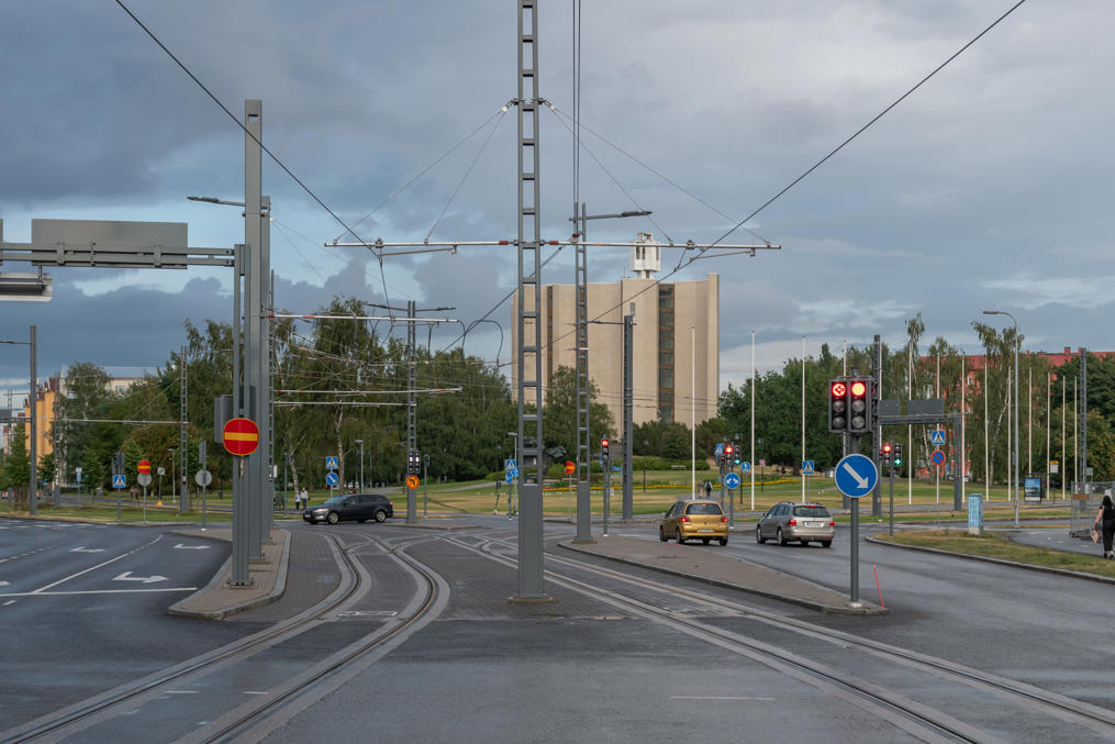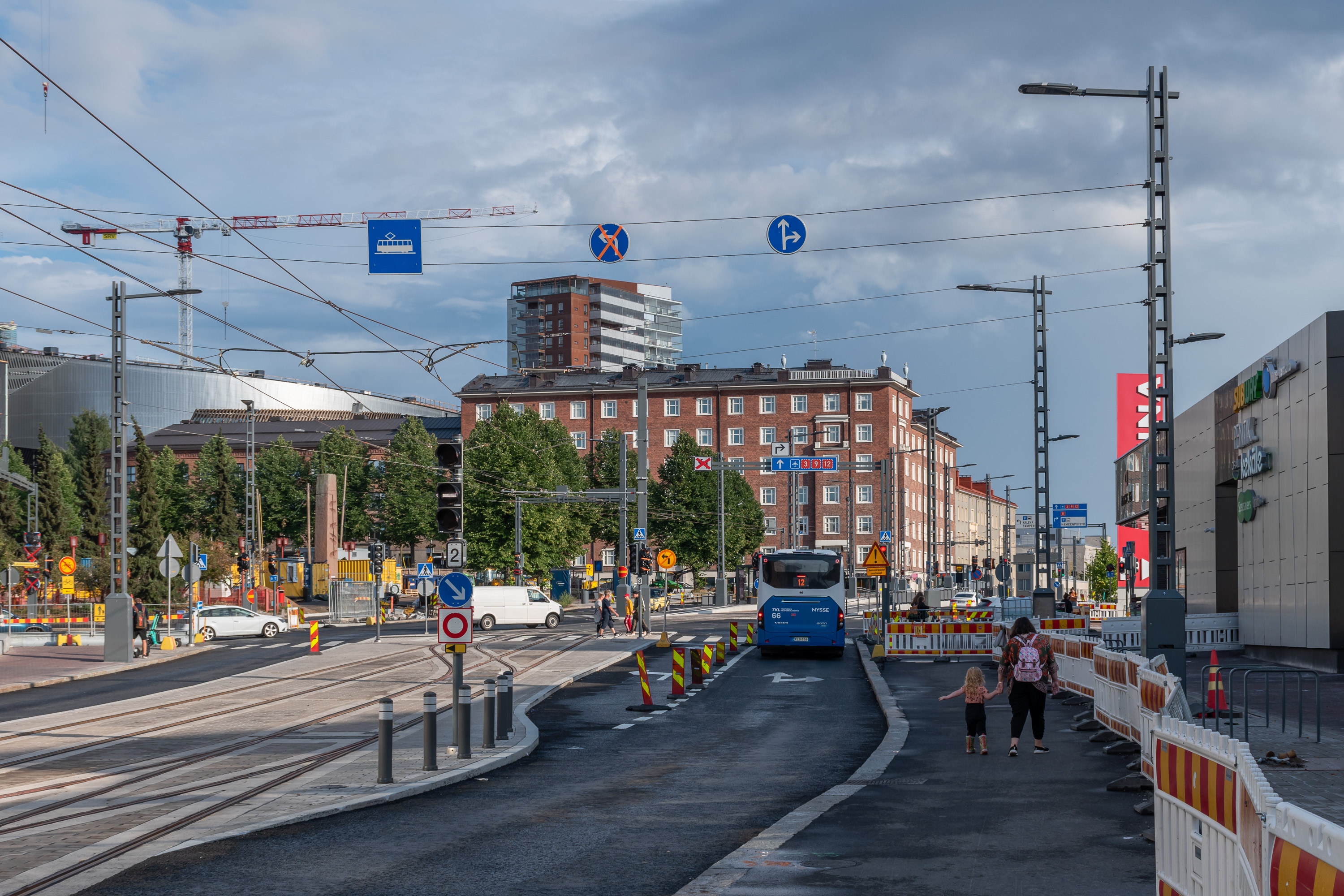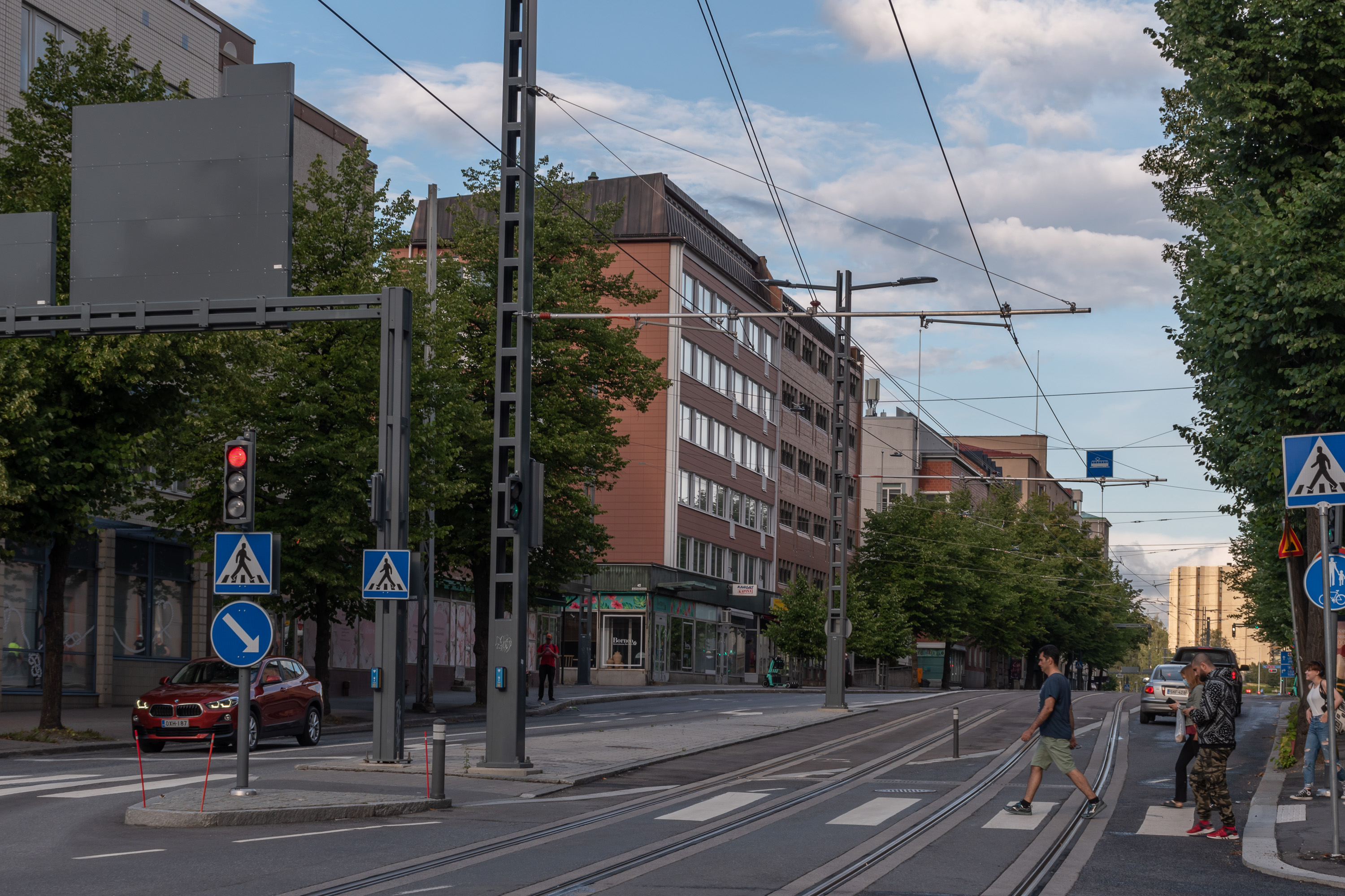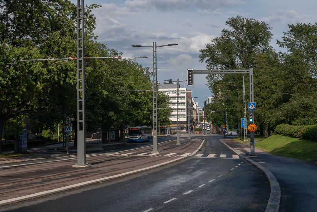 87. Здесь, кстати, вышло немного проблемное место после строительства трамвая; там, где стоят автобус и машины на фото, в сторону центра на Итсеняйсююденкату, сейчас стал светофор короткий и по утрам по будням, говорят, собираются пробки, хотя это одно из важных направлений въезда в центр. Может, можно как-нибудь светофоры перенастроить, не знаю; тут даже и пересечений с трамваем-то ведь нет.