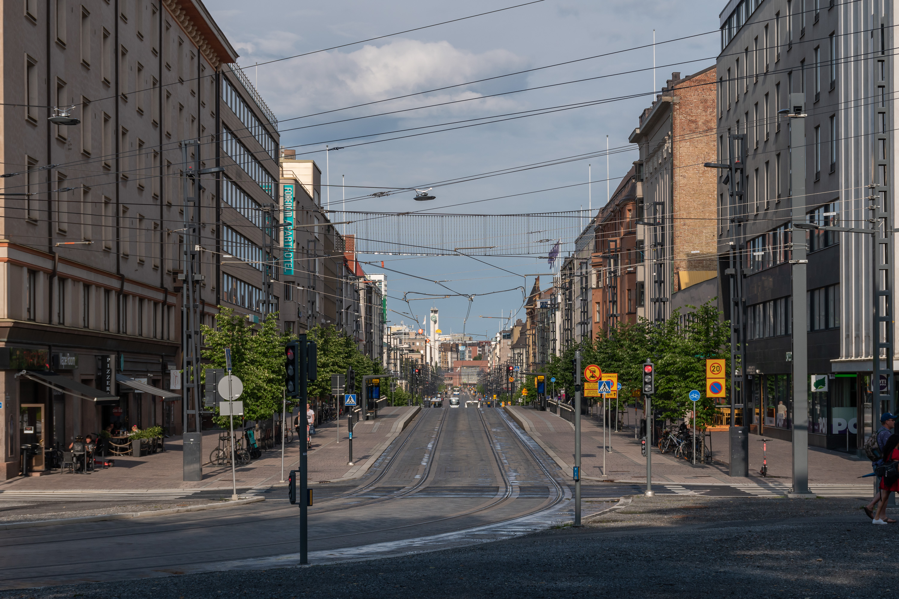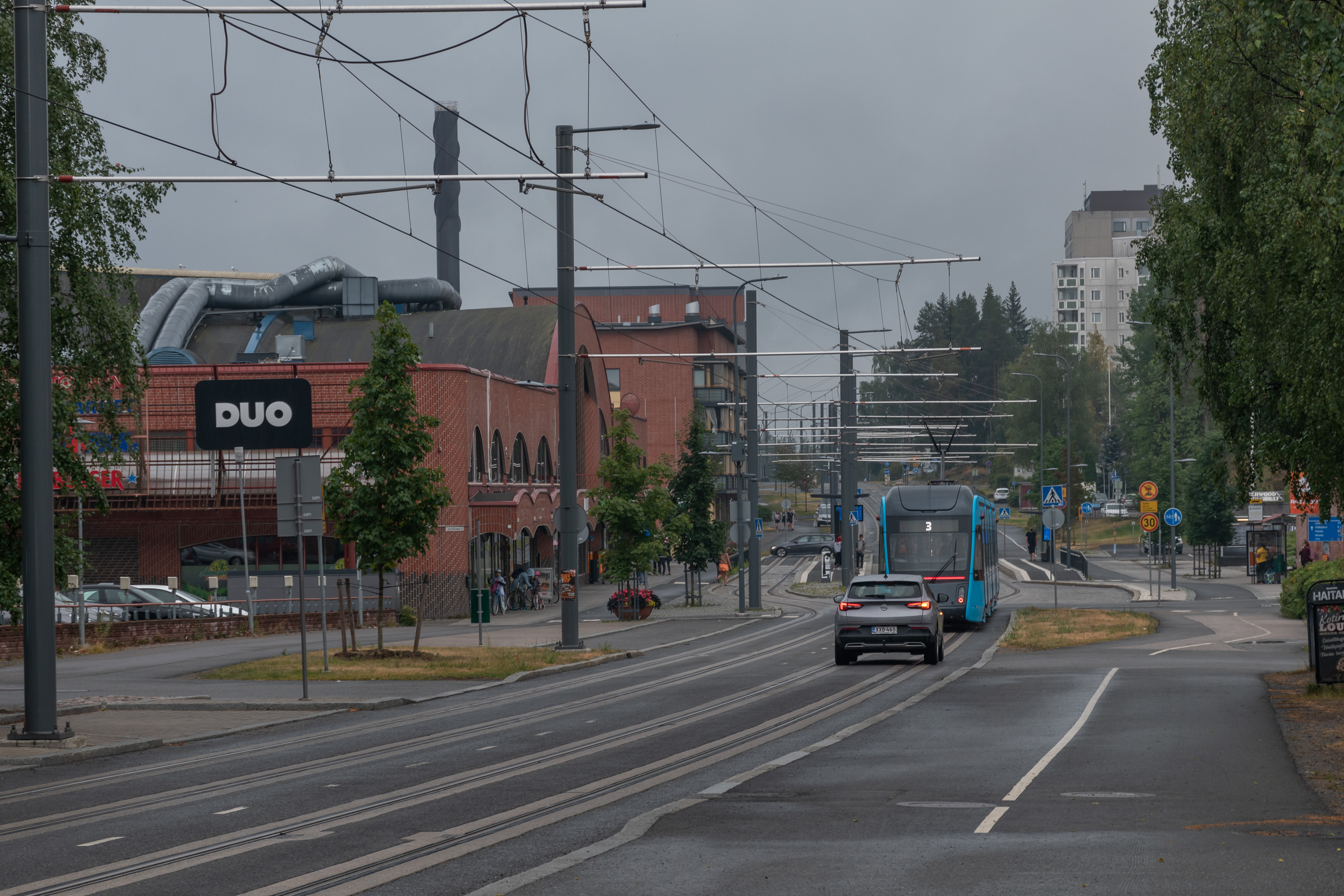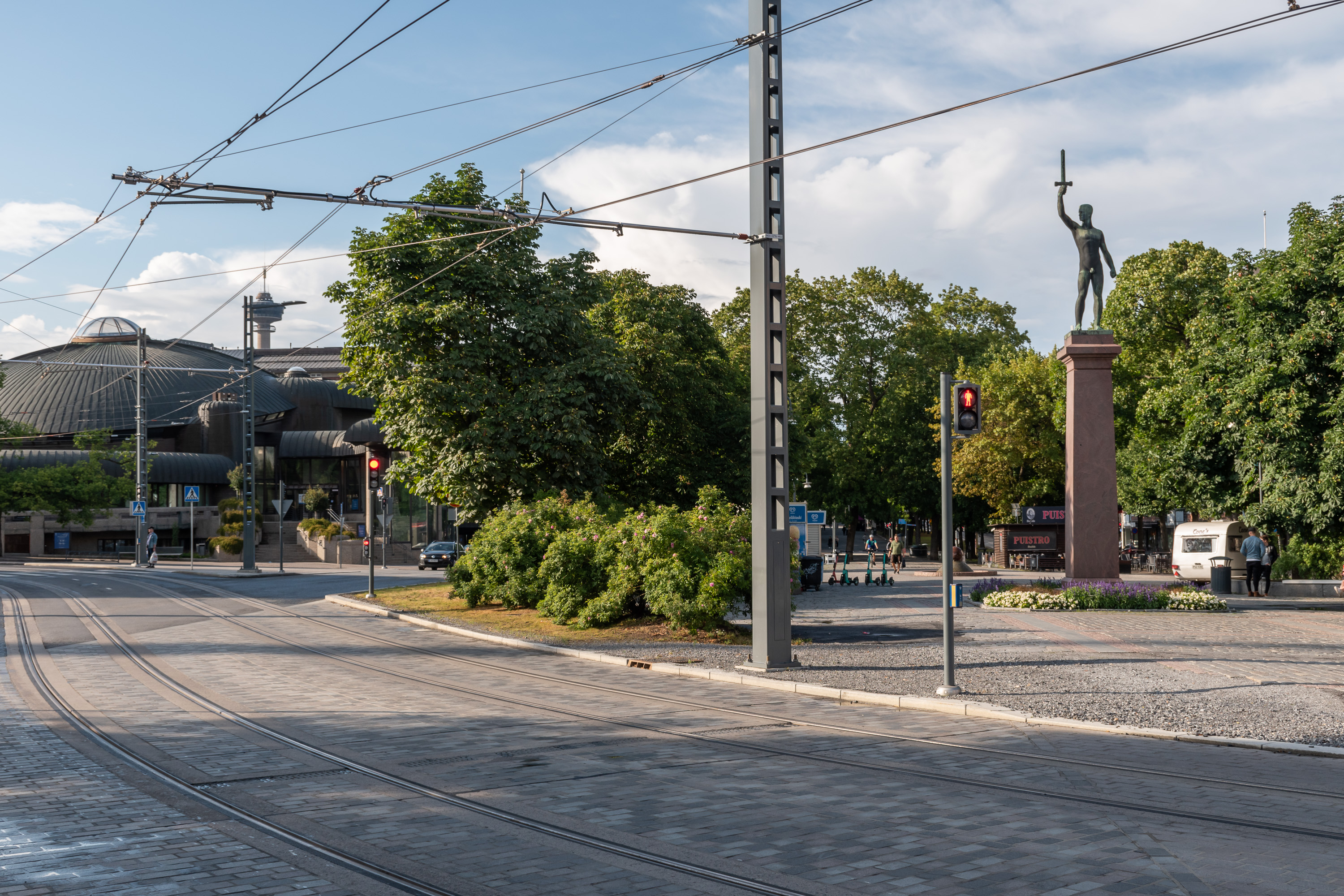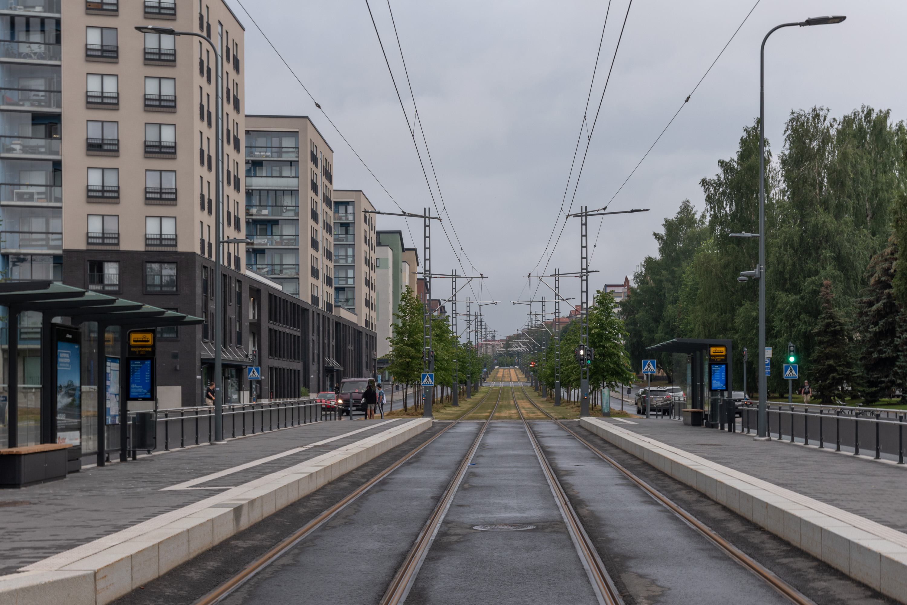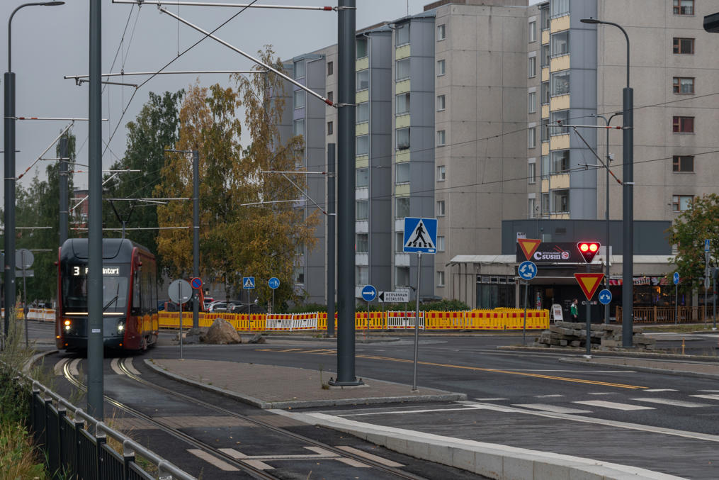 87. Здесь, кстати, вышло немного проблемное место после строительства трамвая; там, где стоят автобус и машины на фото, в сторону центра на Итсеняйсююденкату, сейчас стал светофор короткий и по утрам по будням, говорят, собираются пробки, хотя это одно из важных направлений въезда в центр. Может, можно как-нибудь светофоры перенастроить, не знаю; тут даже и пересечений с трамваем-то ведь нет.