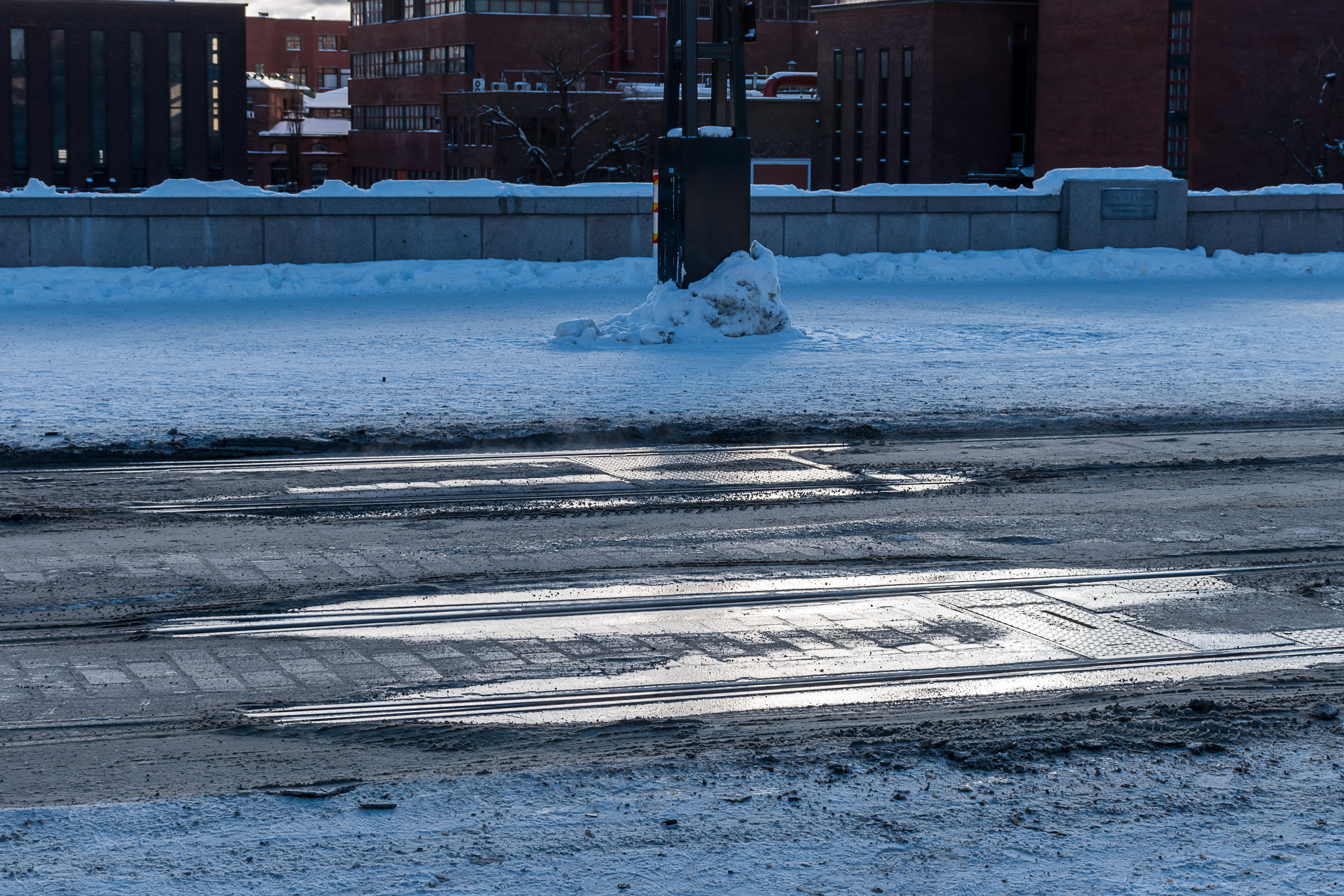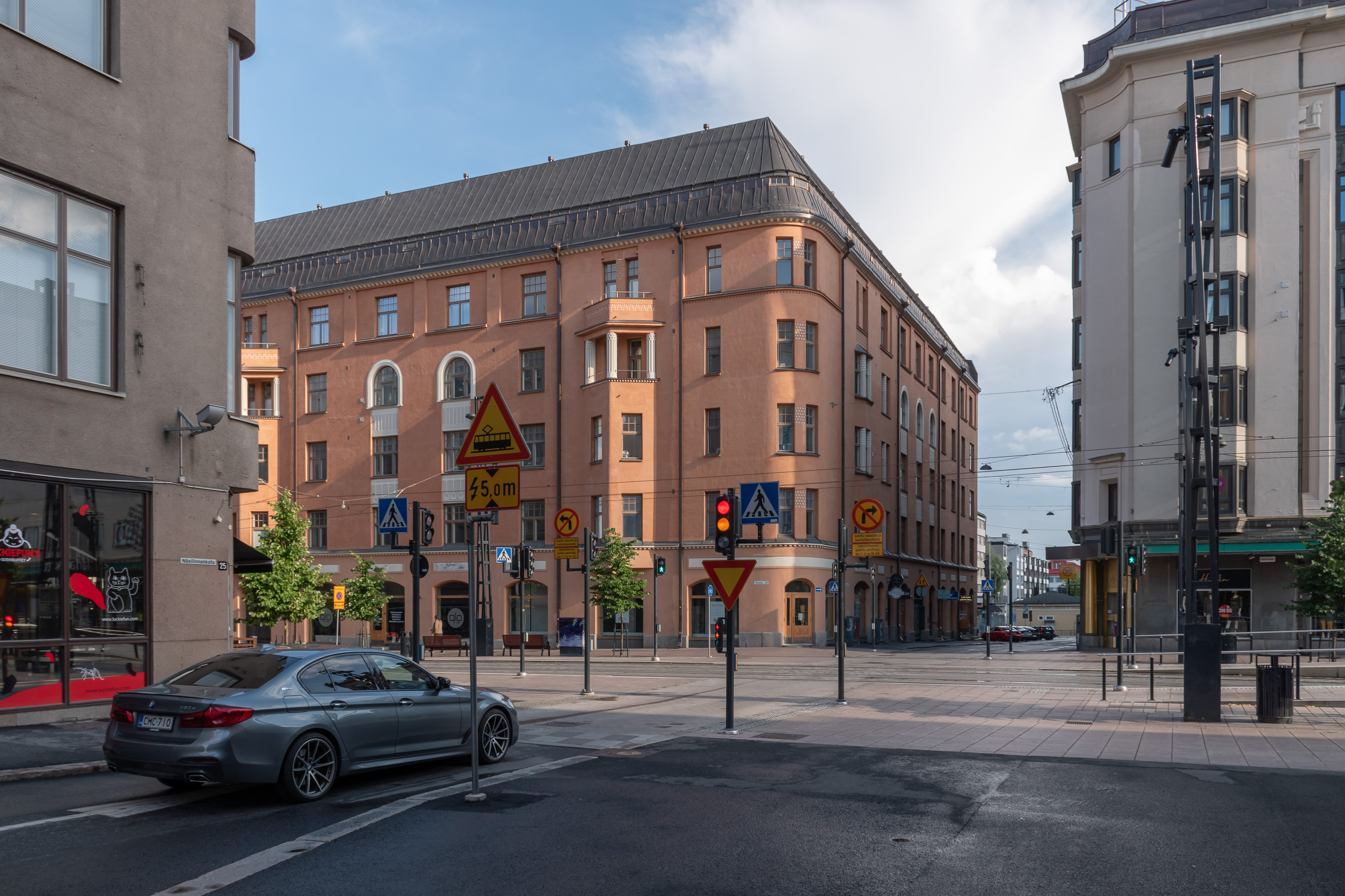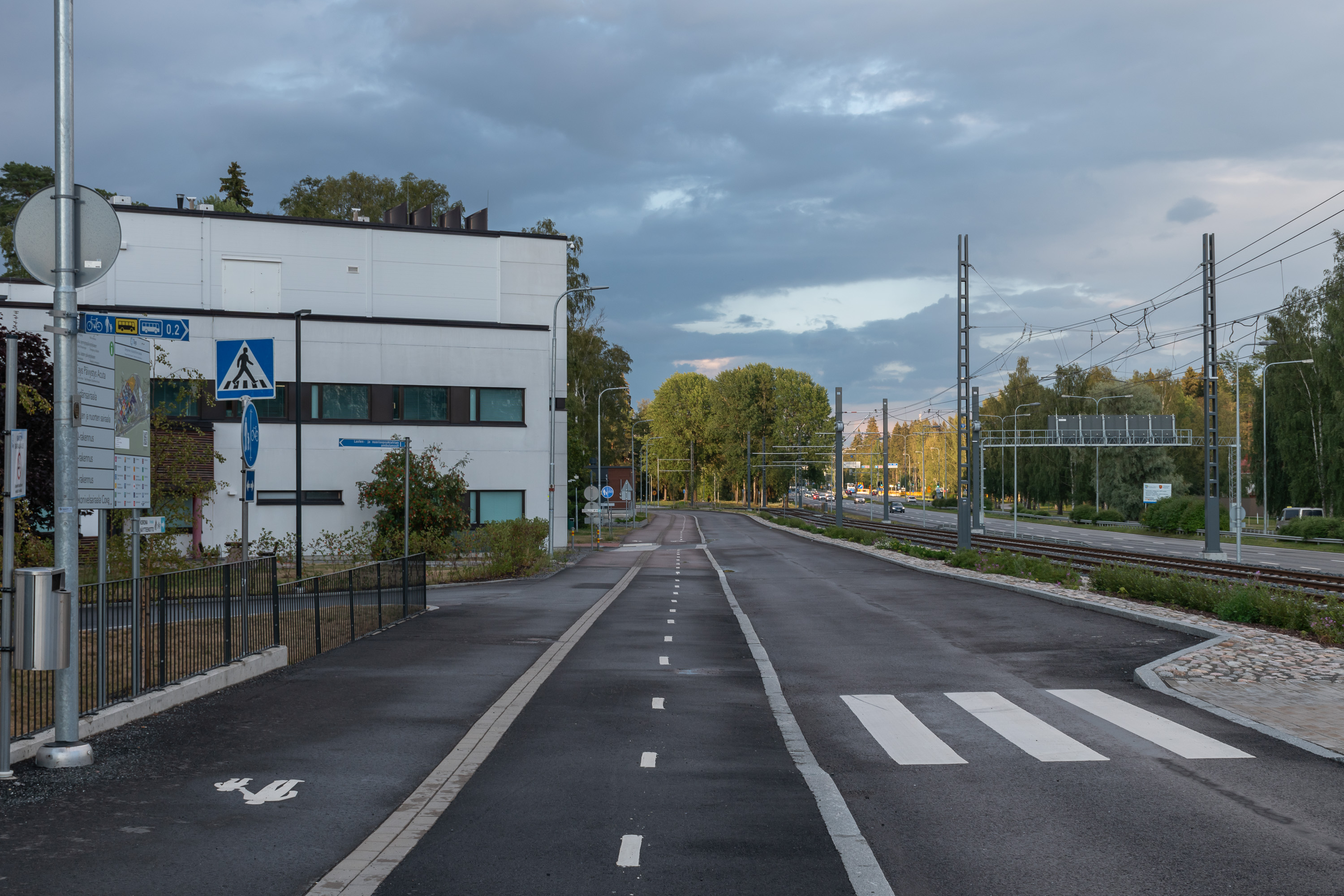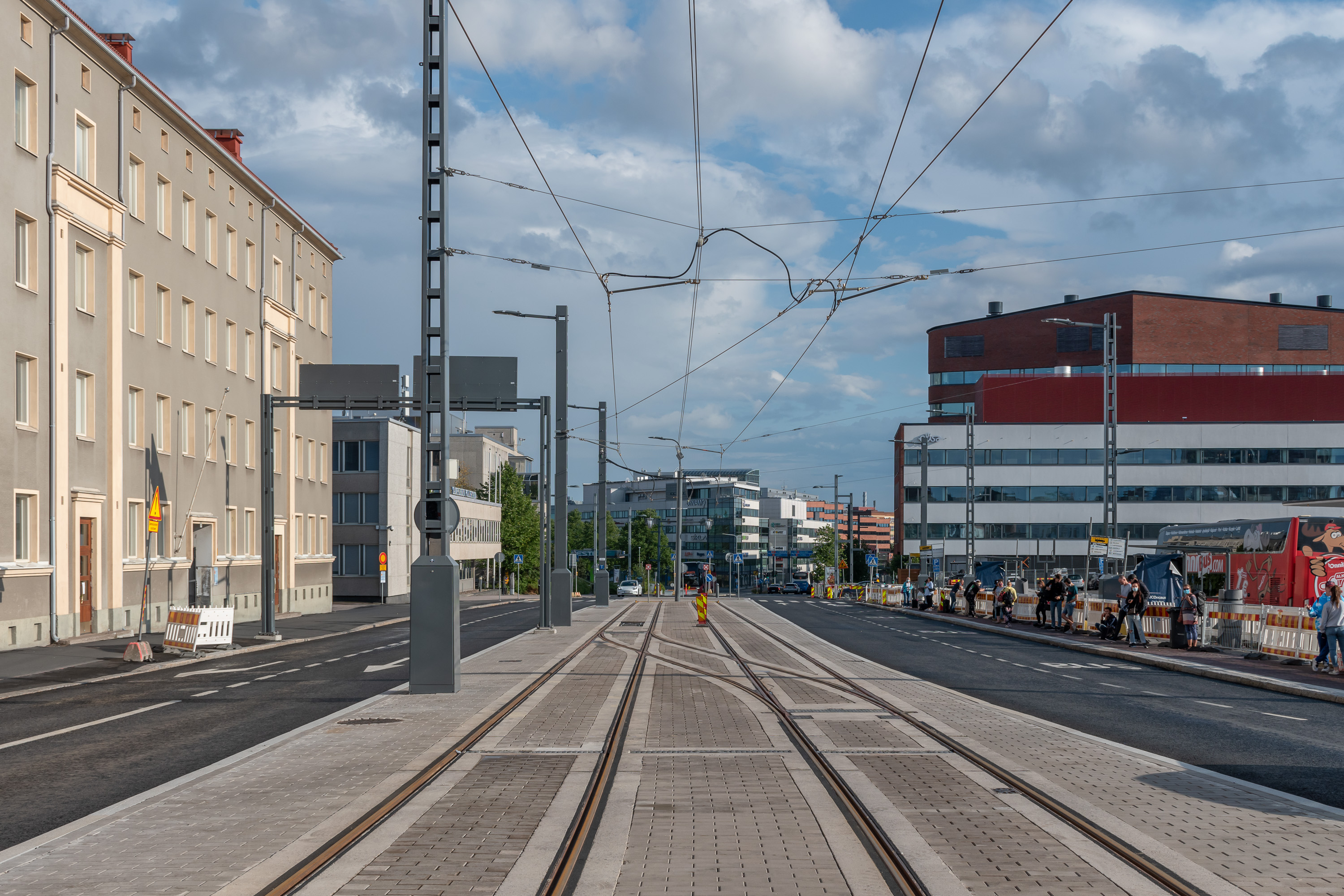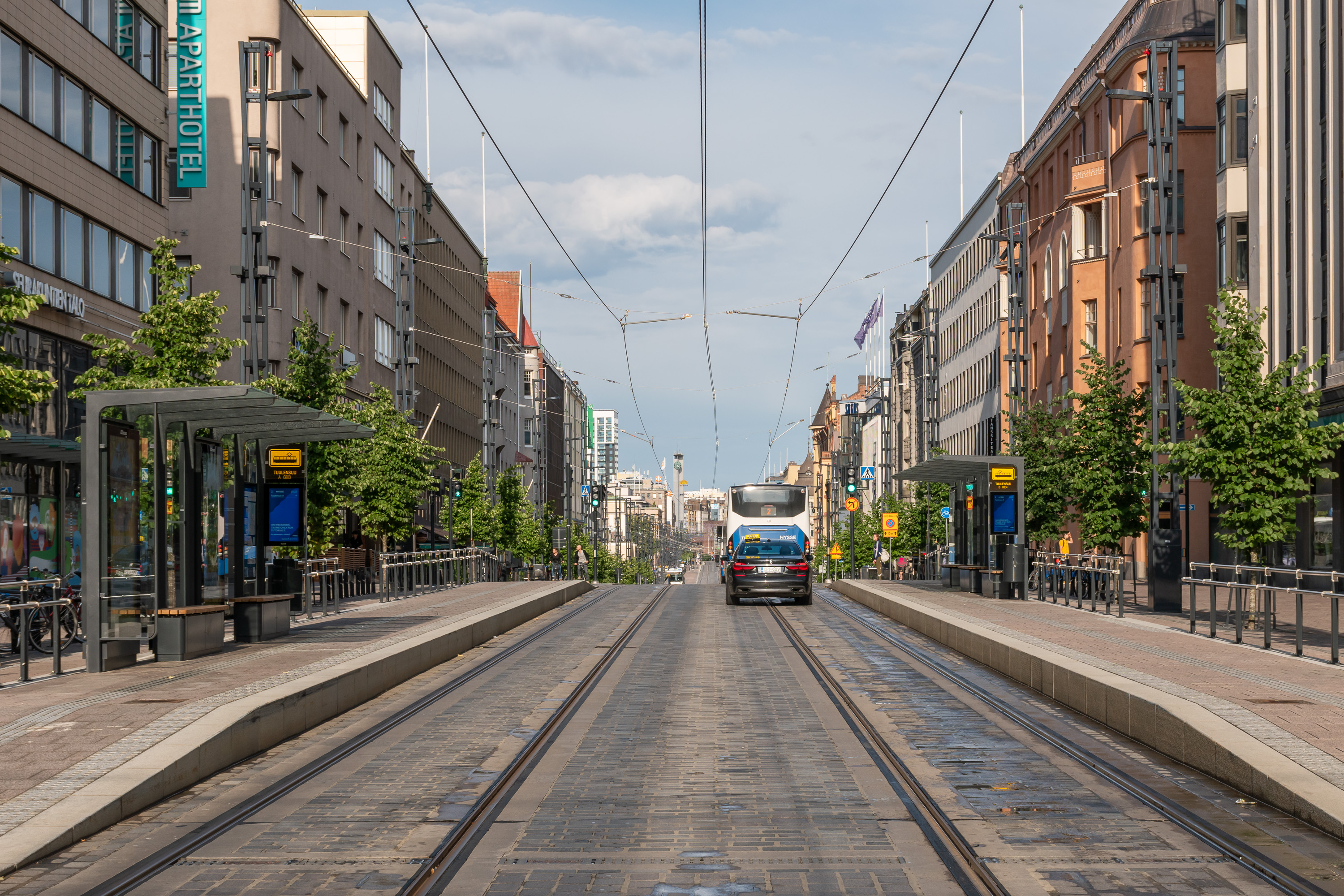87. Здесь, кстати, вышло немного проблемное место после строительства трамвая; там, где стоят автобус и машины на фото, в сторону центра на Итсеняйсююденкату, сейчас стал светофор короткий и по утрам по будням, говорят, собираются пробки, хотя это одно из важных направлений въезда в центр. Может, можно как-нибудь светофоры перенастроить, не знаю; тут даже и пересечений с трамваем-то ведь нет.