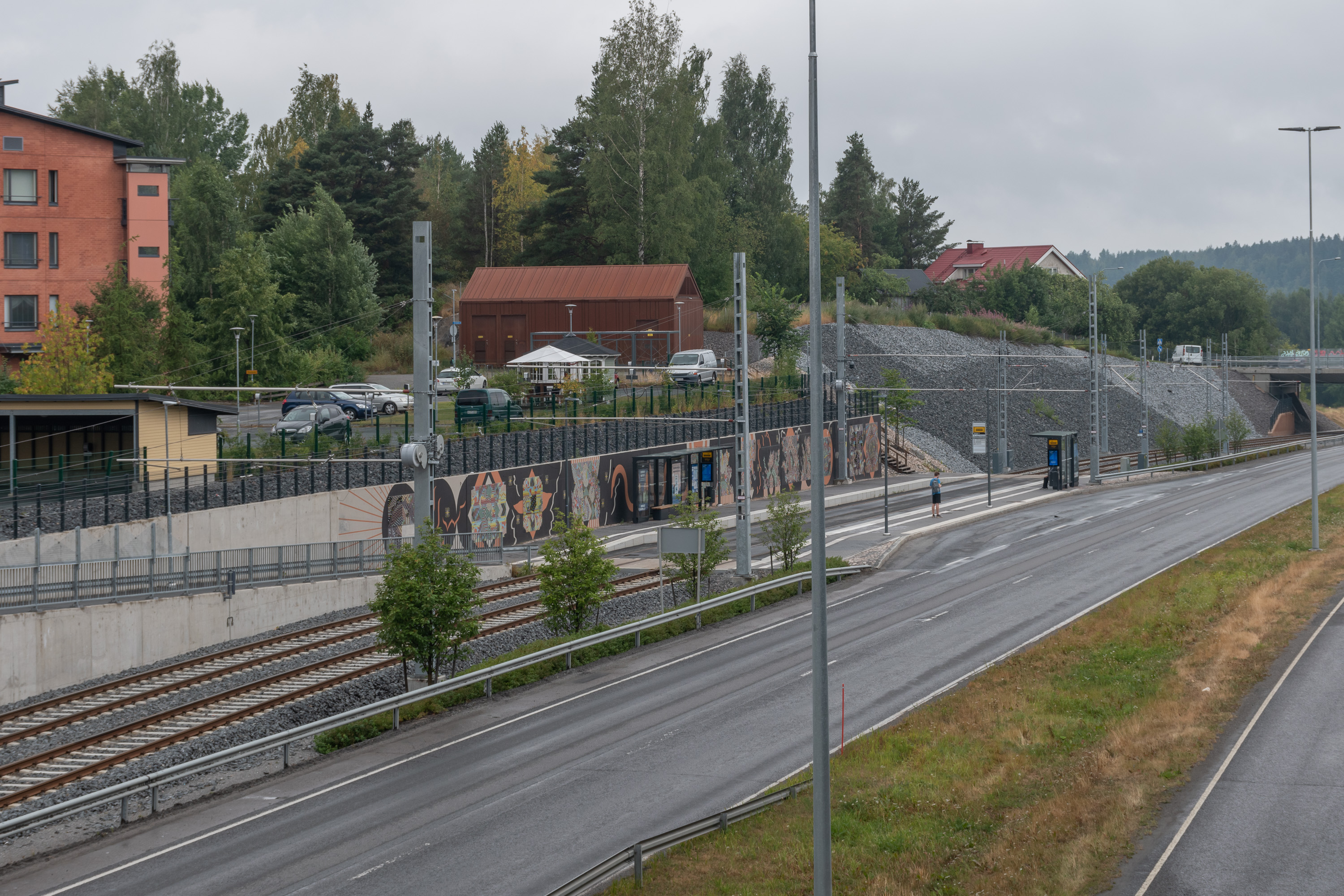 48. Остановка Turtola. Здесь тоже пришлось немного срыть склон, чтоб влез трамвай, зато на подпорной стенке сделали какую-то абстрактную, но симпатичную мозаику. Пересадка с/на автобусы в сторону Херванты с той же платформы, а вот на автобусы в сторону центра — придется прилично пройти по надземному переходу.