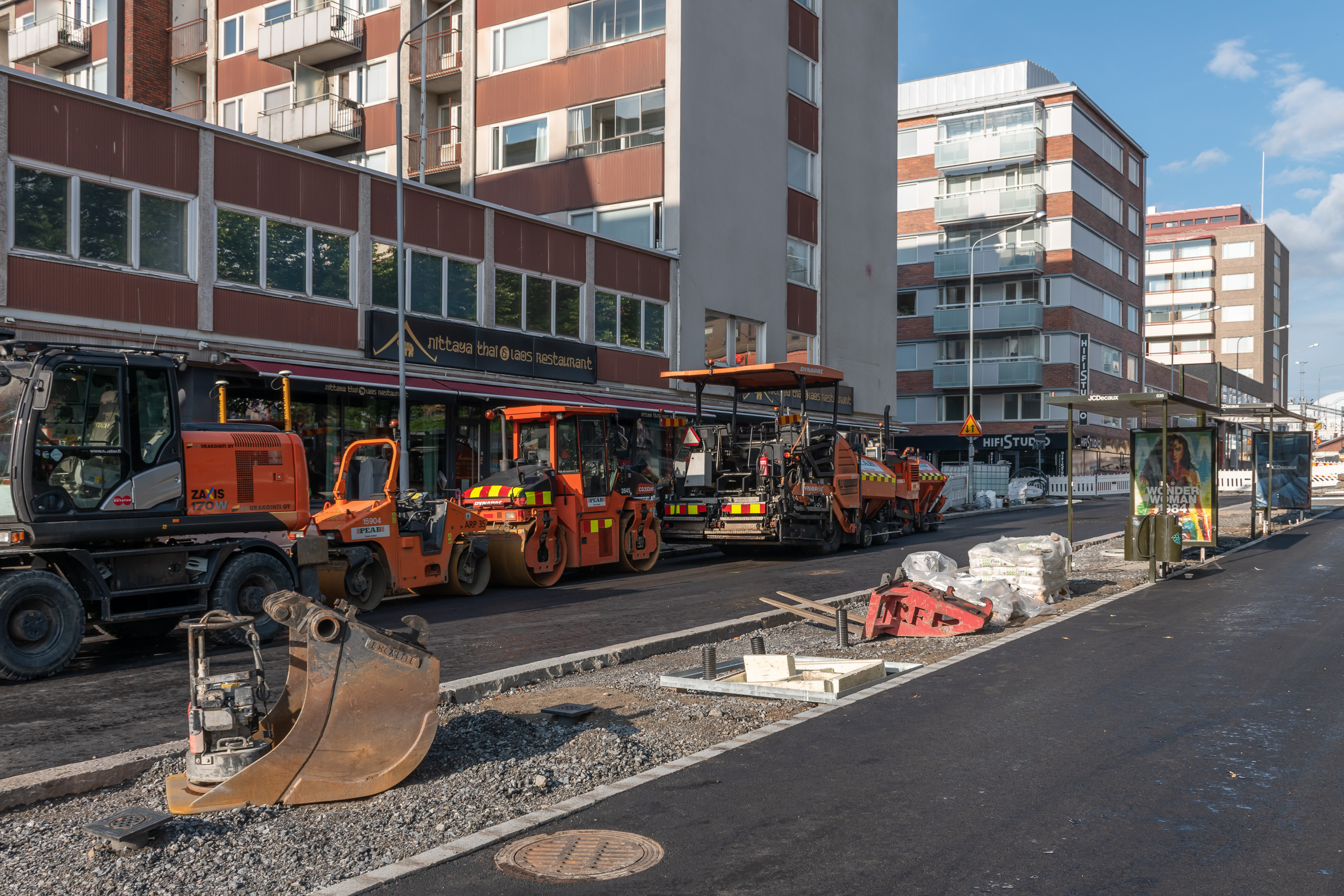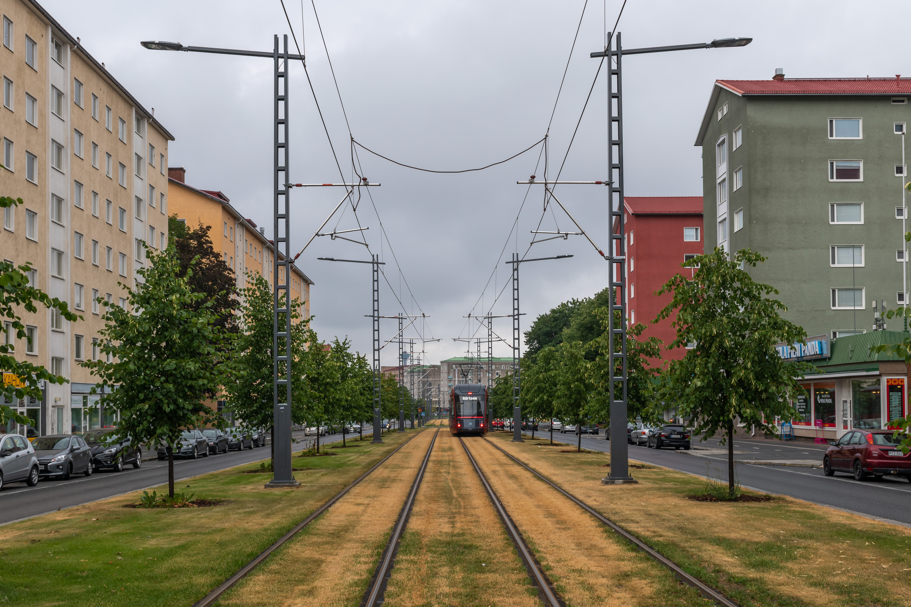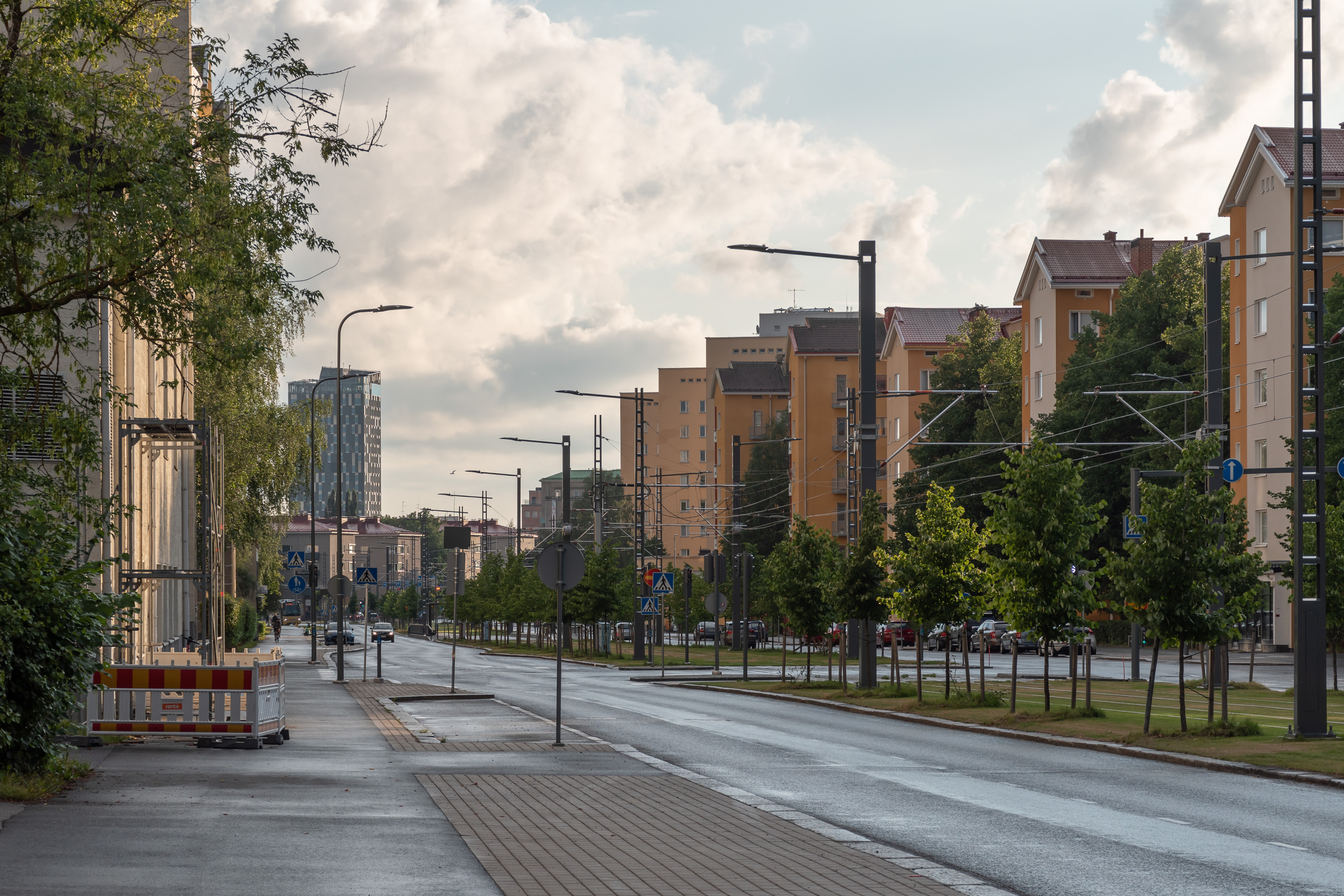 35. Центральная улица Калевы — Саммонкату (Sammonkatu, фин. улица Сампо) — сейчас представляет собор бульвар с трамвайными путями на зеленой разделительной полосе. Получилось довольно приятно, и молодые деревья тут не выглядят непропорционально мелкими. Посередине — газон (выгоревший на солнце — июнь-июль выдались очень жаркими). Для машин и автобусов осталось по одной полосе в каждую сторону по бокам бульвара. Для автобусных остановок и поворота налево выделены карманы (хотя после официального запуска трамвая тут вроде бы не останется ни одного автобусного маршрута). Для кратковременной парковки есть парковочные места там, где их было возможно сделать.