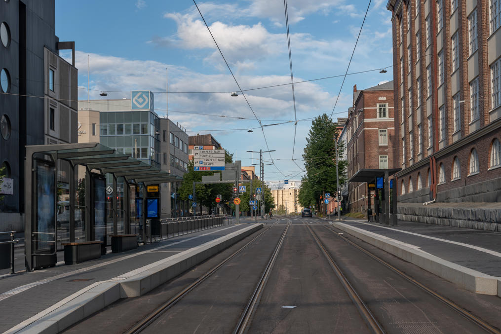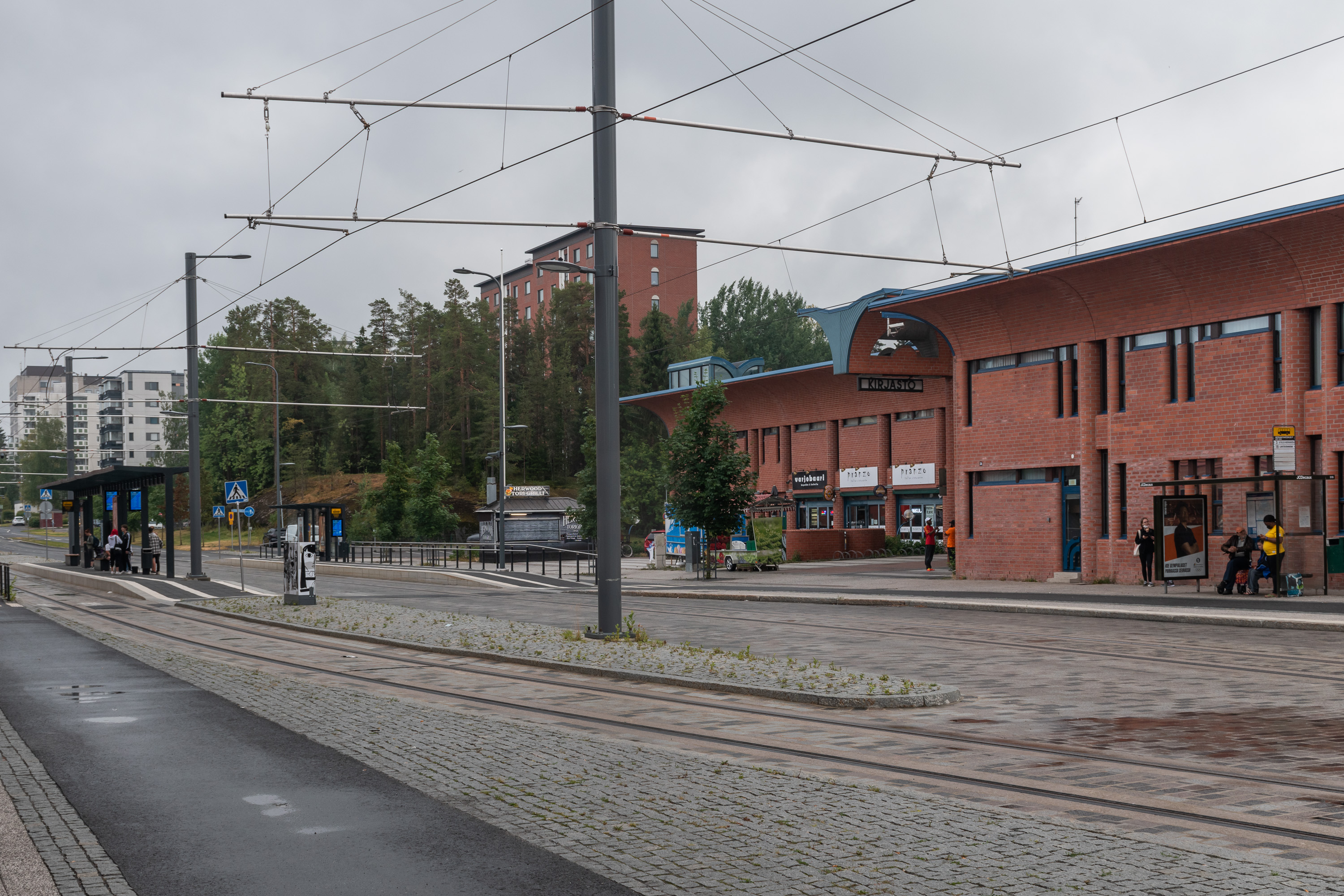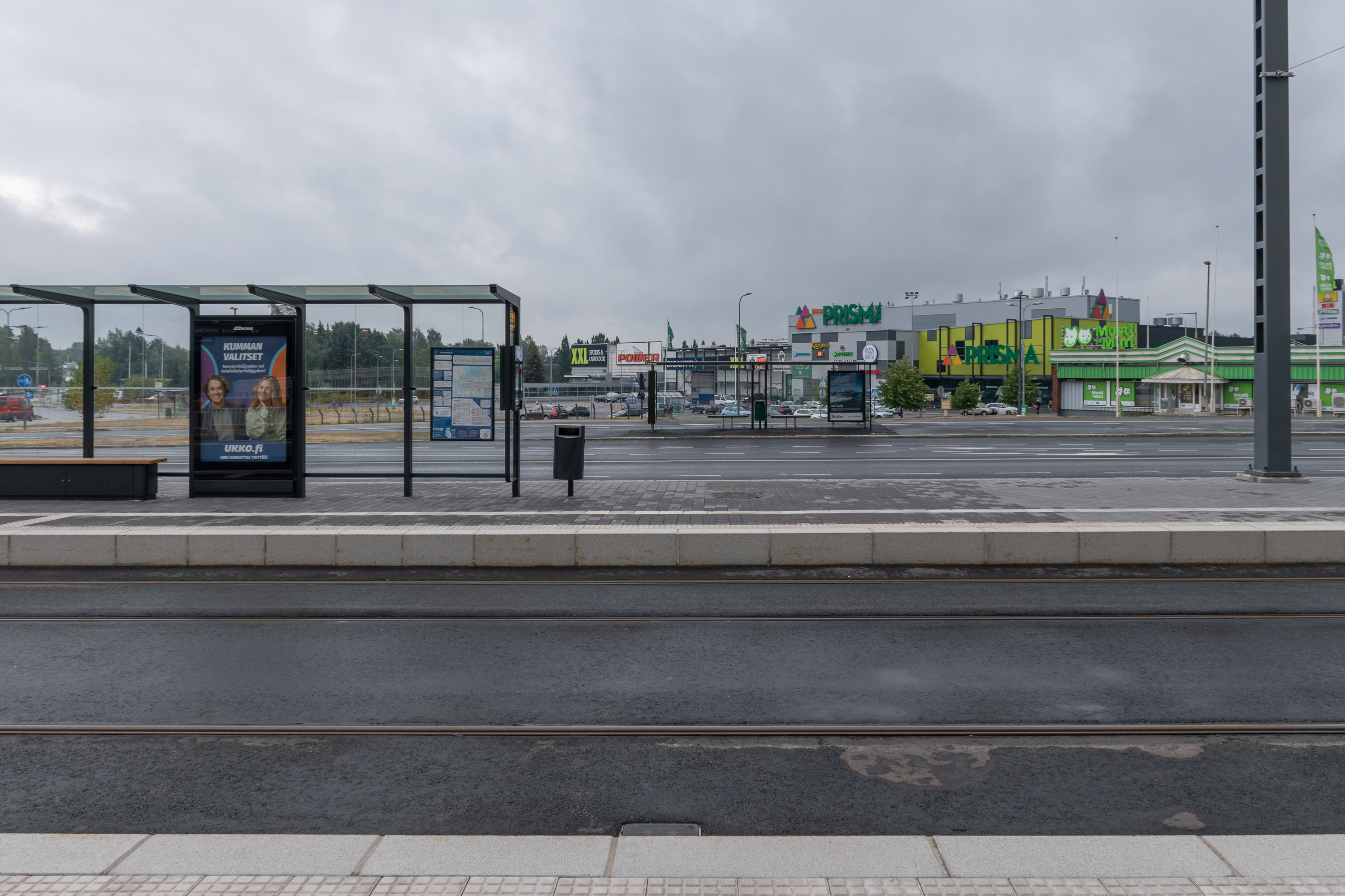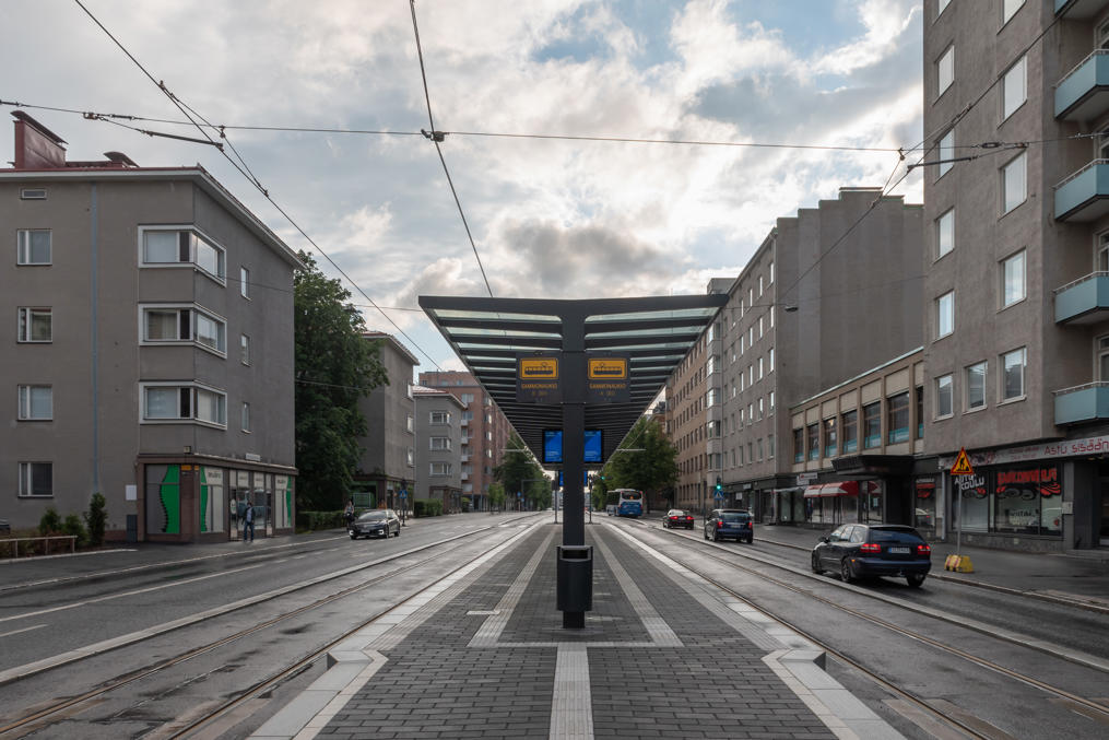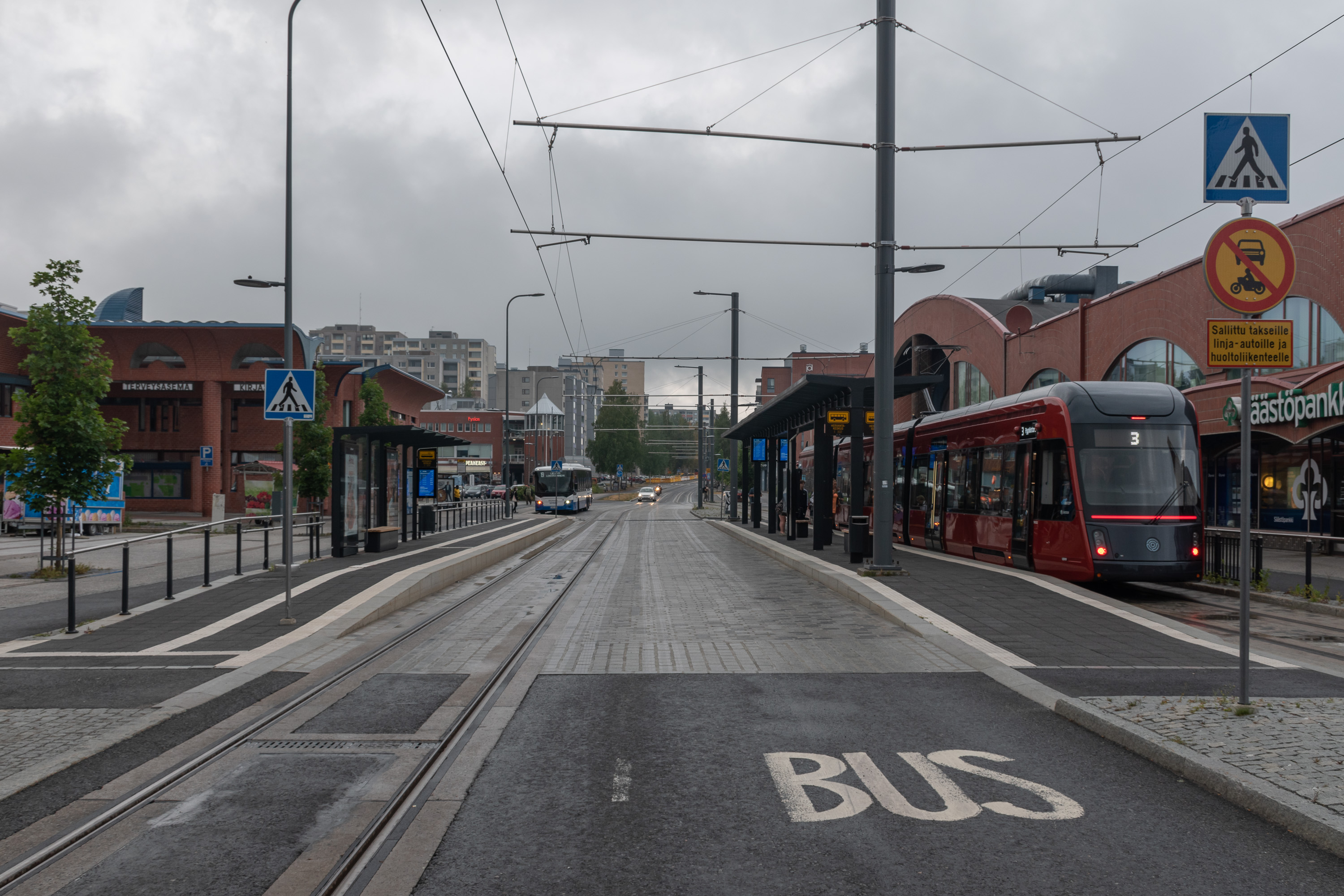 60. Остановка Opiskelija (Студент; рядом проходит Студенческая улица, Opiskelijankatu, но остановка почему-то называется просто "Студент"). Здесь посадка на трамваи и автобусы производится с одних и тех же платформ. Автомобилям въезд на этот участок улицы запрещен.
