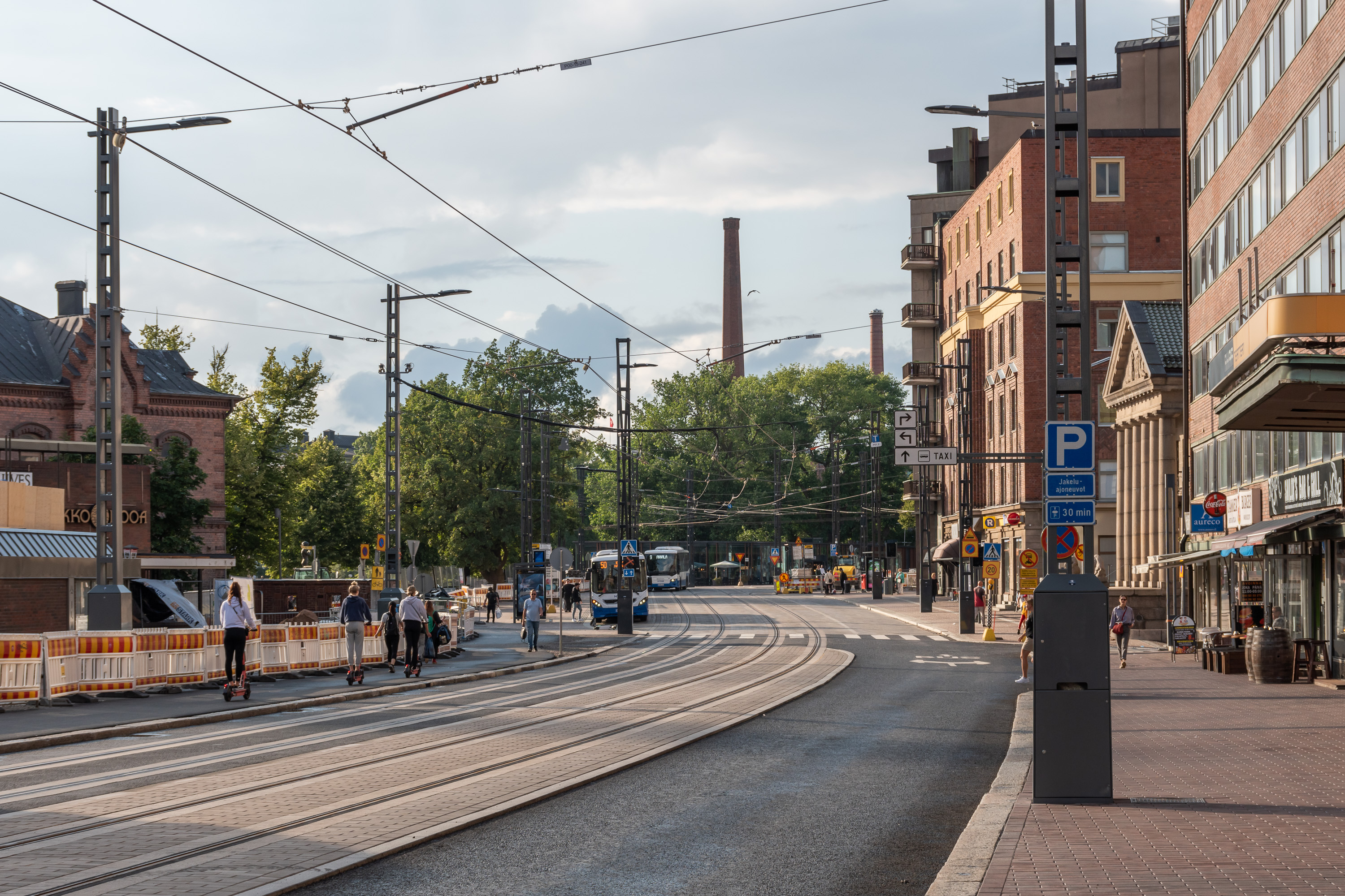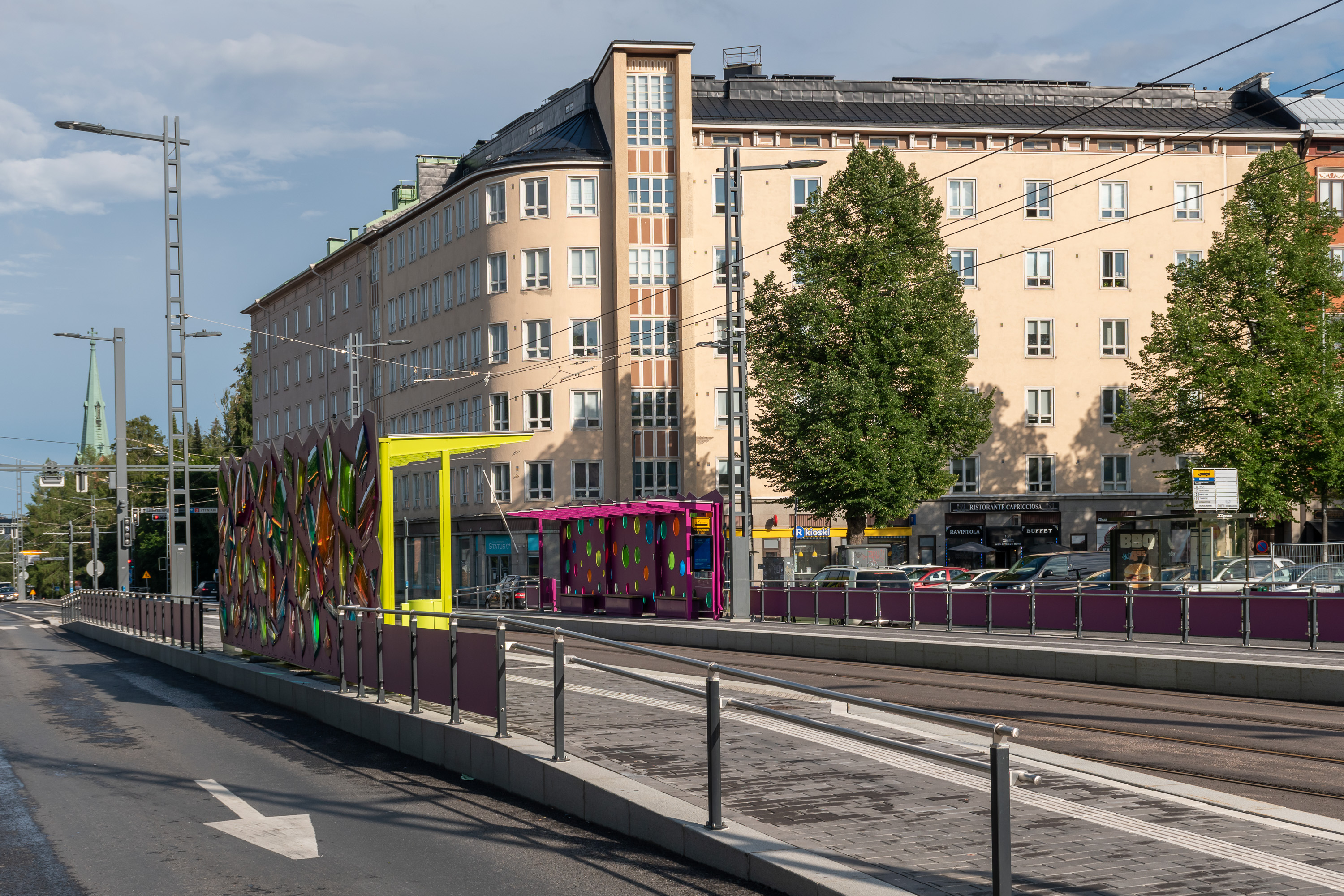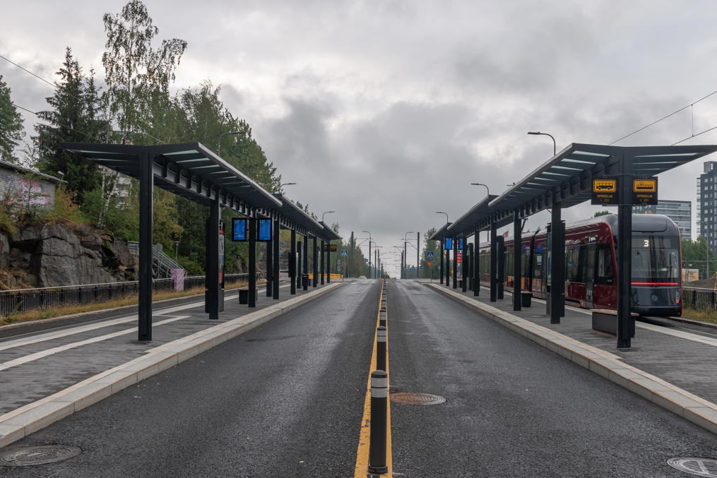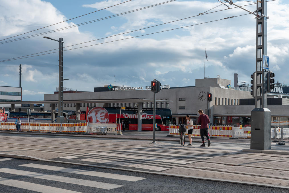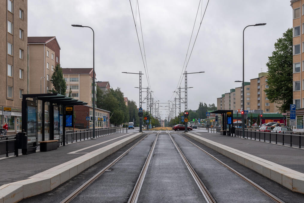 60. Остановка Opiskelija (Студент; рядом проходит Студенческая улица, Opiskelijankatu, но остановка почему-то называется просто "Студент"). Здесь посадка на трамваи и автобусы производится с одних и тех же платформ. Автомобилям въезд на этот участок улицы запрещен.