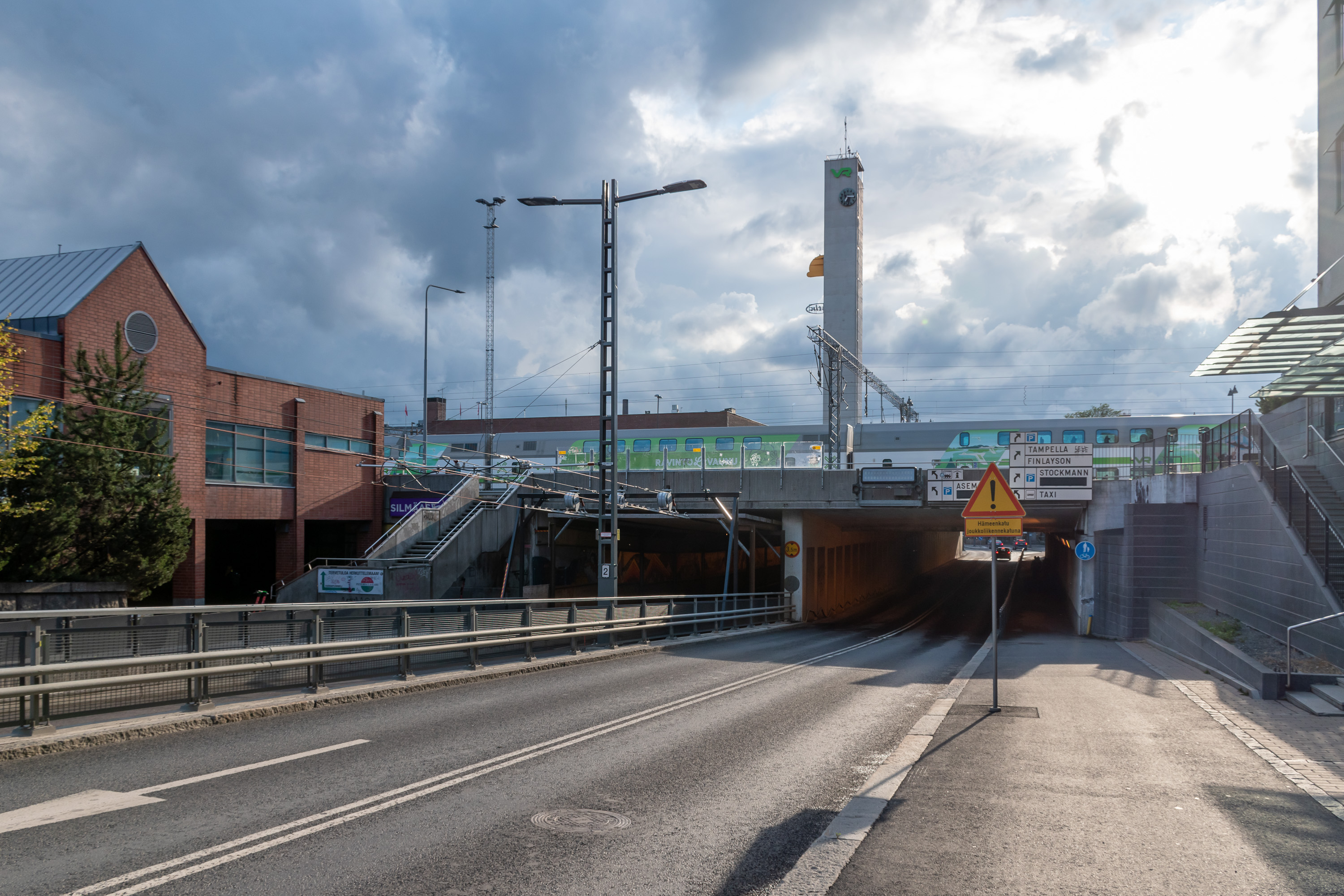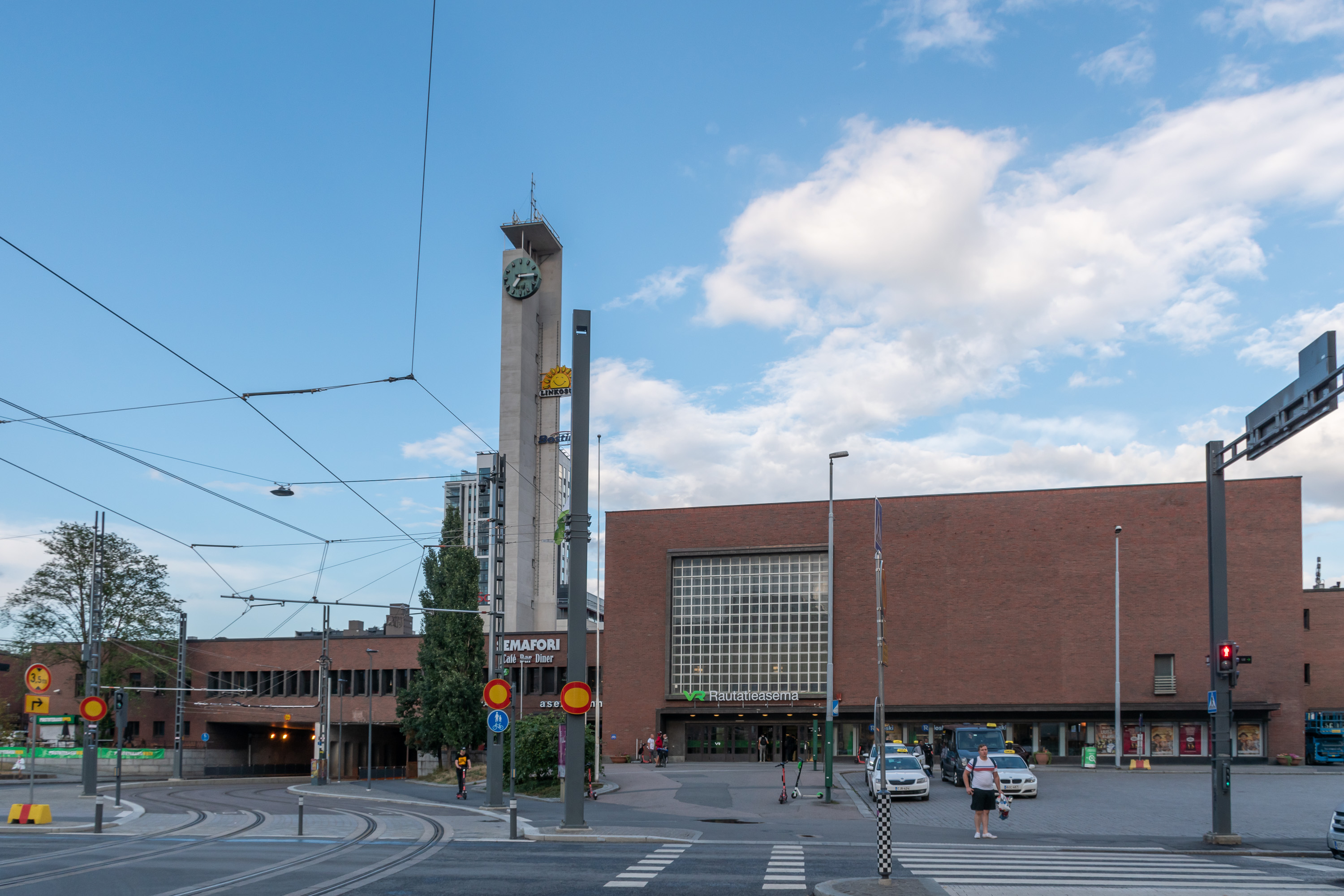 Нынешнее функционалистское здание вокзала построено в 1936 году вместо старого деревянного. Было бы симпатичнее, если б на башню с часами не вешали вывески пары кафе, но и так неплохо. Железная дорога, как и протока Таммеркоски, идет с севера на юг и является естественным препятствием для транспорта и городской застройки. Фактически она ограничивает центр города с востока. Один из проколов под железной дорогой — здесь, встроен в здание вокзала, и через него же пропущена теперь трамвайная линия.