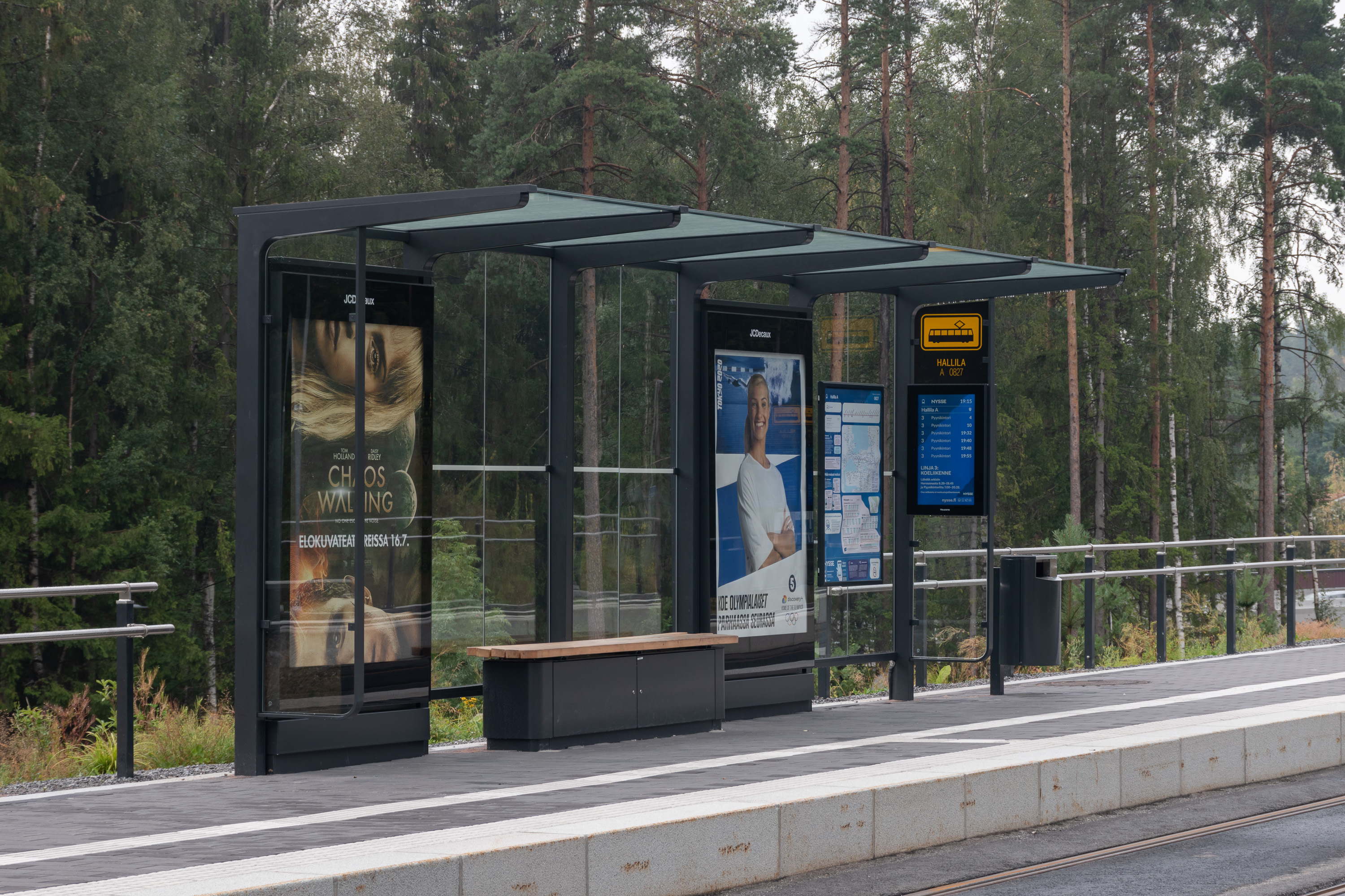 54. Павильон остановки Hallila. Все остановки трамвая оборудованы табло, даже не особо людные.