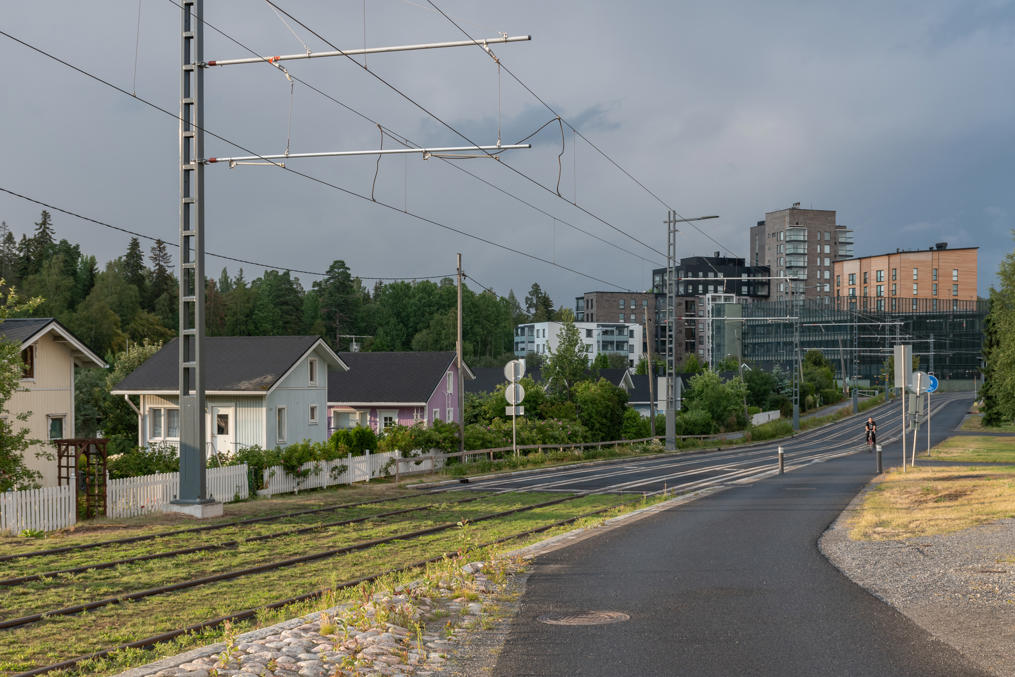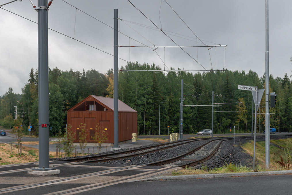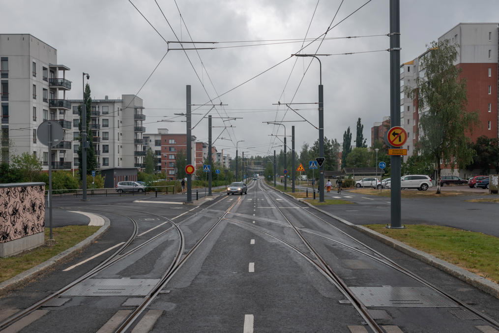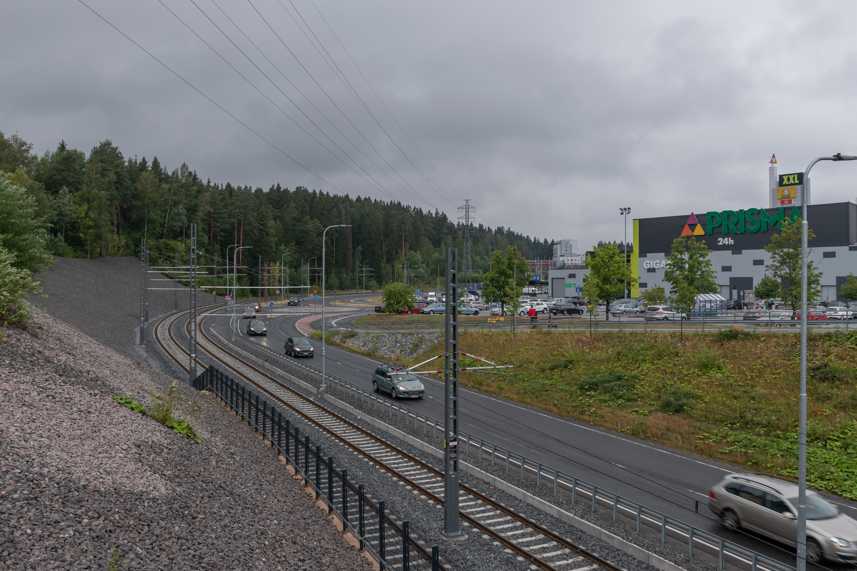 61. А дальше, на подъезде к центру Херванты, начинается первый совмещенный участок, где на рельсы могут выезжать и автомобили. Здесь поток достаточно невелик, чтобы практических проблем это не создавало. Слева виден главный районный ТЦ Duo с несколькими супермаркетами.