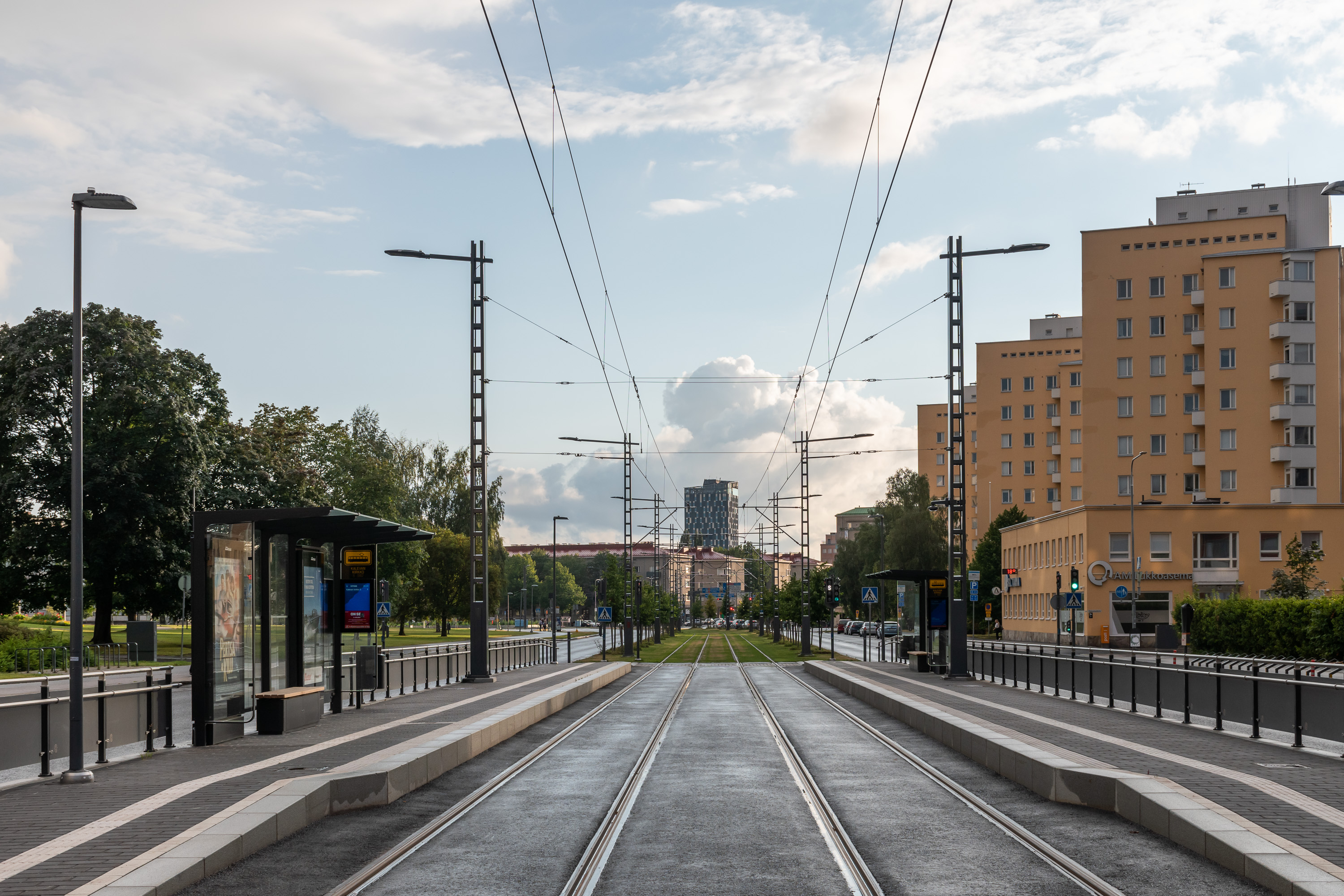 32. За следующим перекрестком трамвайные пути, шедшие с краю улицы из-за туннеля под ж/д, перемещаются в середину проезжей части. Как и на Пирканкату, раньше это была четырехполосная улица, где две полосы были выделенными для автобусов.