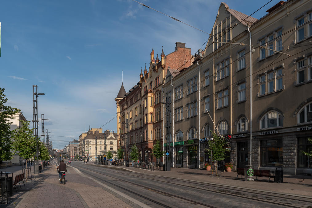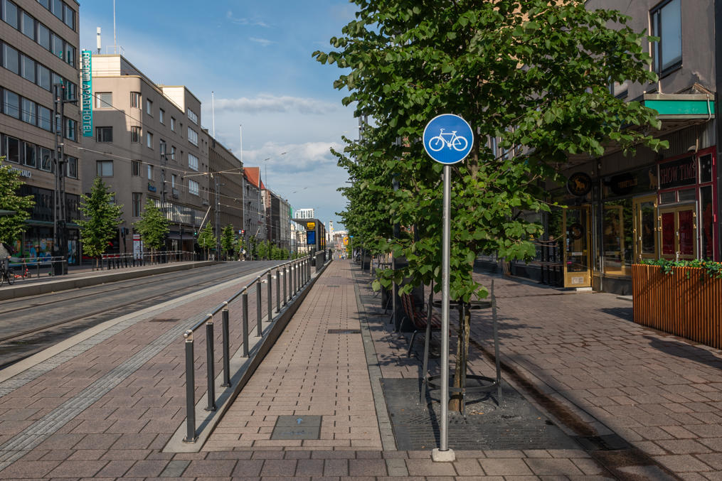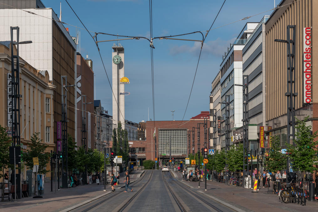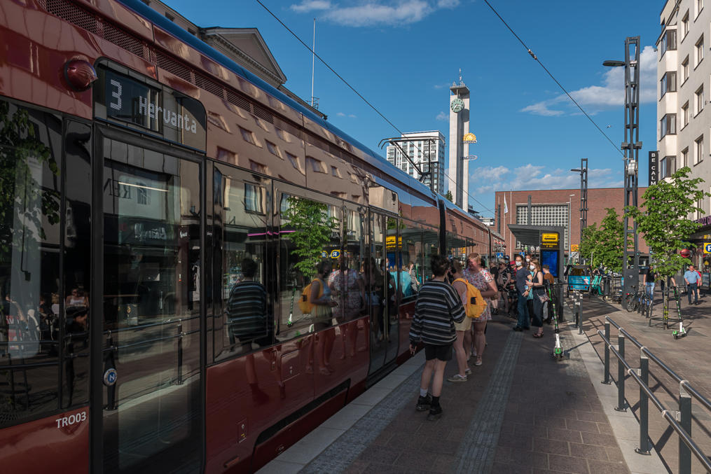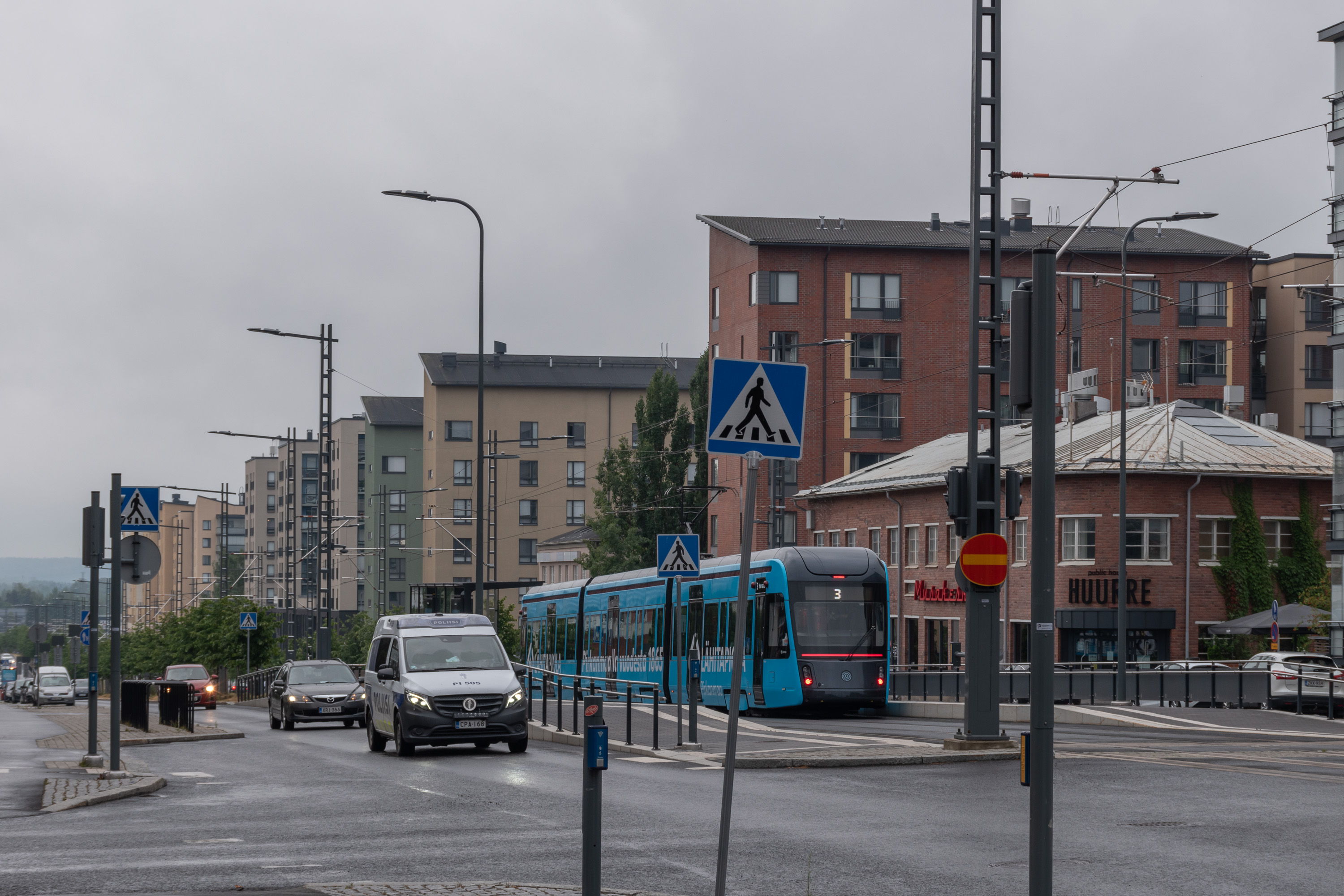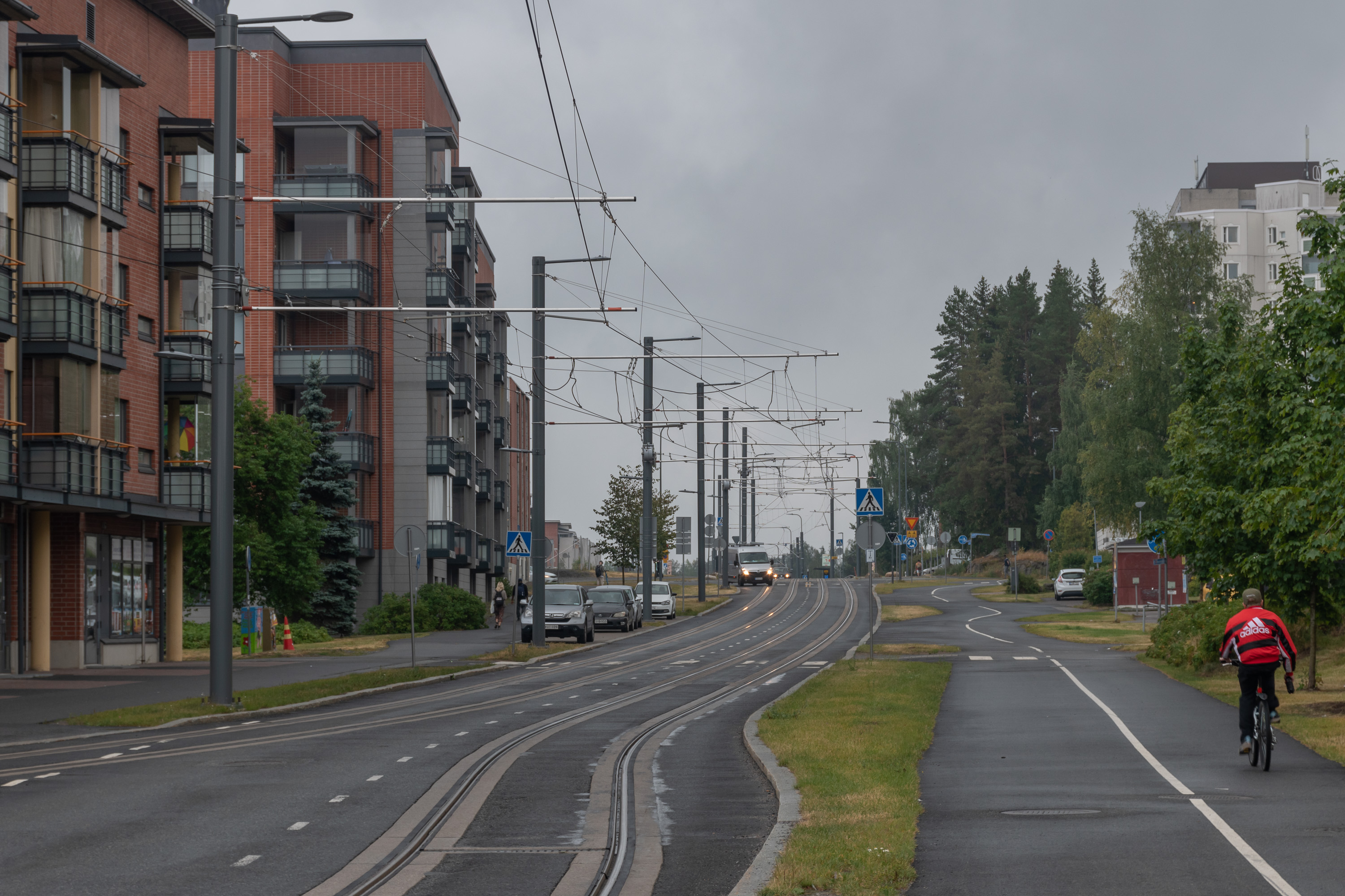 Очень медленно трамвай ползет по центральной улице Хямеэнкату, 20 км/ч, даже меньше по факту, и, честно говоря, не могу сказать, чтоб я был в восторге от результатов реконструкции этой улицы в трамвайно-автобусно-пешеходную. Между проезжей частью с трамвайными путями, велодорожками и тротуарами недостает разделения; поребриков у проезжей части почти нет, а велодорожки выделены очень слабо (мощением слегка другого цвета), да еще и не полностью прямые, а чуть смещаются для обхода трамвайных остановок и т. п. Та же Алексантеринкату в Хельсинки поудачнее, как по мне.