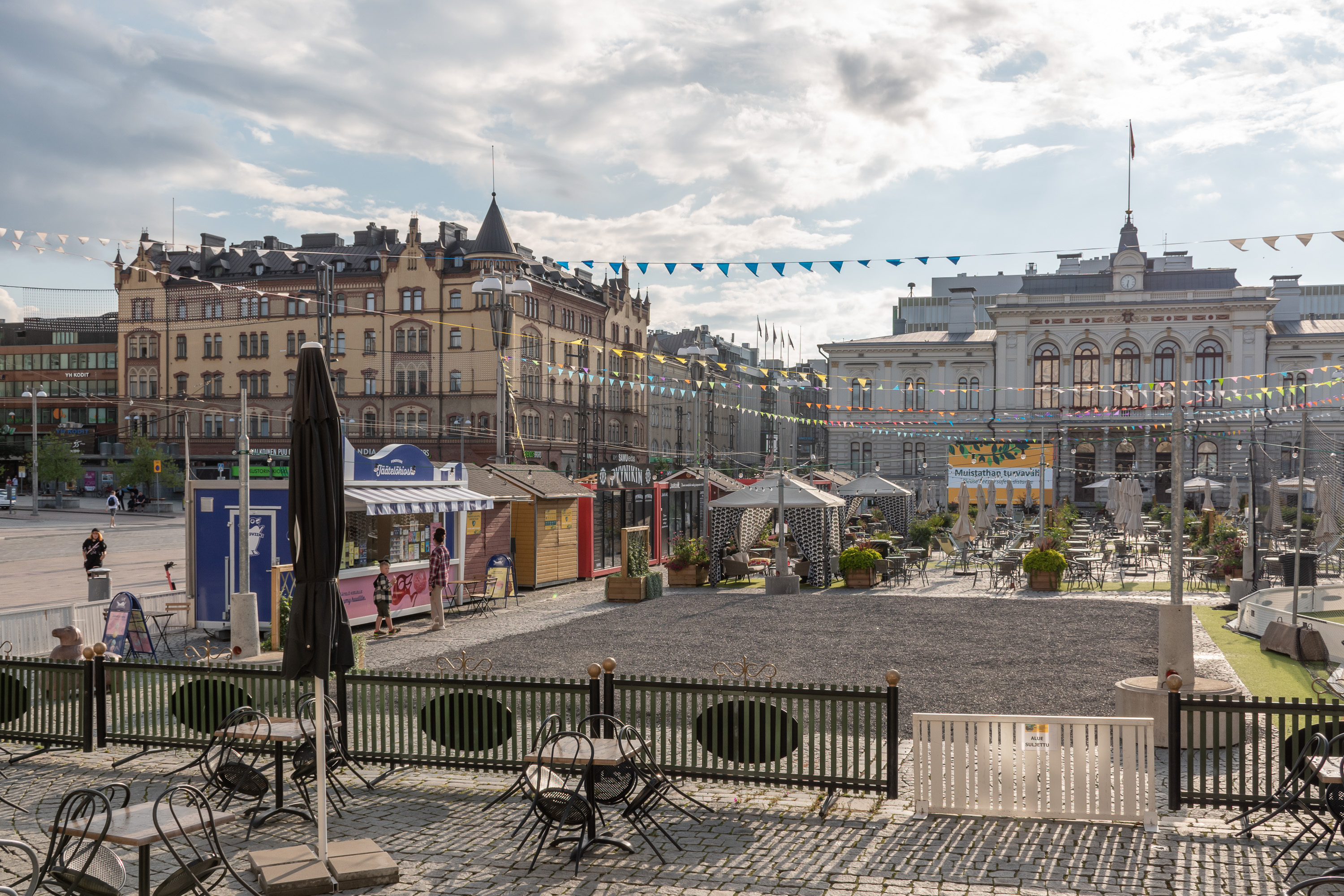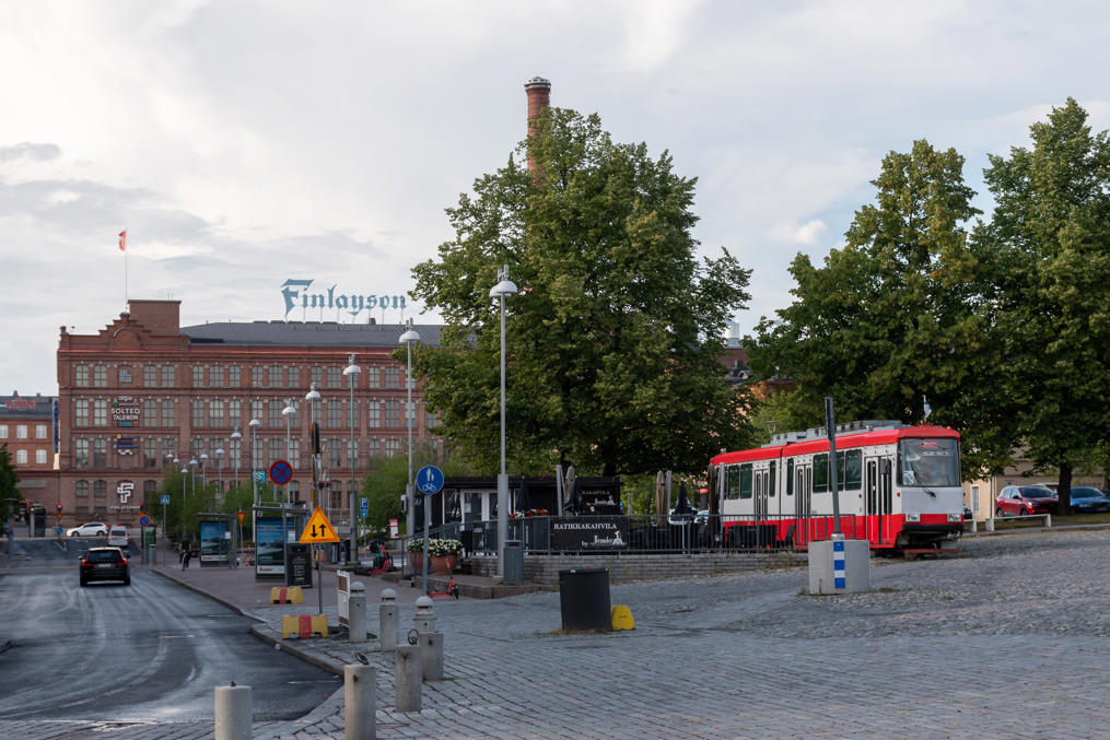 24. Одно из недействующих предприятий виднеется севернее площади — текстильная фабрика Finlayson. Сейчас там кинотеатр, рестораны, музей и прочий культур-мультур, а также офисы. В Тампере остается предостаточно промышленности подальше от центра, но то, что было в центре, в основном закрылось без остатка; Finlayson остается одной из самых известных финских марок, но их продукция сейчас делается в основном в Турции, в меньшей степени в некоторых странах Континентальной Европы. Но больше в глаза бросается на этом фото, конечно, трамвай. На самом деле он особенно не связан с тамперским трамваем; это просто "Трамвайное кафе", а сам вагон, построенный когда-то в 1974 году на заводе Valmet в Тампере, всю жизнь работал в Хельсинки, и сюда был привезен (и перекрашен в старые хельсинкские цвета) для этого кафе в 2019 году, на волне, так сказать, трамвайного энтузиазма.