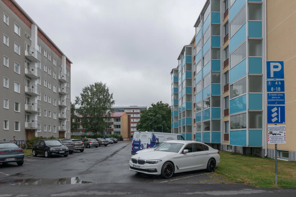 39. Мне на самом деле очень нравится этот финский послевоенный функционализм, строго, но эстетично. Собственно, основная часть Калевы, построенная с конца 1940-х до начала 1960-х, занесена в реестр Культурных территорий застройки государственного значения (RKY) наряду с такими значимыми местами, как, к примеру, центр и старые заводы Тампере. Особенностью жилых районов 1950-х, однако, является то, что выделенных на каждый дом парковочных мест в них очень мало; массовая автомобилизация страны тогда еще не началась. Поэтому в Калеве много таких вот муниципальных парковок, где парковаться свободно могут прописанные в районе жители по специальному разрешению (и не на выделенном месте, а где получится), а для остальных по будням днем действует ограничение по времени в 4 ч.