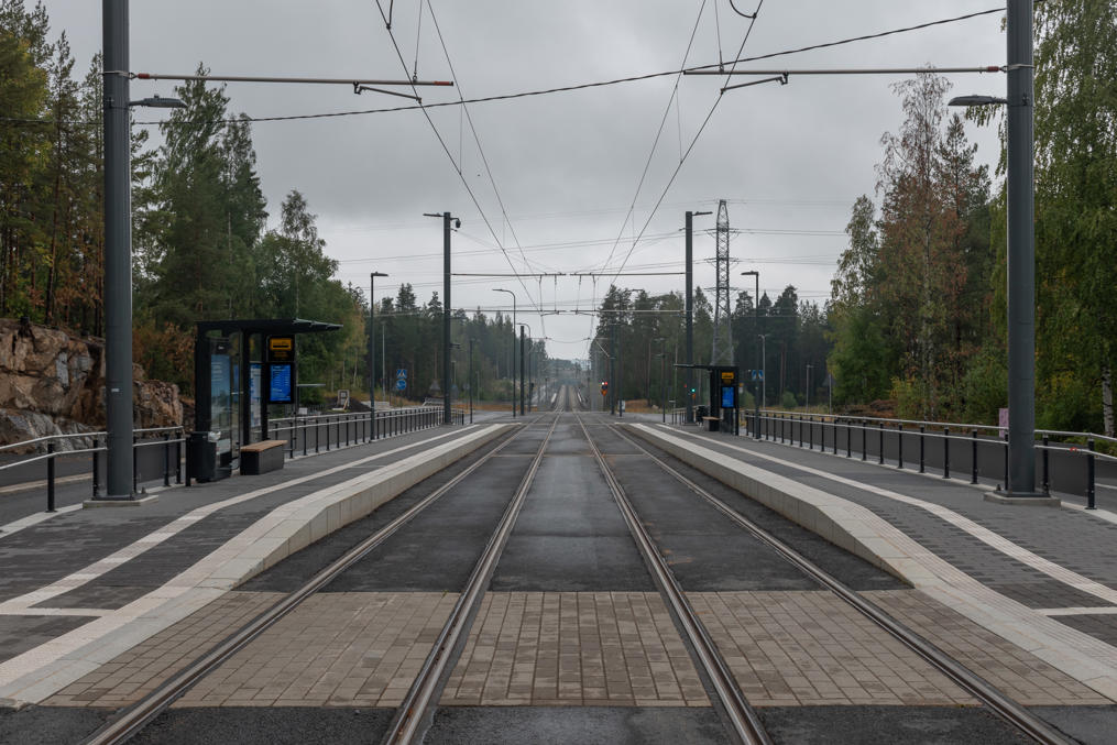 100. Далее трамвай обходит комплекс больницы TAYS с юга, параллельно дороге Тейсконтие, которая на этом участке уже является вылетной магистралью (Национальной трассой 12), идущей в сторону пригорода Кангасала и города Лахти.