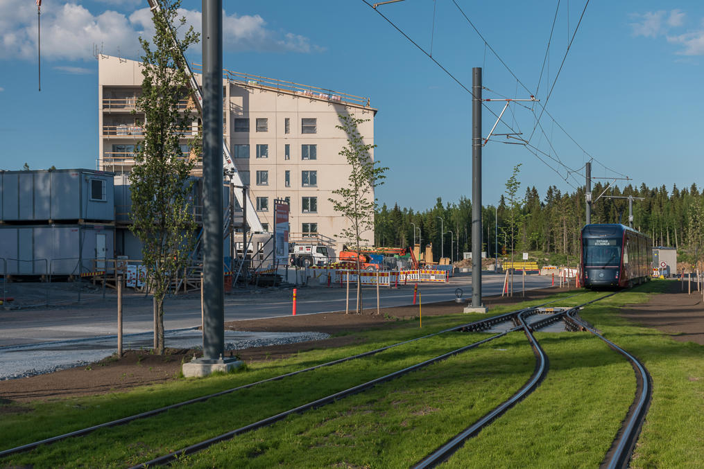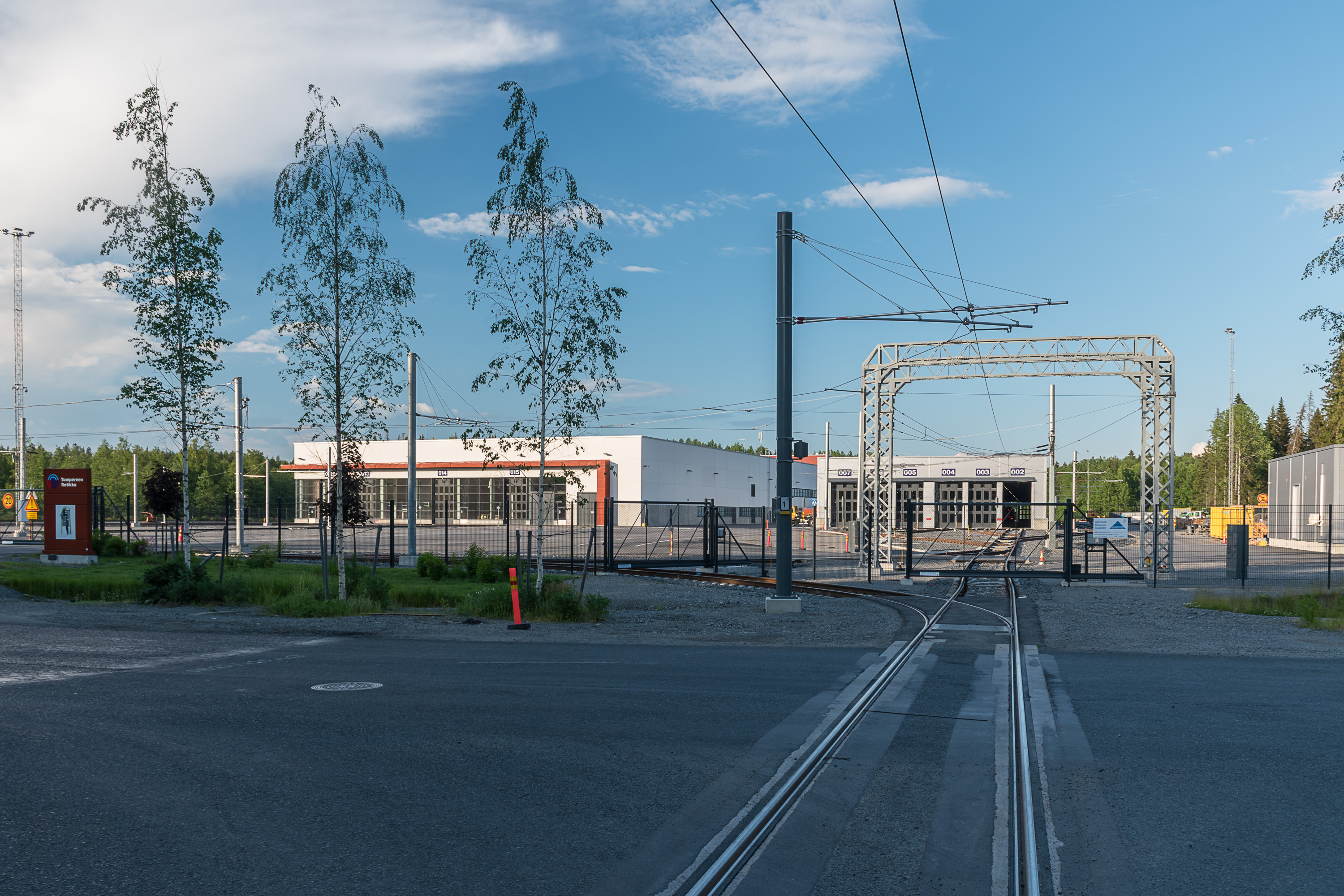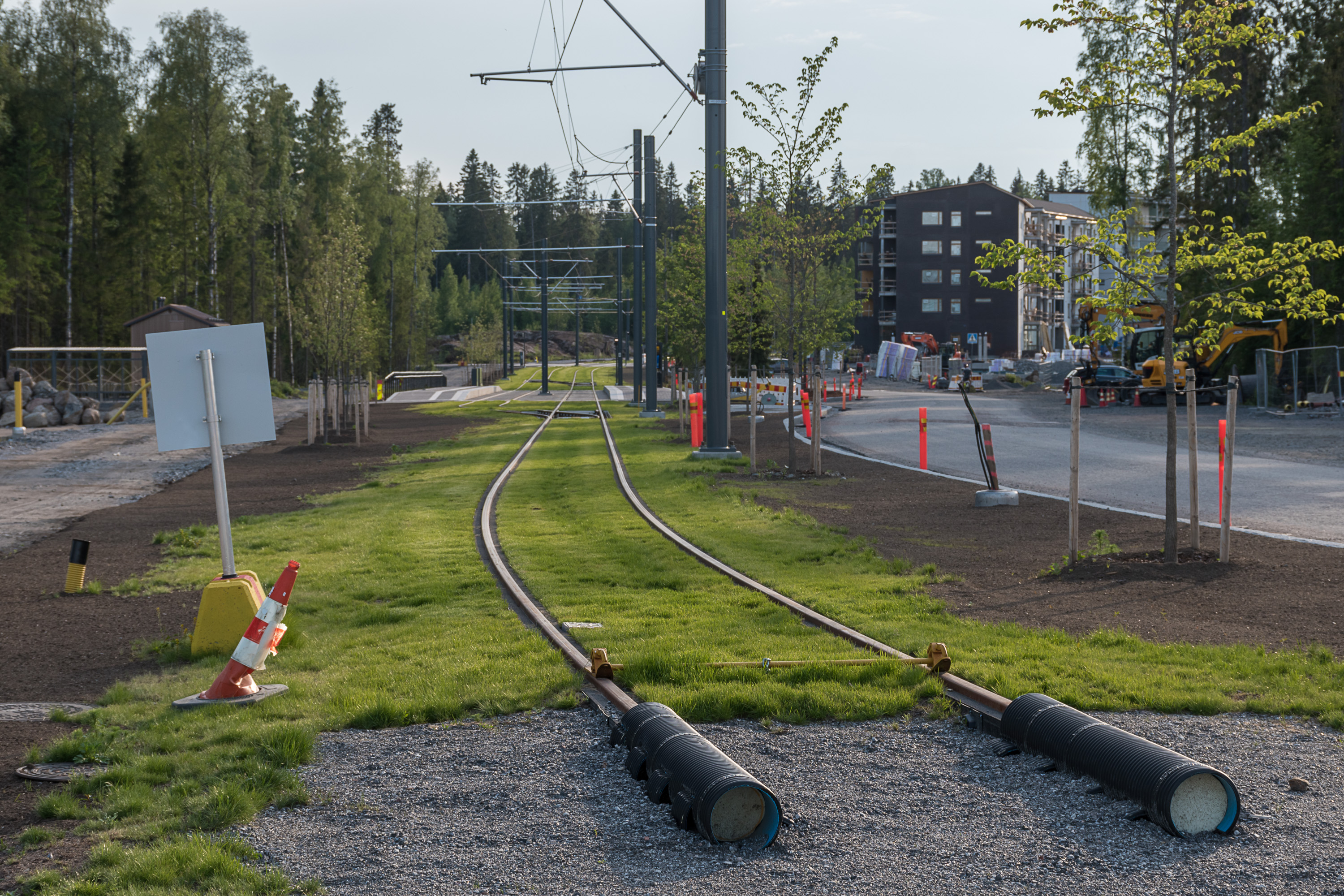 10. И отправляемся мы по направлению из центра, от конечной Пююникинтори (Pyynikintori, фин. площадь Пююникки; Пююникки — крутая гряда/лесопарк к западу от центра Тампере). Трамвай отошел в тупик для разворота. Сразу за тупиком начинается стройка — 2-я очередь строительства трамвая уже в процессе.