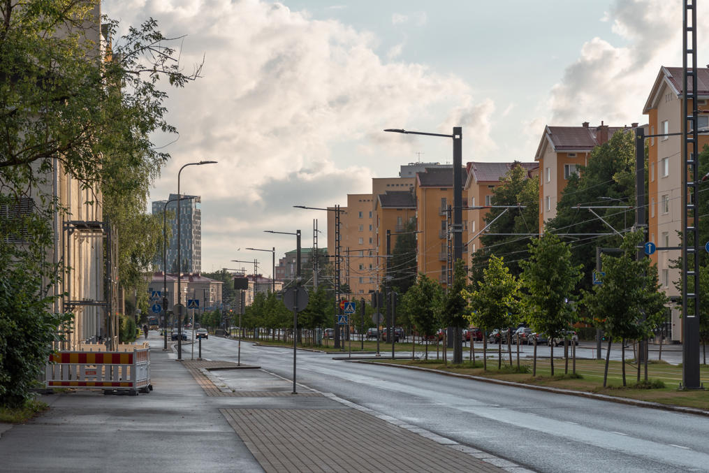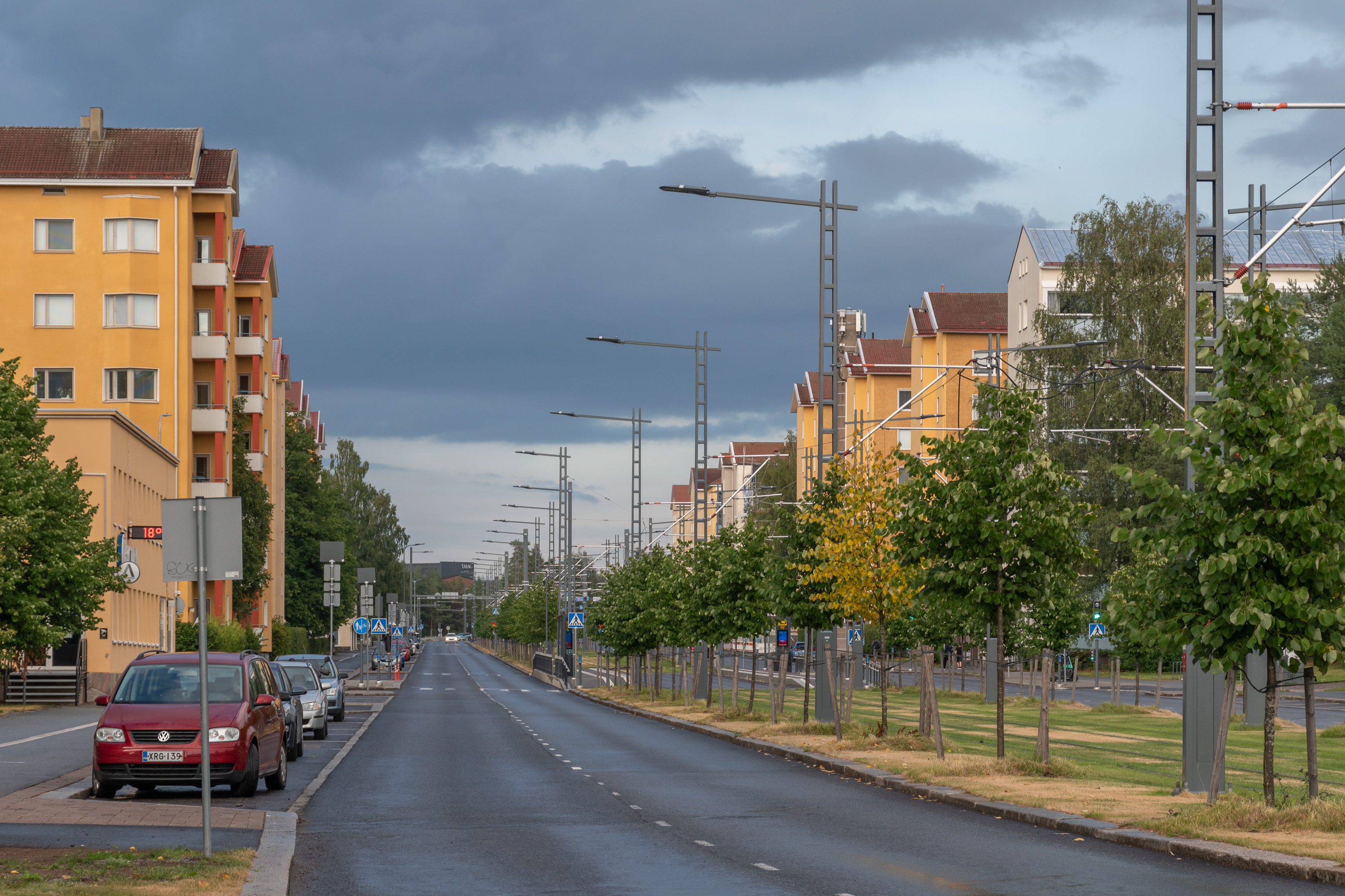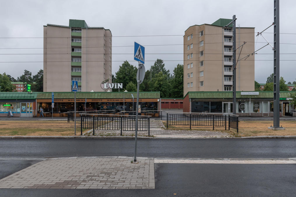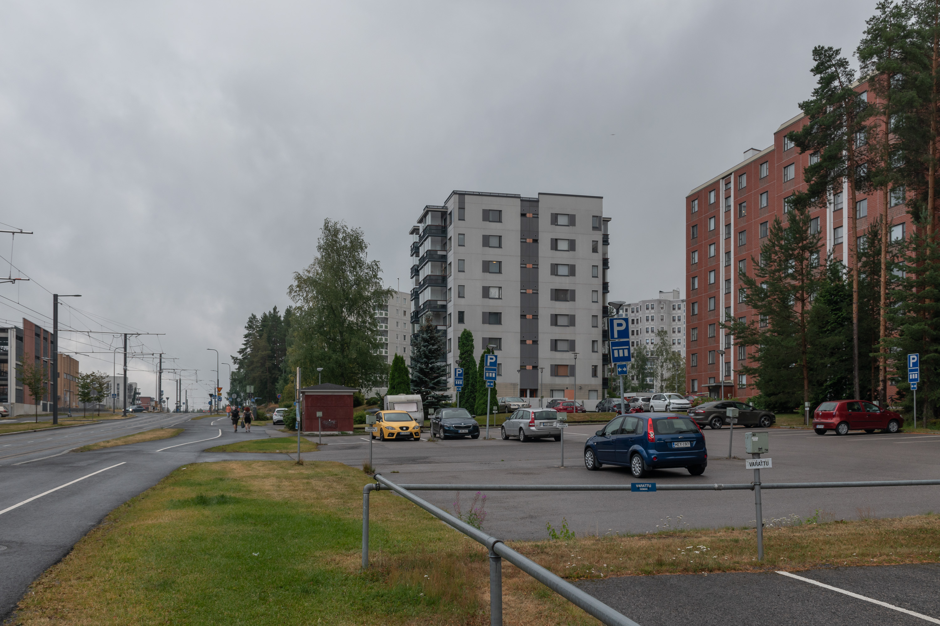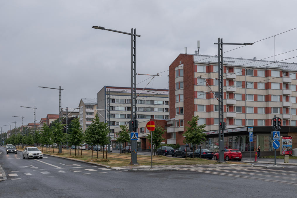 За стрелкой начинается жилой район под названием Калева (Kaleva) населением около 11 тыс. Это один из довольно редких в Финляндии крупных жилых районов 1950-х годов, построенных до начала массовой панельной микрорайонной застройки. Район весьма приятный, живой и пользующийся спросом. Здесь живет, например, нынешний премьер-министр Финляндии Санна Марин (точнее, как премьер-министр она живет в премьер-министрской резиденции в Хельсинки, но их собственная квартира с мужем — тут в Калеве). Две главные улицы Калевы — Тейсконтие и Саммонкату — развилкой продолжаются от улицы Итсеняйсююденкату, а между ними Калева начинается парком, посреди которого стоит церковь (на фото посередине на заднем плане). Она построена в 1966 году, и, как и многие другие модернистские церкви тех лет, на церковь внешне похожа мало, но мне нравится такая церковная архитектура.