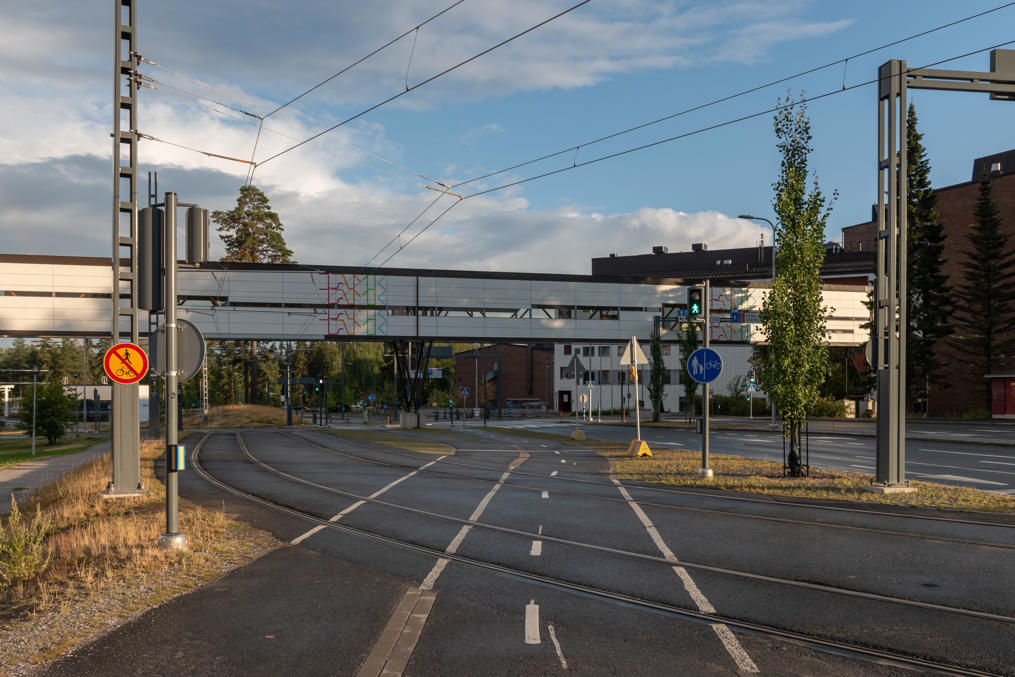 94. Трамвай пересекает дорогу Кеккосентие (Kekkosentie, фин. дорога Кекконена, в честь президента Финляндии в 1956-1982) — транзитную магистраль мимо центра города — по путепроводу, который украшен маленькими блестящими пластинками, подвешенными за ниточки — так что каждая пластинка колеблется на ветру отдельно и, когда проезжаешь внизу на машине, путепровод симпатично переливается на солнце.