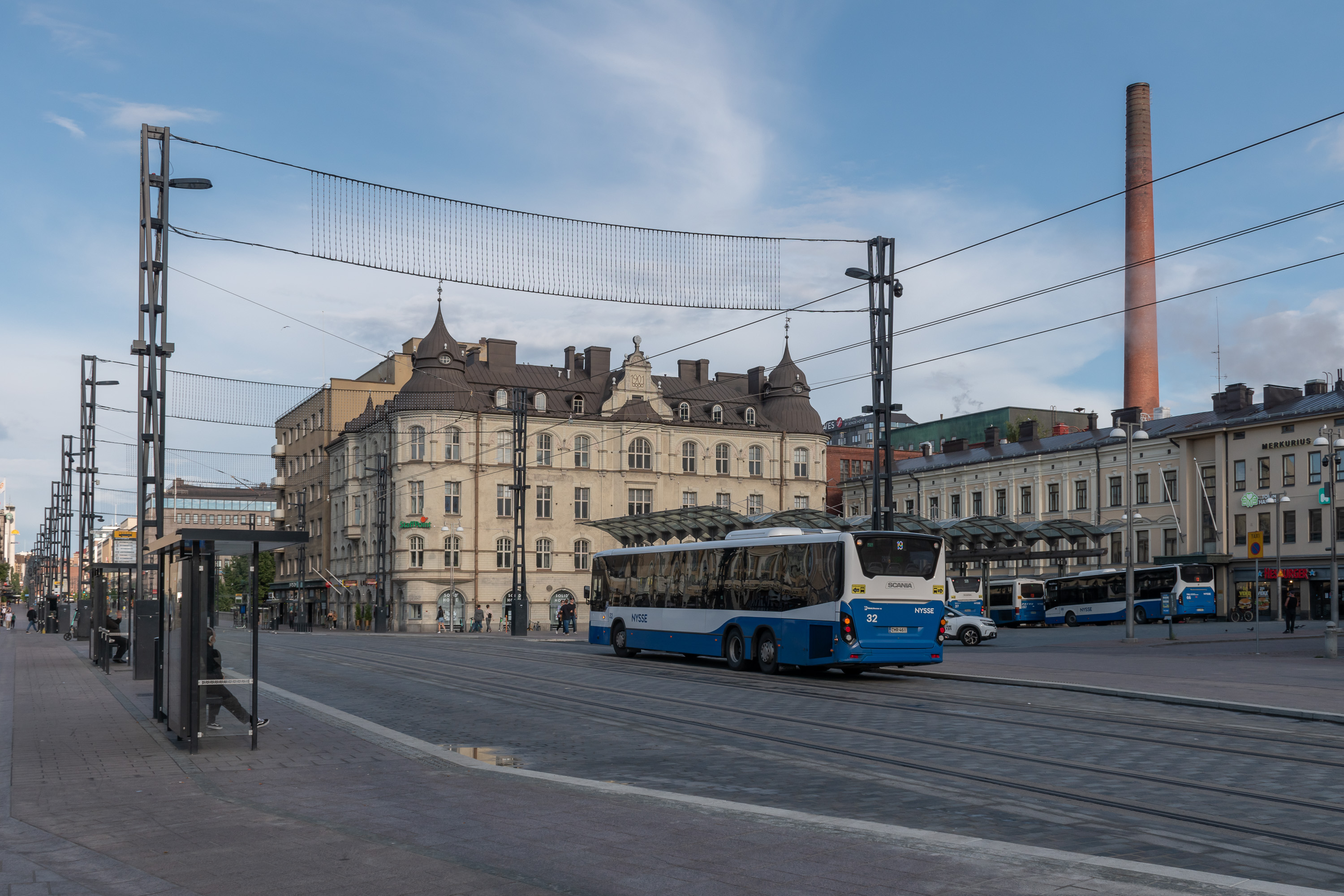 17. На улице длиной в километр устроено 4 трамвайных остановки. Выглядят они полностью одинаково, показывать их по отдельности смысла нет. На улице сохраняется также автобусное движение; хотя его объемы должны уменьшиться с запуском трамвая, все равно на центральной площади посреди Хямеэнкату находится автобусный терминал, откуда отправляются автобусы по различным направлениям в пригороды. Автобусные остановки не совпадают с трамвайными, а находятся рядом. Еще разрешено ездить такси, и в выделенные часы по утрам и вечерам — курьерским/почтовым машинам.