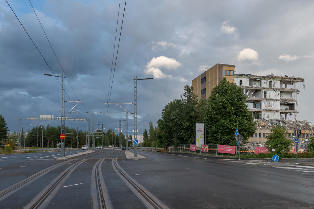 93. Улица дальше за развязкой переходит в вылетную магистраль, и трамвайные пути с нее уходят налево. Справа — снос так называемого Ипподромного дома (Hippostalo), дома государственных учреждений 1980 года постройки. Ипподромный — потому что построен на месте бывшего ипподрома. За ветхостью, страшностью и бесполезностью дом теперь сносят.