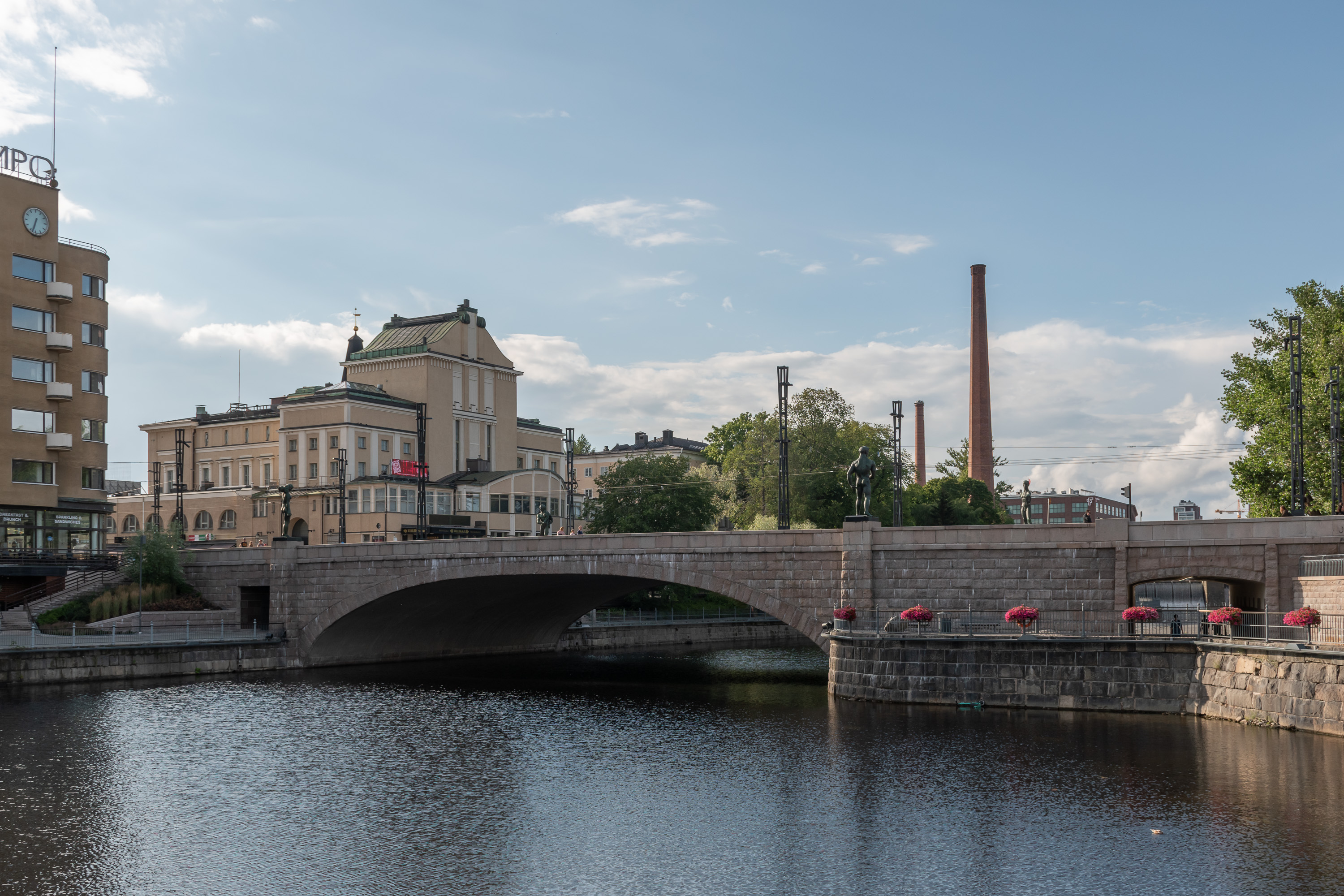 26. Совсем рядом с Центральной площадью течет Таммеркоски, а улица Хямеэнкату пересекает ее по мосту Хямеэнсилта (Hämeensilta). Мост на этом месте существовал минимум с 16 века, на тракте из Хямеэнлиннского замка в провинцию Сатакунта, а в 1929 году построен мост современного облика, железобетонный, облицованный гранитом и украшенный четырьмя статуями биркарлов (pirkkalaiset — зажиточные финские крестьяне, которым в Средние века шведский король даровал право жить в Лапландии и облагать там данью местных саамов — традиционно полагалось, что родом они были из волости Пирккала рядом с современным Тампере, хотя в наши дни такая версия считается маловероятной). Все статуи разные: Охотник, Сборщик дани, Купец и Дева-Финляндия. К 21 веку ресурс старого моста стал подходить к концу, и одновременно со строительством трамвая и реконструкцией улицы Хямеэнкату мост был снесен и перестроен с нуля (по очереди сначала южная, потом северная половина) в 2019 году. Всю облицовку и статуи разобрали и потом поставили обратно, новый мост по габаритам практически совпадает со старым, так что его облик полностью сохранился.
