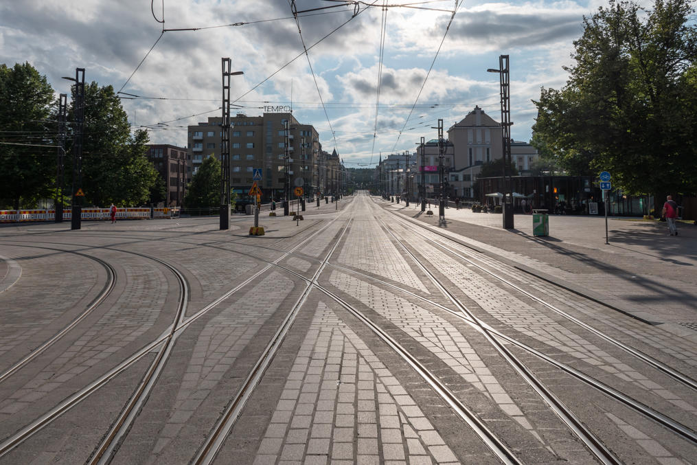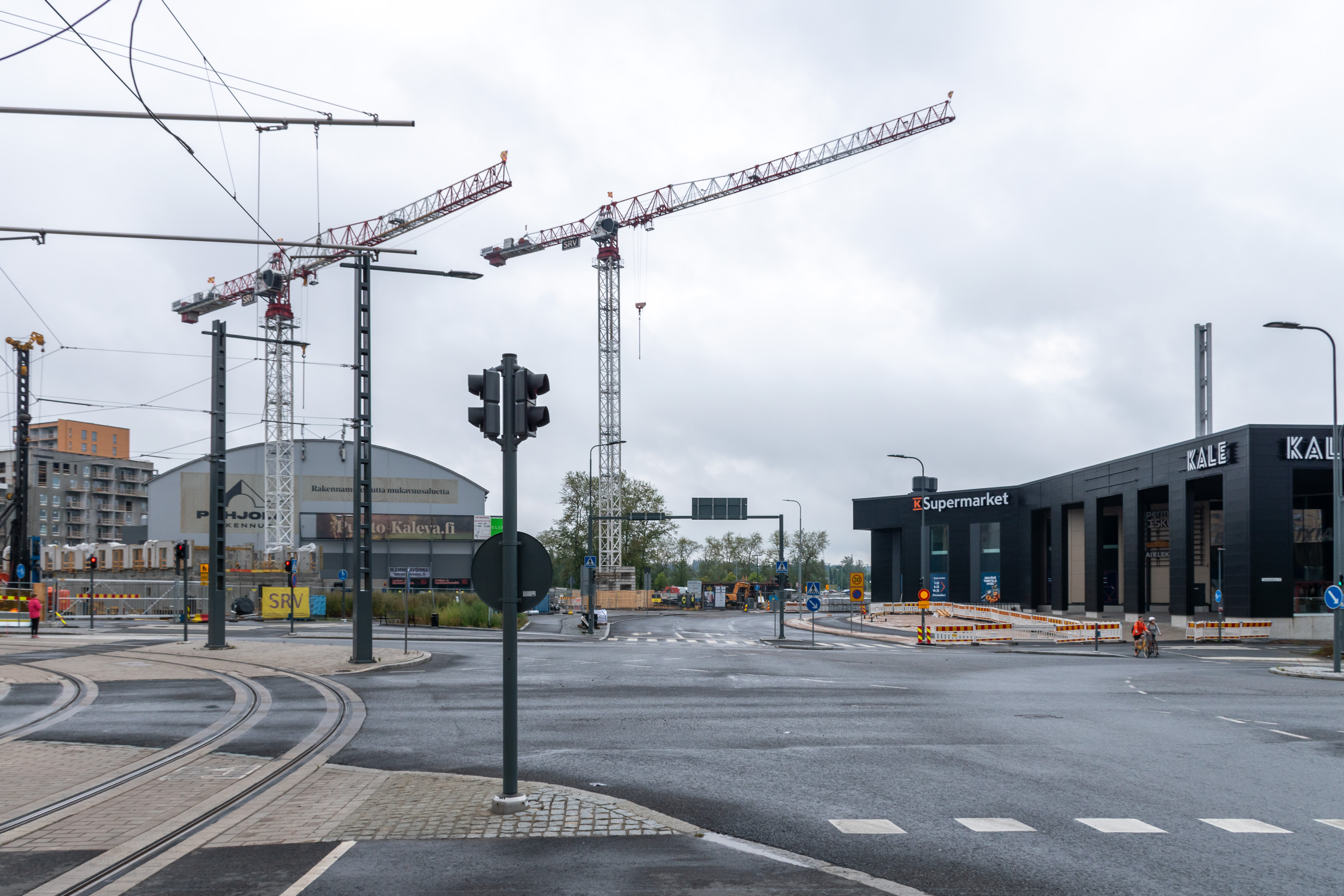 44. Дальше трамвайные пути поворачивают на юг. Здесь в конце Саммонкату как раз идет уплотнительная застройка — вместо достаточно пустого пространства, где кроме большого мебельного магазина особо ничего не было, строят квартал жилых многоэтажек.