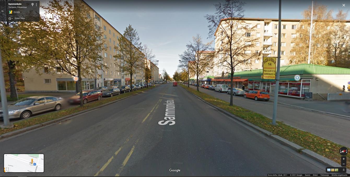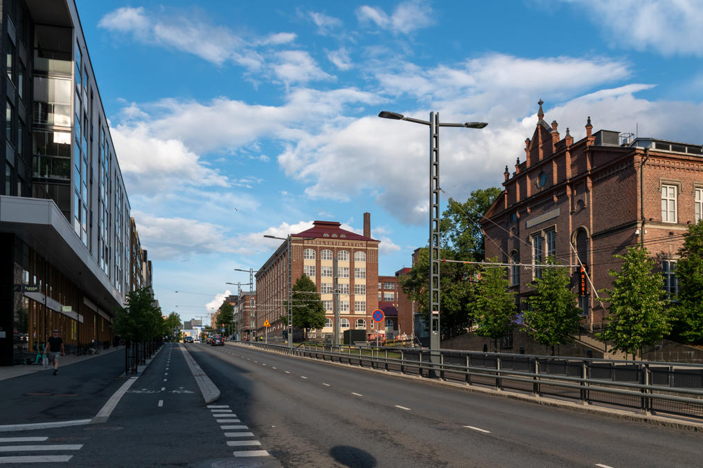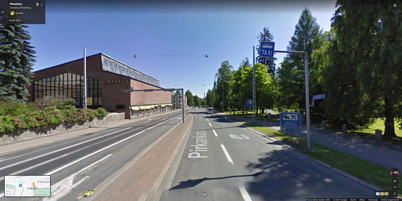 13. От конечной отправляемся на восток по улице Пирканкату (Pirkankatu). Когда-то это был главный выезд из города на запад, и он назывался Пирккальским шоссе (Pirkkalan valtatie) — в честь волости Пирккала к западу от Тампере. Сейчас основной выезд из центра на запад для автомобилей другой, улица Паасикивенкату (Paasikivenkatu, фин. улица Паасикиви, в честь президента Финляндии в 1946-1956).