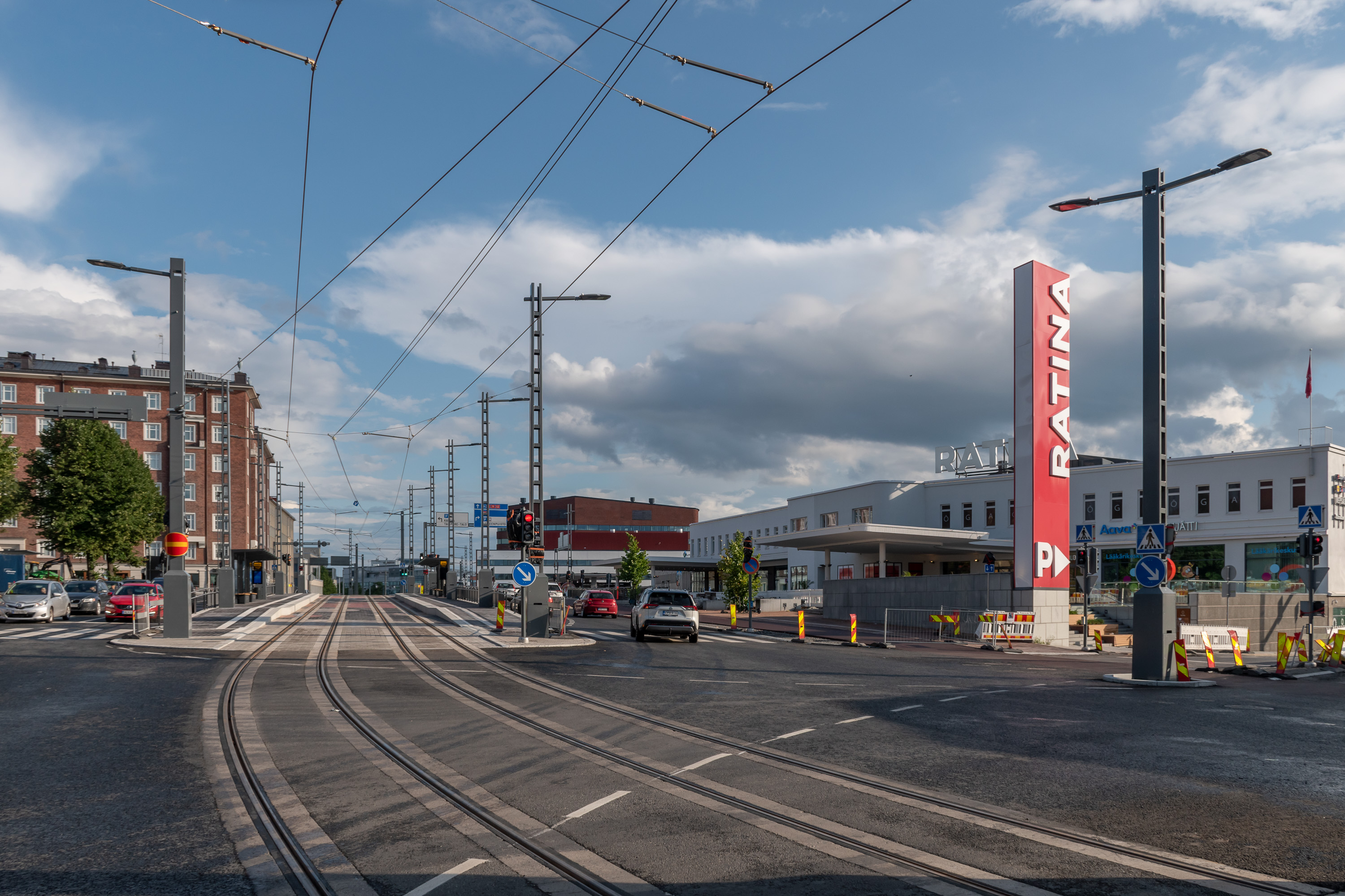78. Трамвайная конечная будет зваться Sorin aukio — Соринская площадь — так это место называется. Справа виден ТЦ Ratina, точнее, один из его корпусов, большая часть его находится за автовокзалом. Ужасно запутанный ТЦ, зато крупнейший в городе. Открыт в 2018 году. Ратина — старое название этой части центра, за Таммеркоски к юго-востоку.