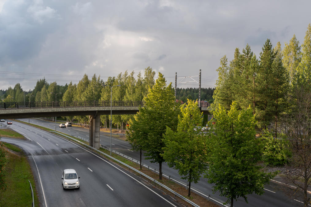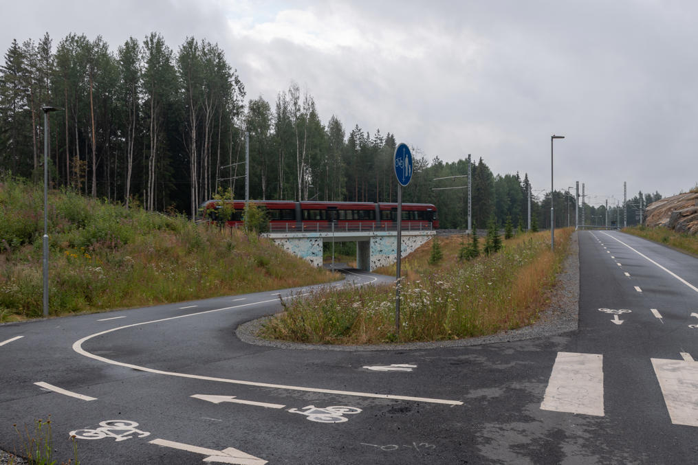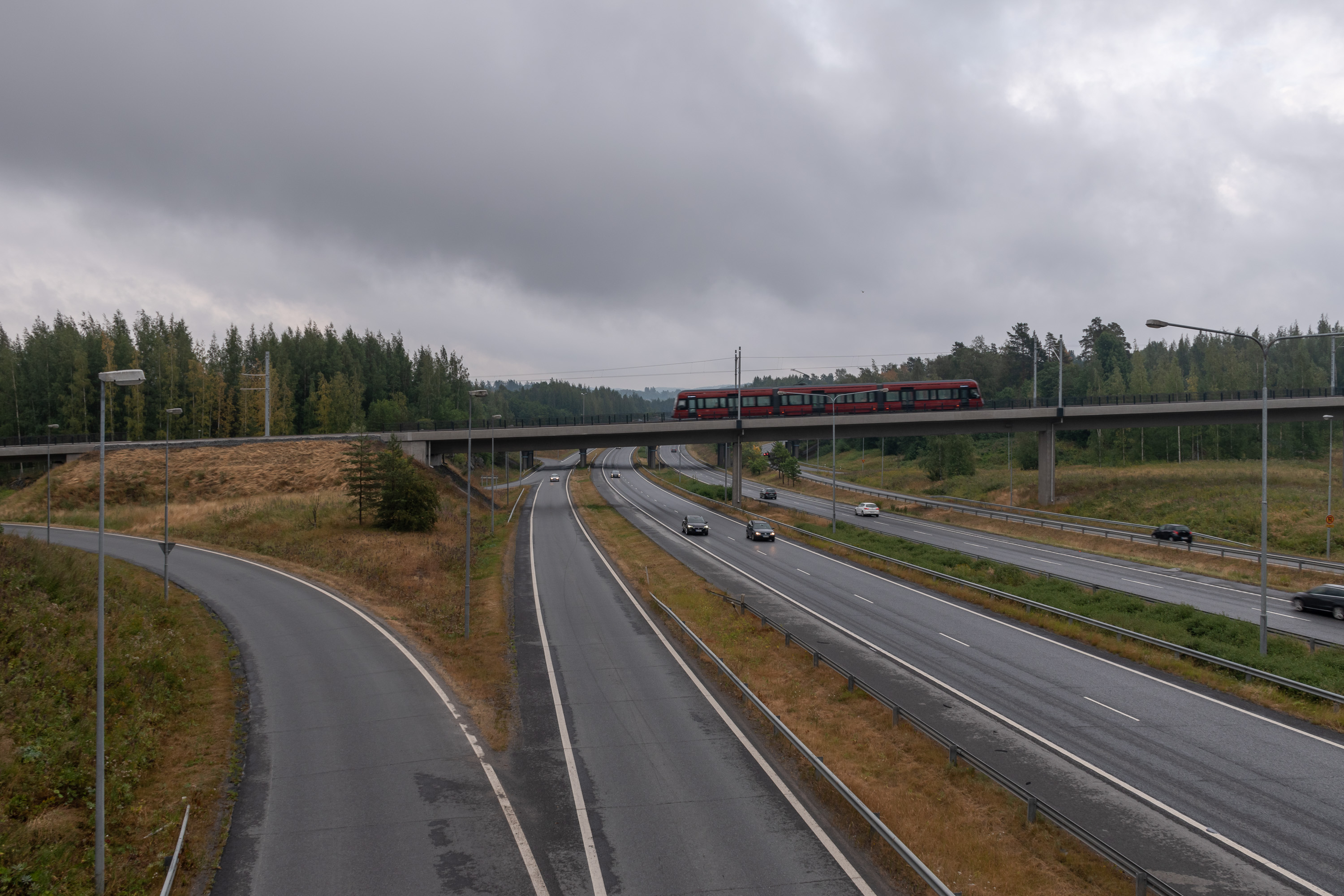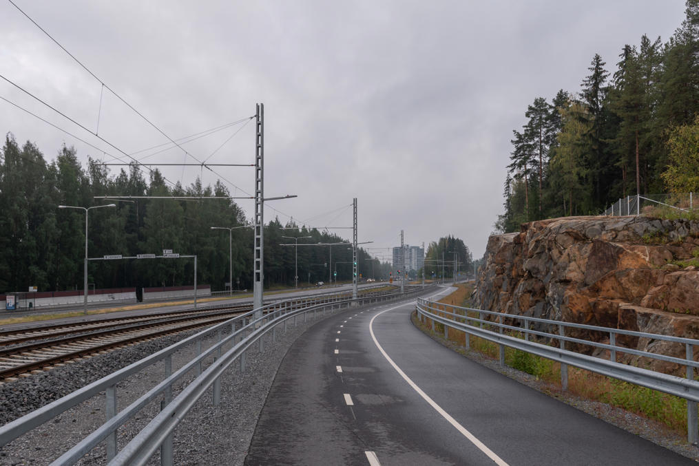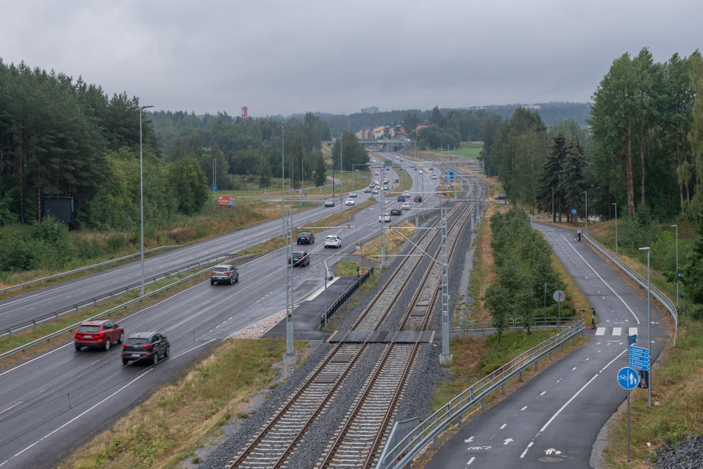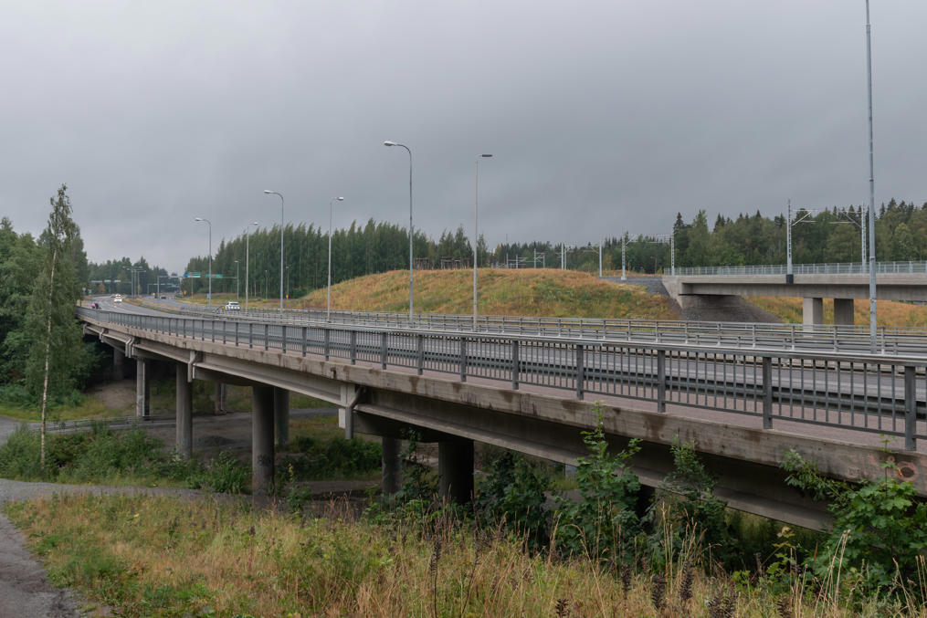 52. Ну а дальше мы пересекаем объездную дорогу Тампере. Трамвайный мост переброшен прямо над съездами развязки кольцевой и Хервантской магистрали, а пешеходный мост, с которого сделано фото, существовал уже задолго до трамвая. Тамперская кольцевая дорога (Tampereen kehätie) длиной 30 км, на самом деле полукольцевая, проходит на западе также через территорию пригородов Пирккала, Нокиа и Юлёярви, и с 2009 года является полноценной автомагистралью в 2+2 полосы на всем протяжении. Формально ее западная половина является частью Национальной трассы 3 Хельсинки — Тампере — Вааса, а восточная (на фото) — Национальной трассы 9 Турку — Тампере — Ювяскюля — Куопио — Йоэнсуу.