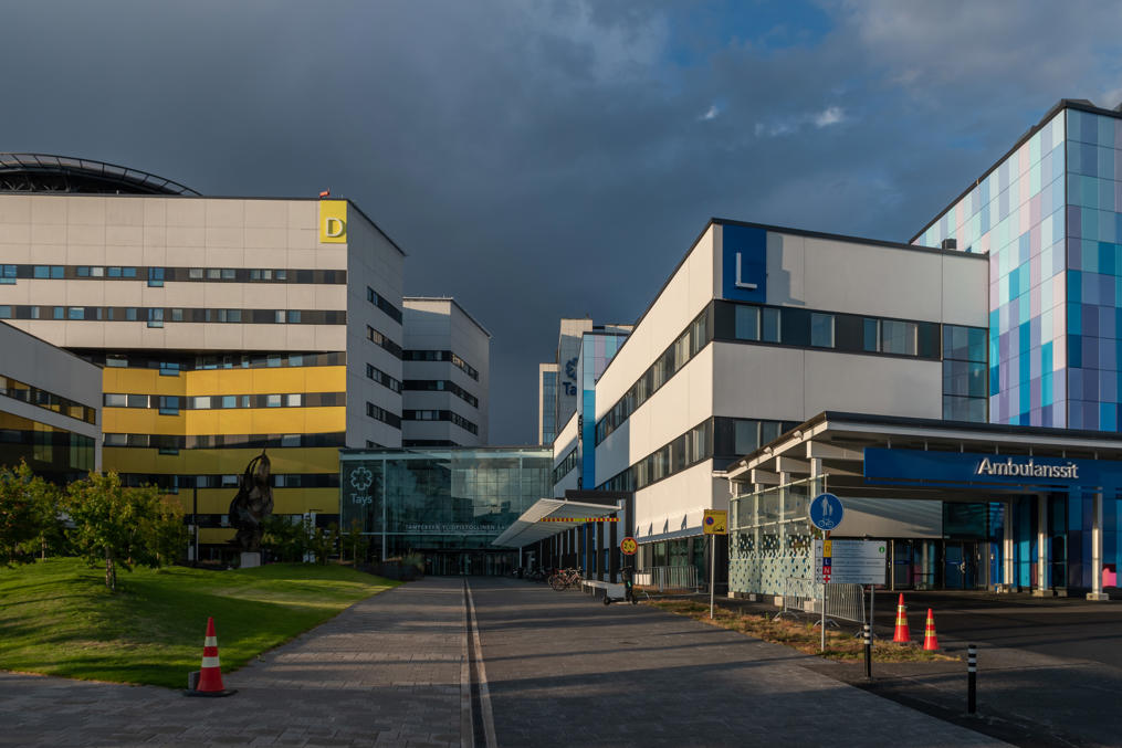 Центральная больница, на фото, состоит из множества корпусов; здесь имеется более тысячи койкомест, и работает более четырех тысяч человек персонала. Больница существует на этом месте, в районе Кауппи, с 1962 года, но продолжает реконструироваться и расширяться до сих пор. На фото площадь Жизни (Elämanaukio) перед главным входом и несколько из корпусов TAYS; слева на крыше видна вертолетная площадка.