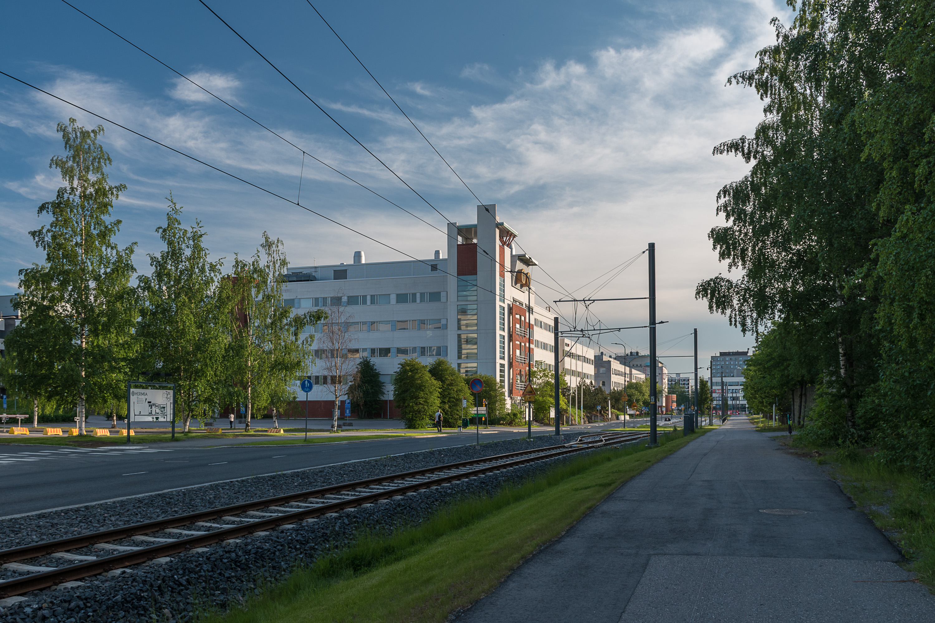 66. Остановка Hervannan kampus (Хервантский кампус). Херванта изначально строилась вокруг Тамперского технического университета (TTY), который объединился с просто Тамперским университетом в 2019 году. Здесь остаются тем не менее технические факультеты, а гуманитарные, старого Тамперского университета — на кампусе в центре города. Сам университет от трамвая не видно, впрочем, к нему нужно пройти несколько сот метров мимо бизнес-центра на фото.