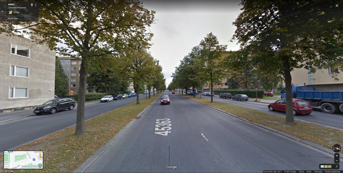 89. До трамвая улица имела похожую конфигурацию на Саммонкату, две полосы в центре, и два кармана, отделенные от них зелеными полосами. Однако если погулять по гуглопанорамам и старым спутником снимкам, становится видно, что если на Саммонкату карманы были чисто парковочные, то тут на Тейсконтие они служили полноценными полосами движения. Получается, была еще более необычная конфигурация улицы, 1+1+1+1 полоса. 2+2 полосы для машин в итоге сумели сохранить и тут.