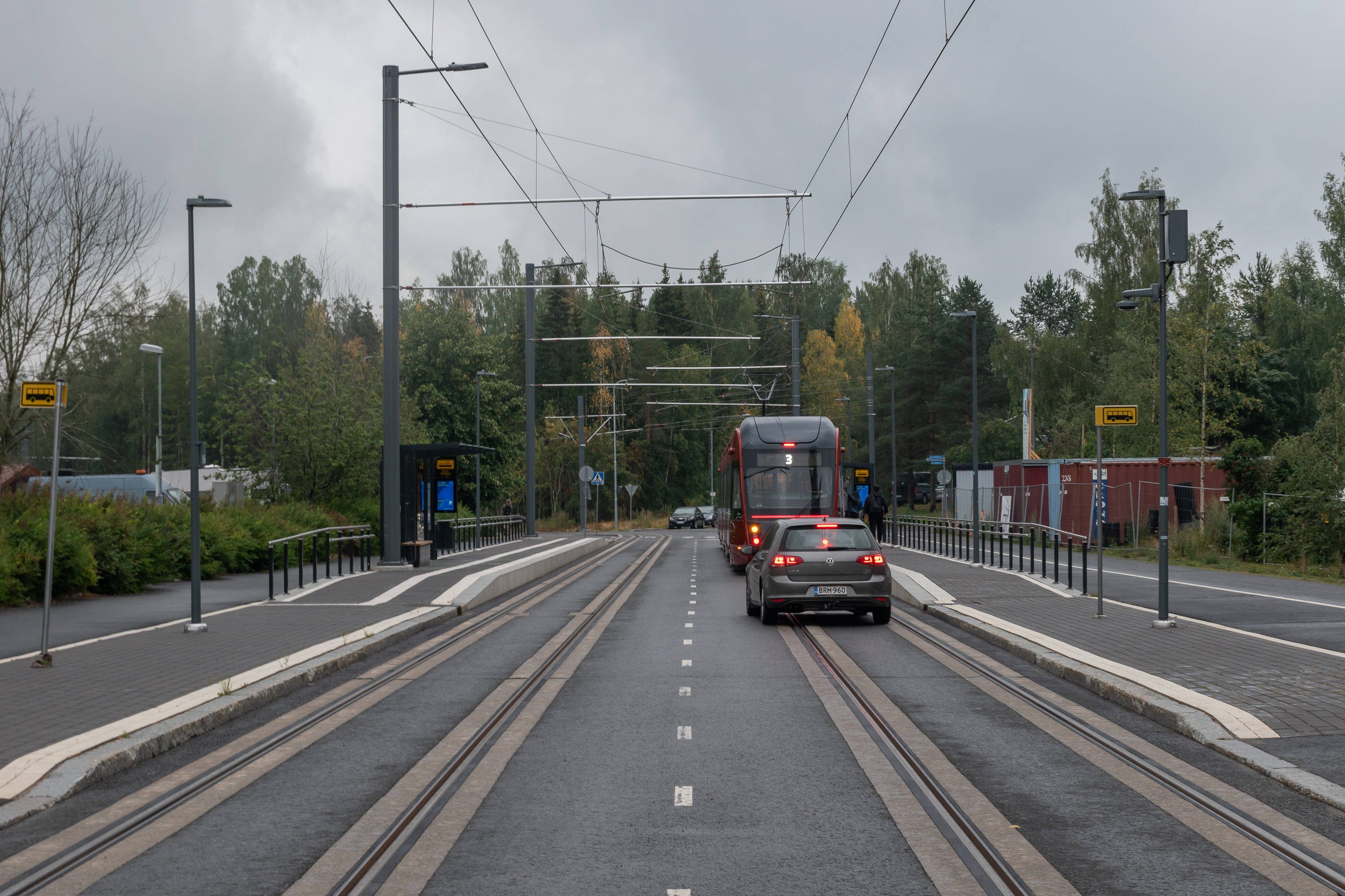 70. От депо возвращаемся обратно к главной линии, которая уже скоро закончится. Остановка Etelä-Hervanta (Южная Херванта). Совмещенка: машина ждет, когда трамвай отъедет от остановки. Формально его объехать вроде бы ничего не запрещает, кроме здравого смысла, конечно.