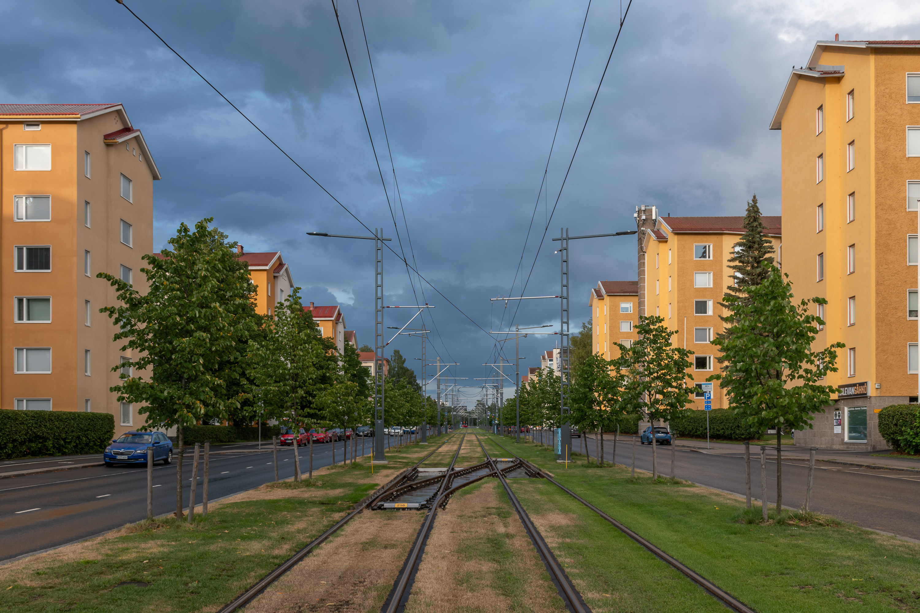 46. Трамвай огибает гипермаркеты по дуге, по улице Риевякату (Rieväkatu, в честь традиционного тамперского сорта хлеба из ячменя, зовущегося rievä). Здесь уже все строго функционально, без газонов на выделенке. Лесистая возвышенность слева — это гряда Калеванкангас. Это одна из очень длинной цепочки моренных гряд, которые к западу от центра Тампере, в частности, и образуют узкий перешеек между двумя большими озерами. Цепочка тянется на сотни километров с юго-востока на северо-запад, и по ней с доисторических времен и проходил упоминавшийся древний тракт — в старые времена финны предпочитали перемещаться либо по воде, либо по таким грядам, которые были сухими, относительно легкопроходимыми, да еще и заблудиться на них было сложно. Для строительства трамвая склон гряды с этой стороны пришлось немножко срыть.