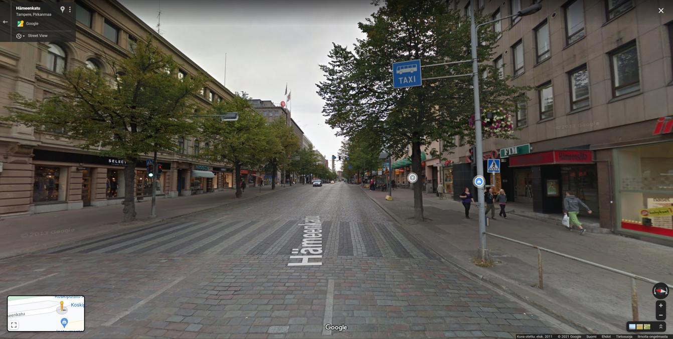 37. Остановка Kaleva. На улице много всякого мелкого бизнеса — магазинчики, бары, парикмахерские и прочее — они видны с обеих сторон. Еще видны таблички у знаков парковки: по всей улице в дневное время (кроме воскресений) парковка разрешена не более чем на 2 ч.